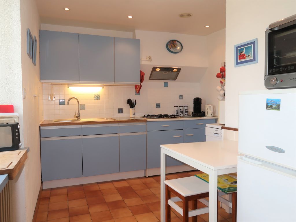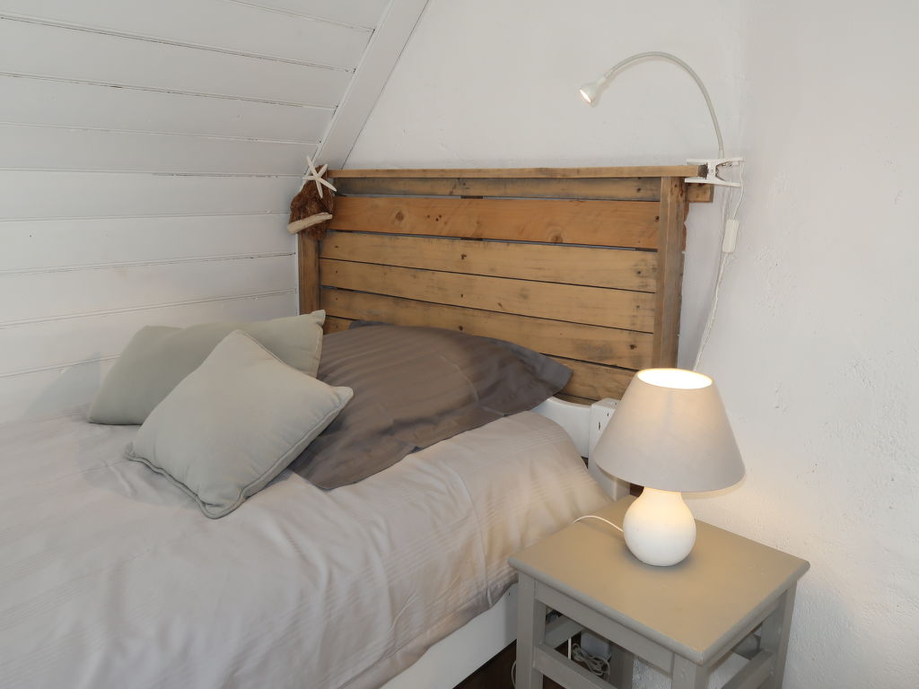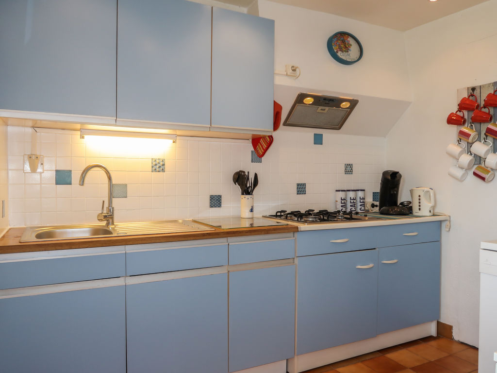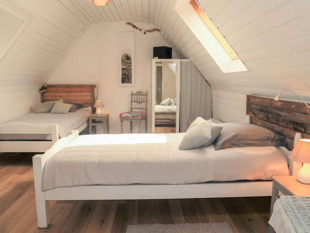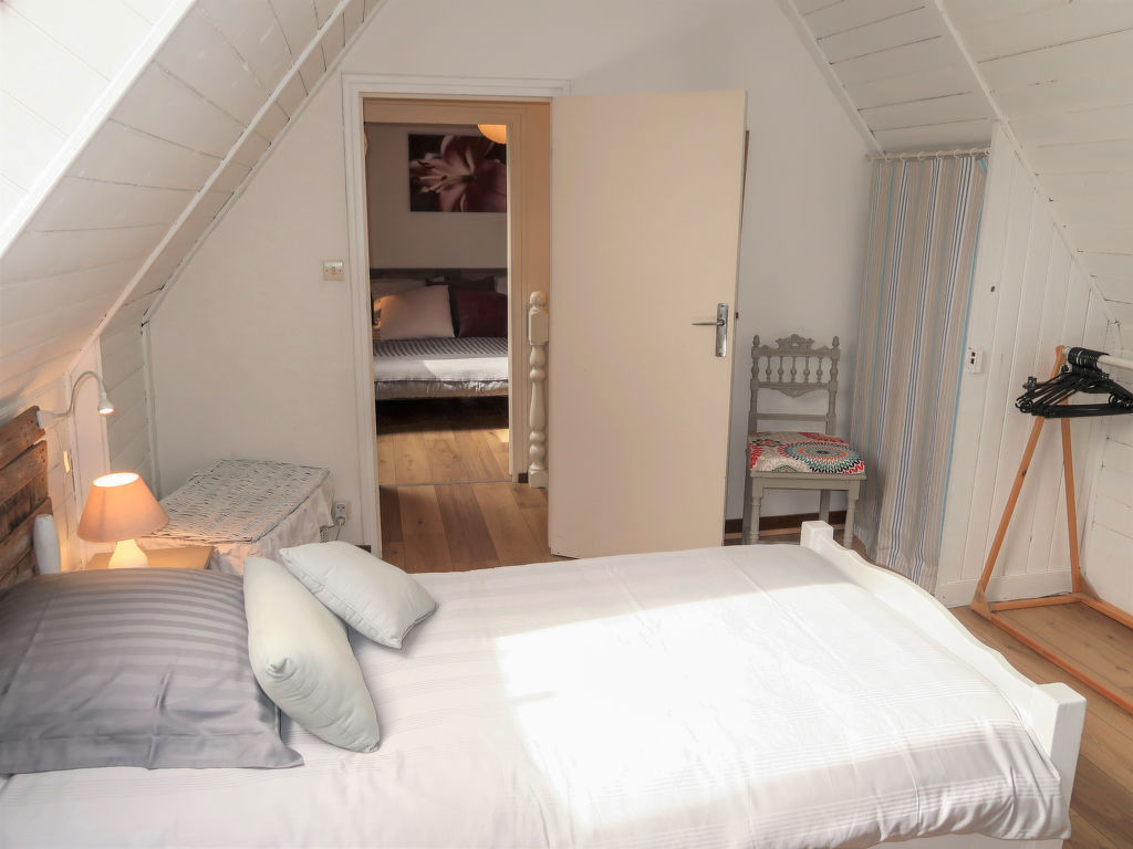 3-Zimmer-Haus, 2 Etagen, ca. 70 m². Erdgeschoss: Diele. Wohnraum mit Sitzgruppe, Kaminofen, Essplatz und Gartenausgang. Küche (4 Flammen, Minibackofen, Mikrowelle, Geschirrspüler, Kühl-/Gefrierkombination, Kaffeemaschine, Wasserkocher, Toaster) mit Essplatz für 2 Personen (2 Hocker). Dusche. Sep.WC. Vom Wohnraum Treppe ins Obergeschoss (Dachschräge): Zweibettzimmer. Schlafzimmer mit Doppelbett. Inserat einer Privatperson nach Artikel 155, IV, CGI.