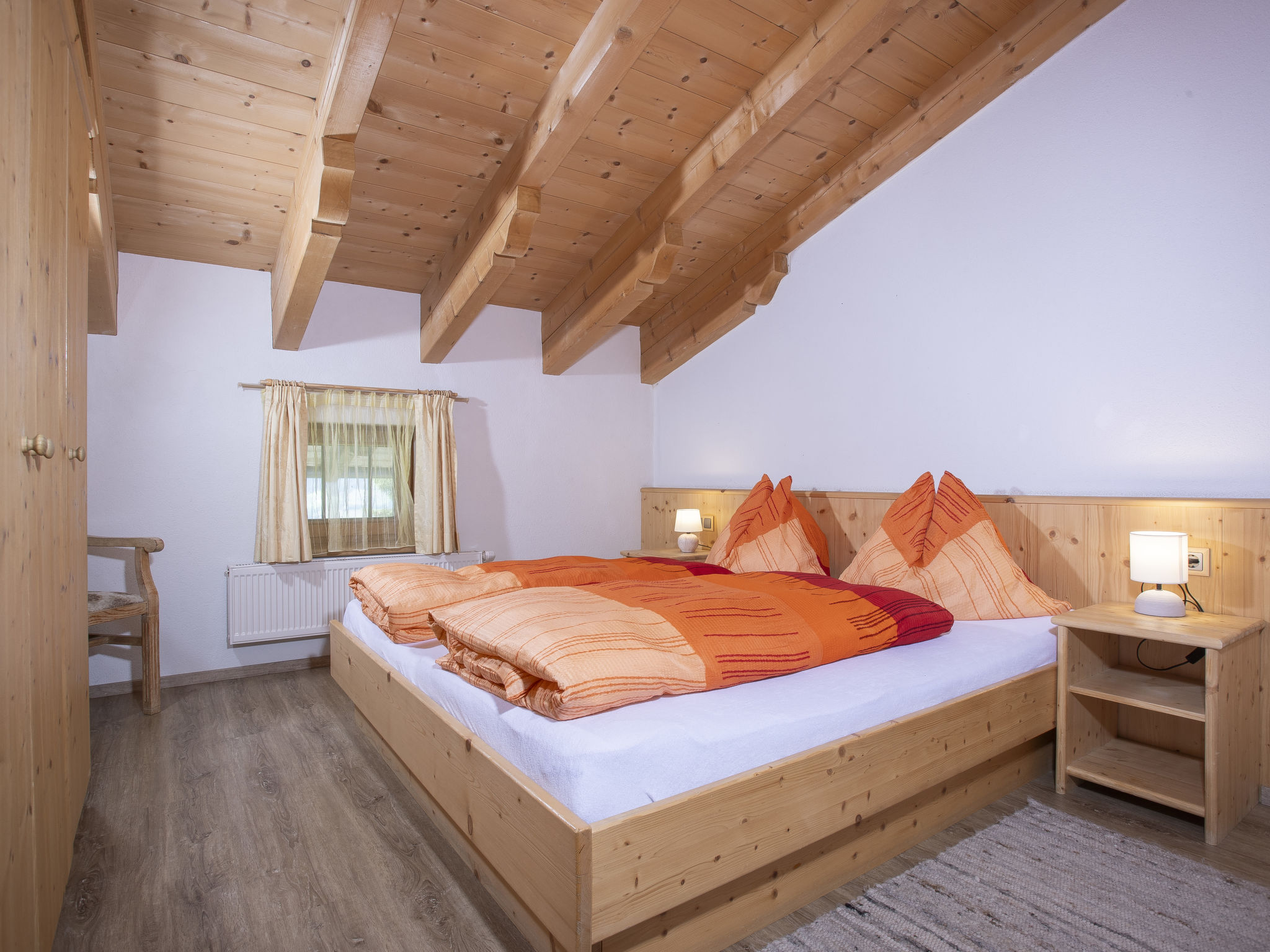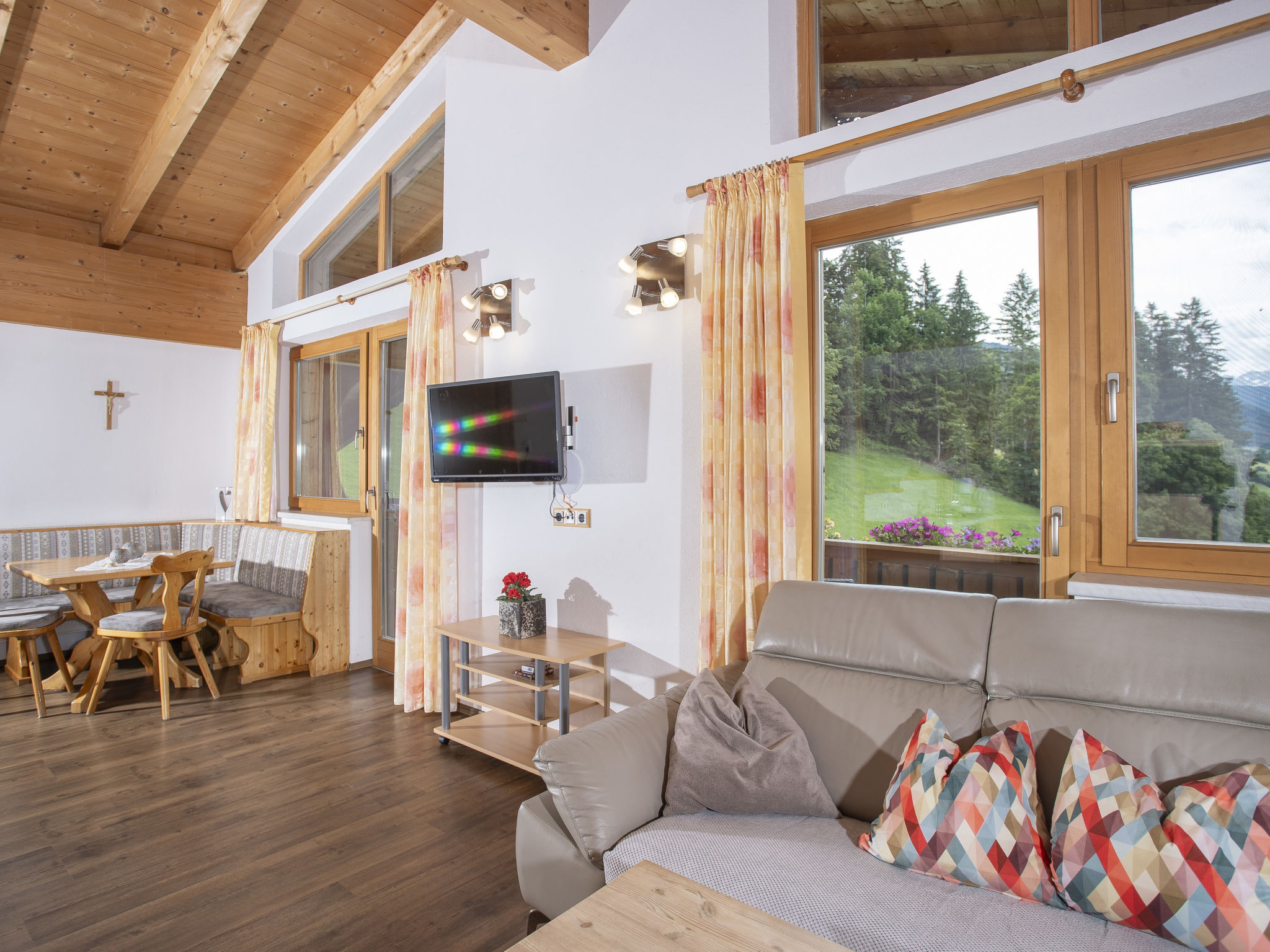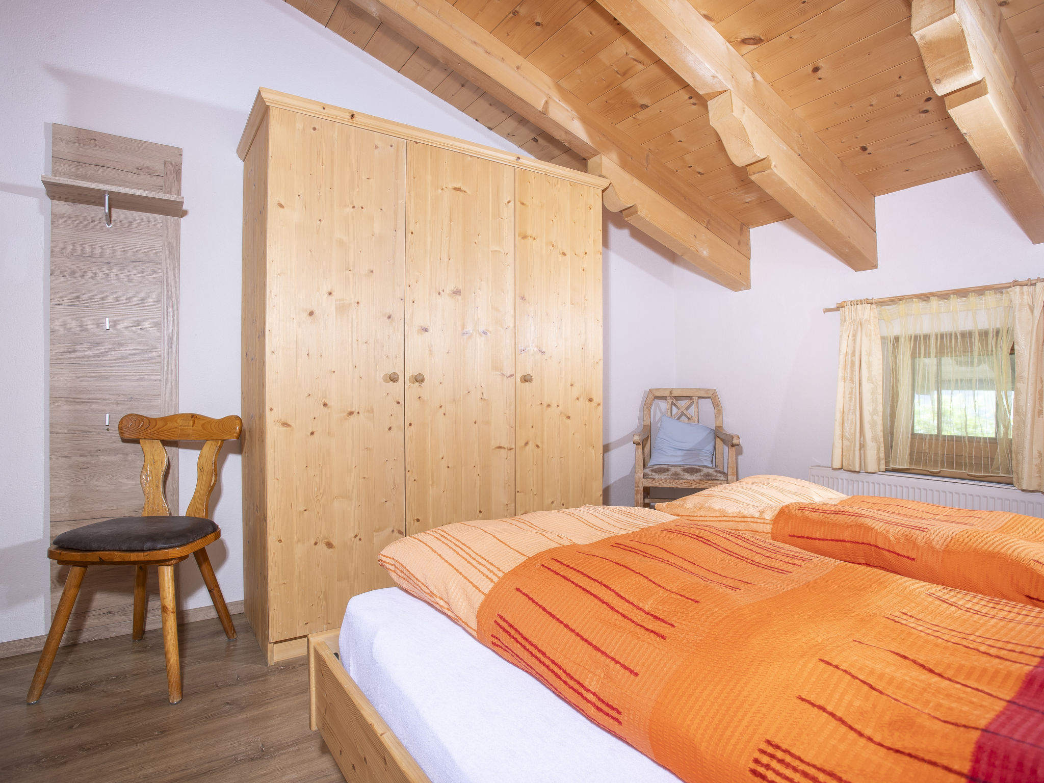 7-Zimmer-Wohnung 180 m2, im Dachgeschoss. Geräumig, komfortabel und geschmackvoll eingerichtet: Eingang. Grosses Wohn-/Esszimmer mit Essecke und Sat-TV. Ausgang zum Balkon. 5 Doppelzimmer. 1 Zimmer mit 2 Doppelbetten. Offene Küche (Backofen, Geschirrspüler, 4 Glaskeramikherd Platten, Mikrowelle). Bad/Dusche, Dusche, 2 sep. WC's. Holzböden. Komfortable Einrichtung im Landhausstil. Balkon. Balkonmöbel. Herrliche Panoramasicht auf die Berge und die Landschaft. Zur Verfügung: Internet (Wireless LAN, gratis). Hohe Raumhöhe, Sichtdachstuhl.