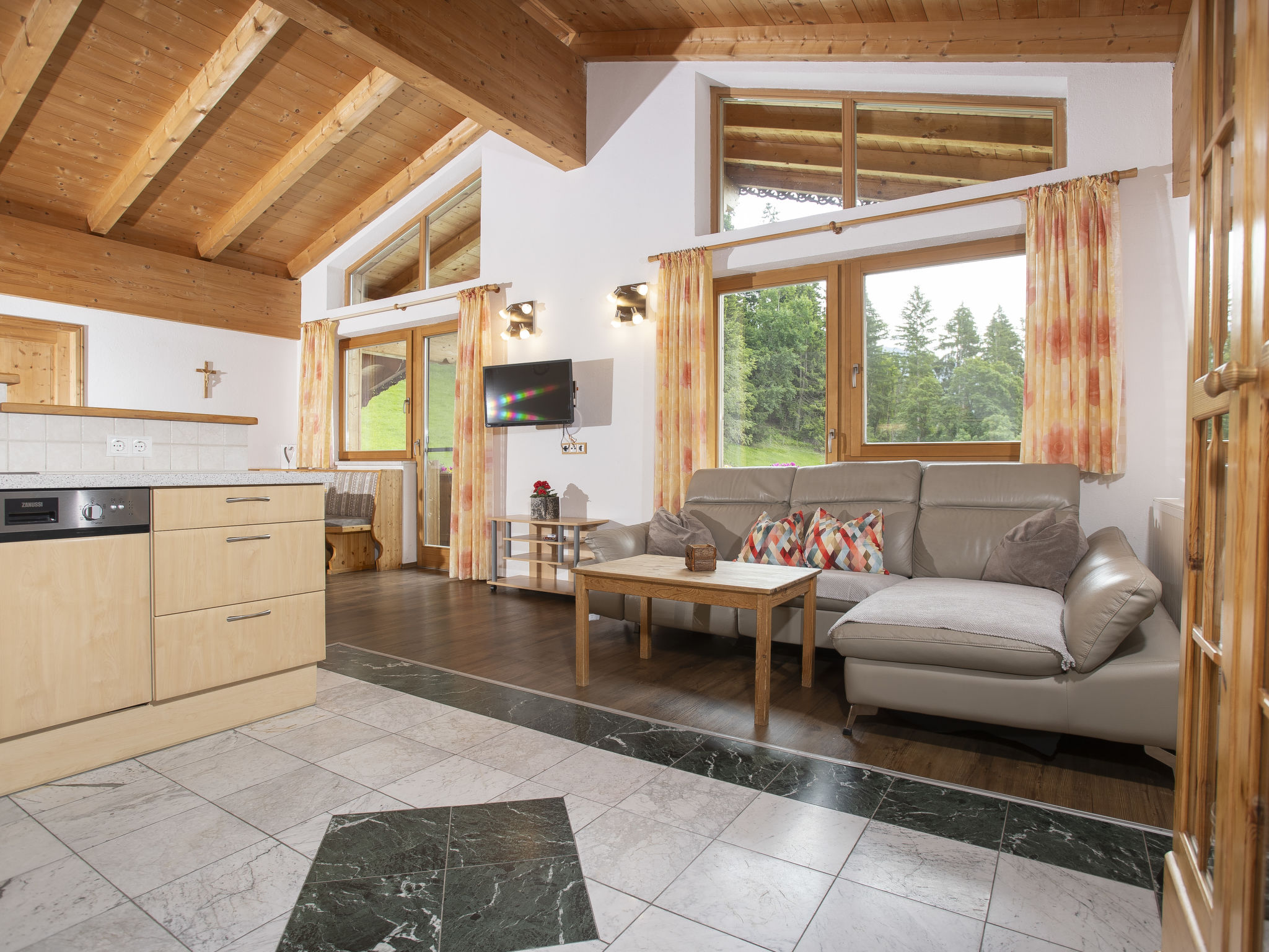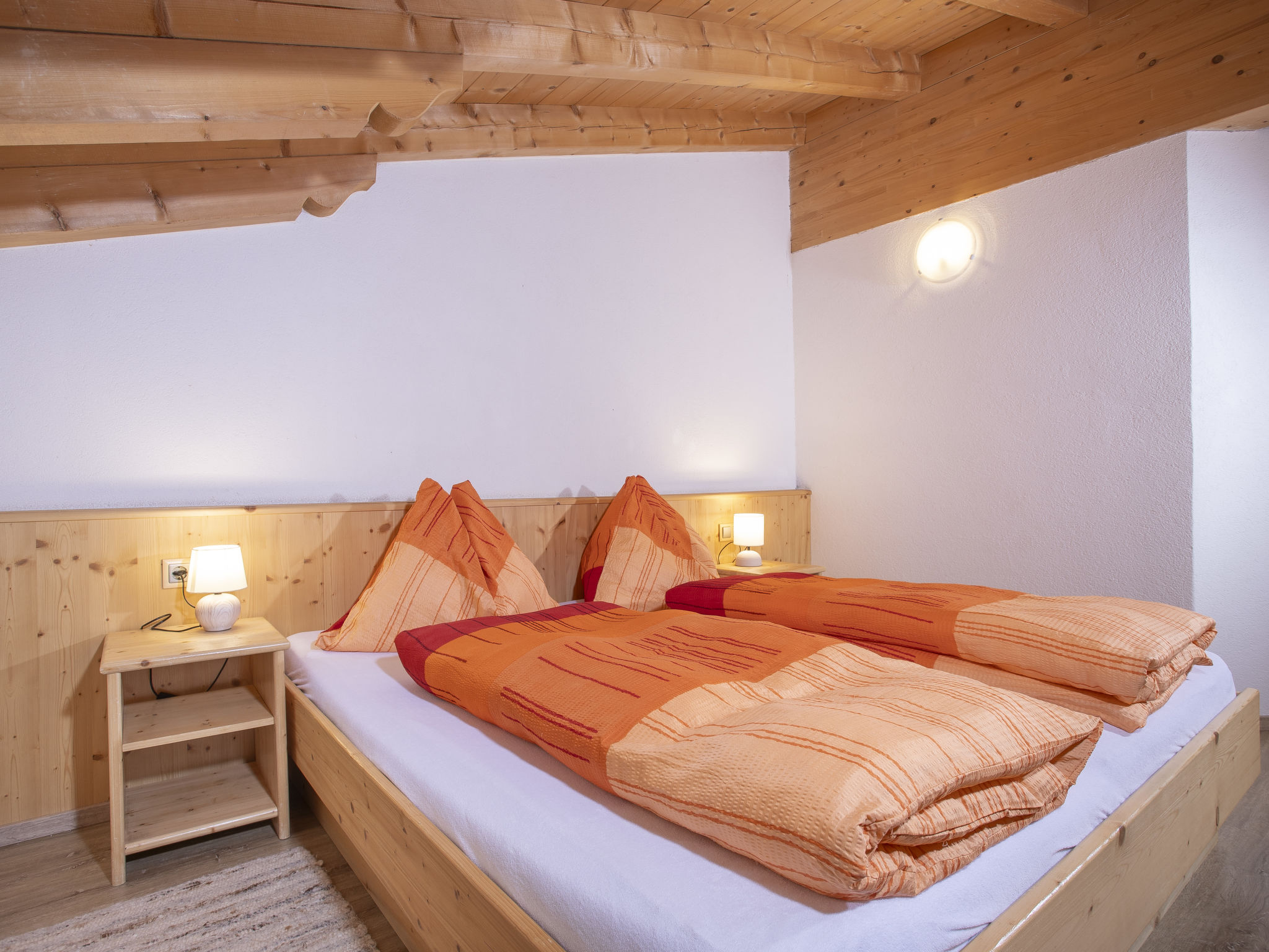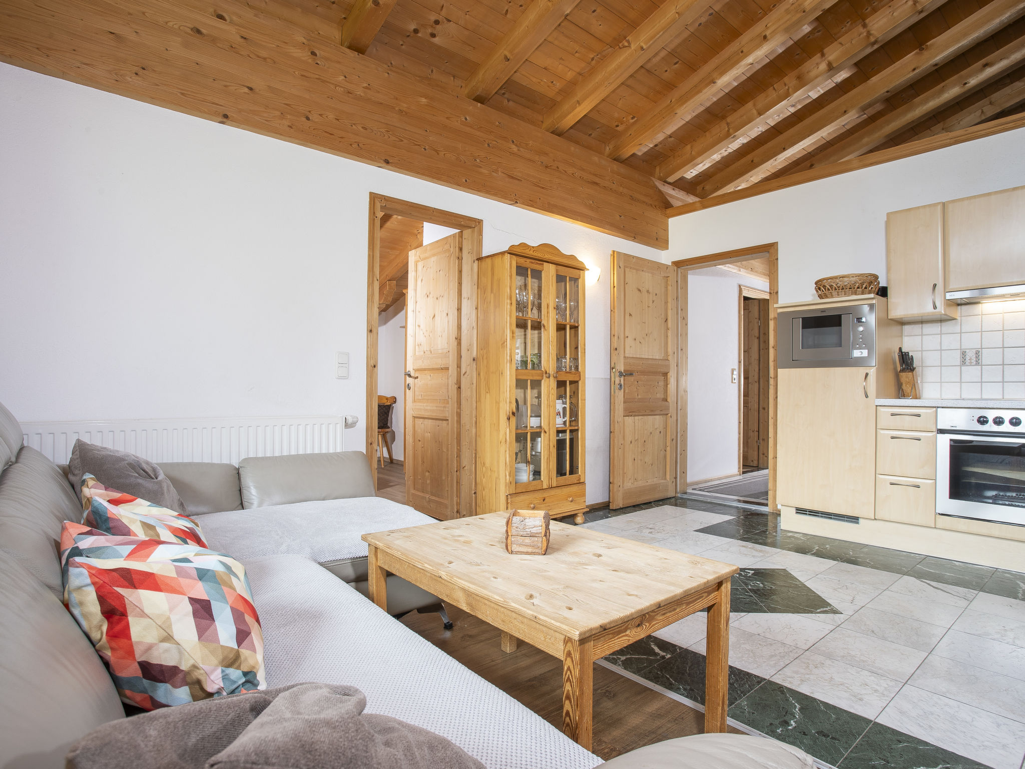 7-Zimmer-Wohnung 180 m2, im Dachgeschoss. Geräumig, komfortabel und geschmackvoll eingerichtet: Eingang. Grosses Wohn-/Esszimmer mit Essecke und Sat-TV. Ausgang zum Balkon. 5 Doppelzimmer. 1 Zimmer mit 2 Doppelbetten. Offene Küche (Backofen, Geschirrspüler, 4 Glaskeramikherd Platten, Mikrowelle). Bad/Dusche, Dusche, 2 sep. WC's. Holzböden. Komfortable Einrichtung im Landhausstil. Balkon. Balkonmöbel. Herrliche Panoramasicht auf die Berge und die Landschaft. Zur Verfügung: Internet (Wireless LAN, gratis). Hohe Raumhöhe, Sichtdachstuhl.