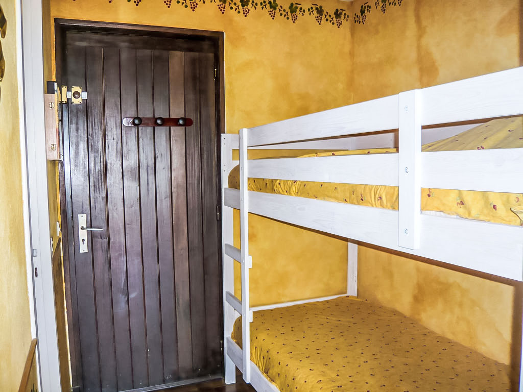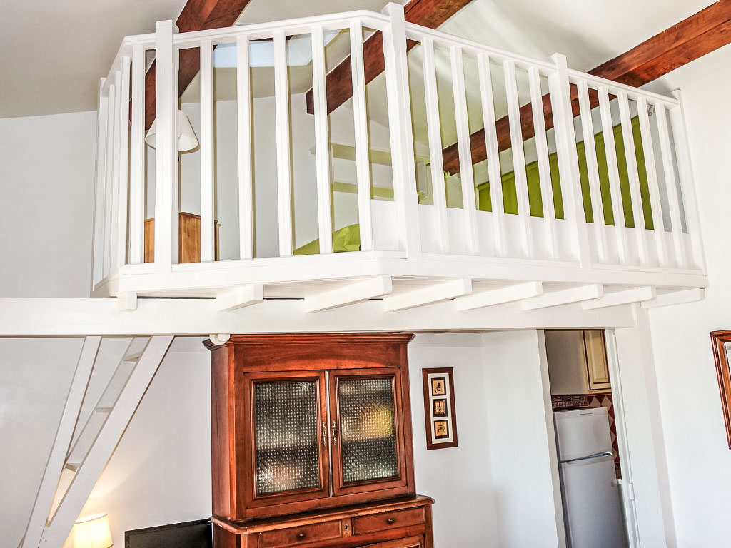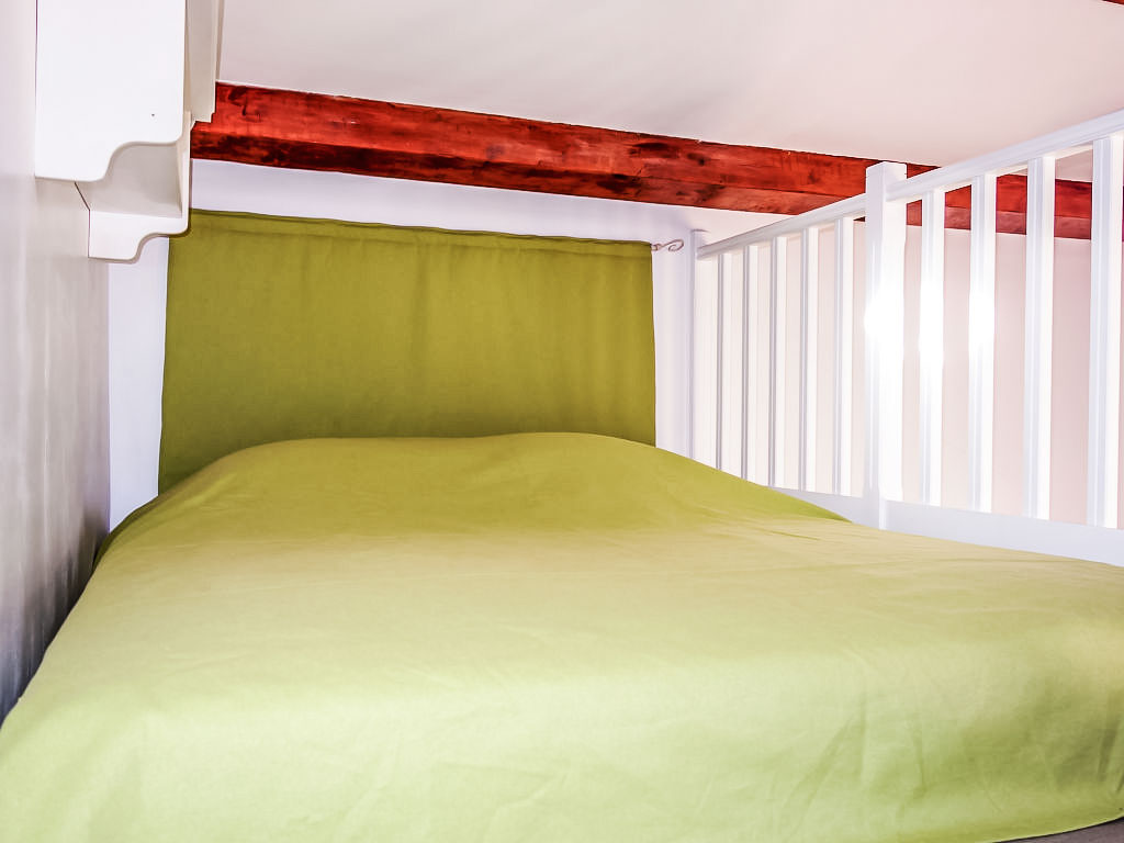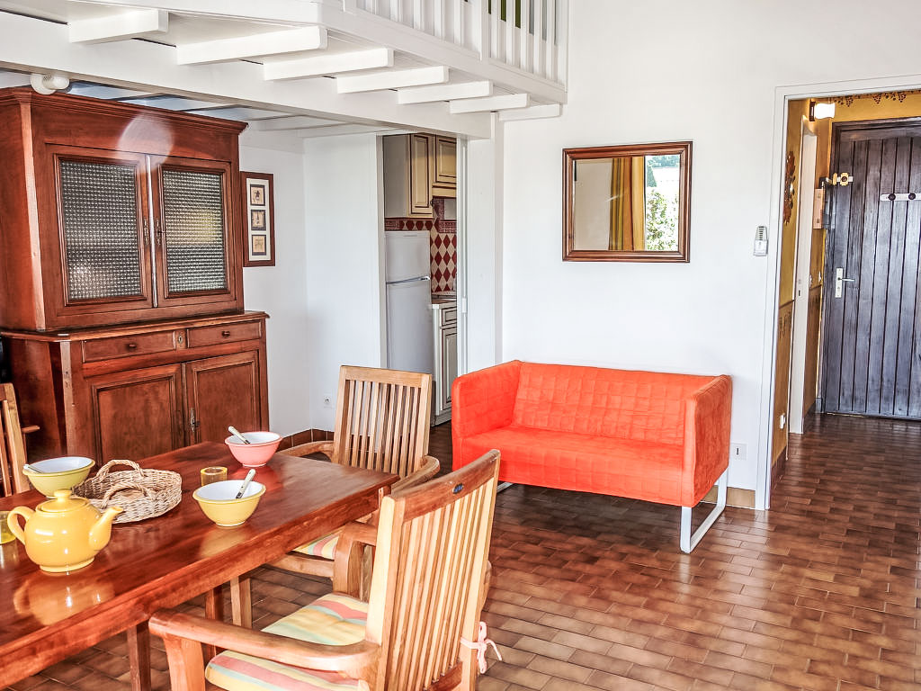 1-Zimmer-Reihenhaus 29 m2 auf 2 Stockwerken. Schön eingerichtet: Eingang, ohne Fenster mit 1 x 2 Etagenbetten (90 cm, Länge 200 cm). Wohn-/Esszimmer mit TV. Ausgang zum Garten, zur Terrasse. Galerie abgeschrägtes, offenes kleines, Deckenhöhe 125 - 157 cm mit Dachfenster mit 1 franz. Bett (160 cm, Länge 200 cm). Küche (Mini-Backofen, Geschirrspüler, 2 Glaskeramikherd Platten, Toaster, Tiefkühler, elektrische Kaffeemaschine). Dusche/WC. E-Heizung. Terrasse 10 m2, überdacht, Südlage, Gartensitzplatz 25 m2. Terrassenmöbel, Elektrogrill. Eingeschränkte Fernsicht auf das Meer. Zur Verfügung: Waschmaschine, Bügeleisen. Internet (Wireless LAN, extra). Parkplatz Nr. 28. Bitte beachten: Nichtraucher-Unterkunft. TV nur FR. Rauchmelder. Die Dachgalerie ist 4 m² groß. Inserat einer Privatperson nach Artikel 155, IV, CGI.