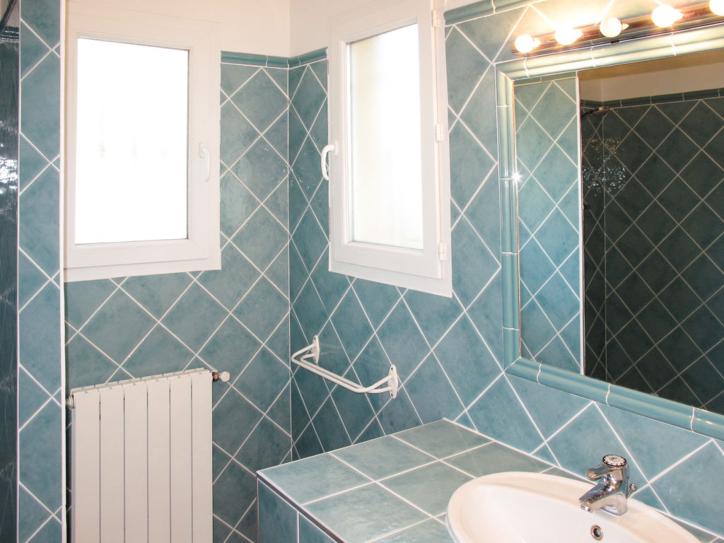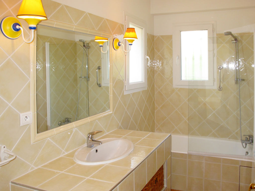 4-Zimmer-Haus, 2 Etagen, ca. 120 m². Erdgeschoss: Eingangsbereich. Großer Wohnraum mit Sitzgruppe, Kamin, Essplatz, Fenstertüren zur Terrasse. Küche (4 Ceranfelder, Backofen, Mikrowelle, Geschirrspüler, Kühl-/Gefrierkombination, Kaffeemaschine, Wasserkocher, Toaster), Terrassenausgang. Schlafzimmer mit franz. Bett (1,60 m breit), Bad, Terrassenausgang. Sep.WC. Obergeschoss: Zweibettzimmer mit Dusche und Ausgang zur Dachterrasse. Zweibettzimmer mit Bad und Ausgang zur Dachterrasse. Sep.WC. Hinweis: Bei Buchung zum Preis für 4 bzw. 2 Personen bleibt 1 bzw. bleiben 2 Schlafzimmer verschlossen. Inserat eines gewerblichen Vermieters nach Artikel 155, IV, CGI