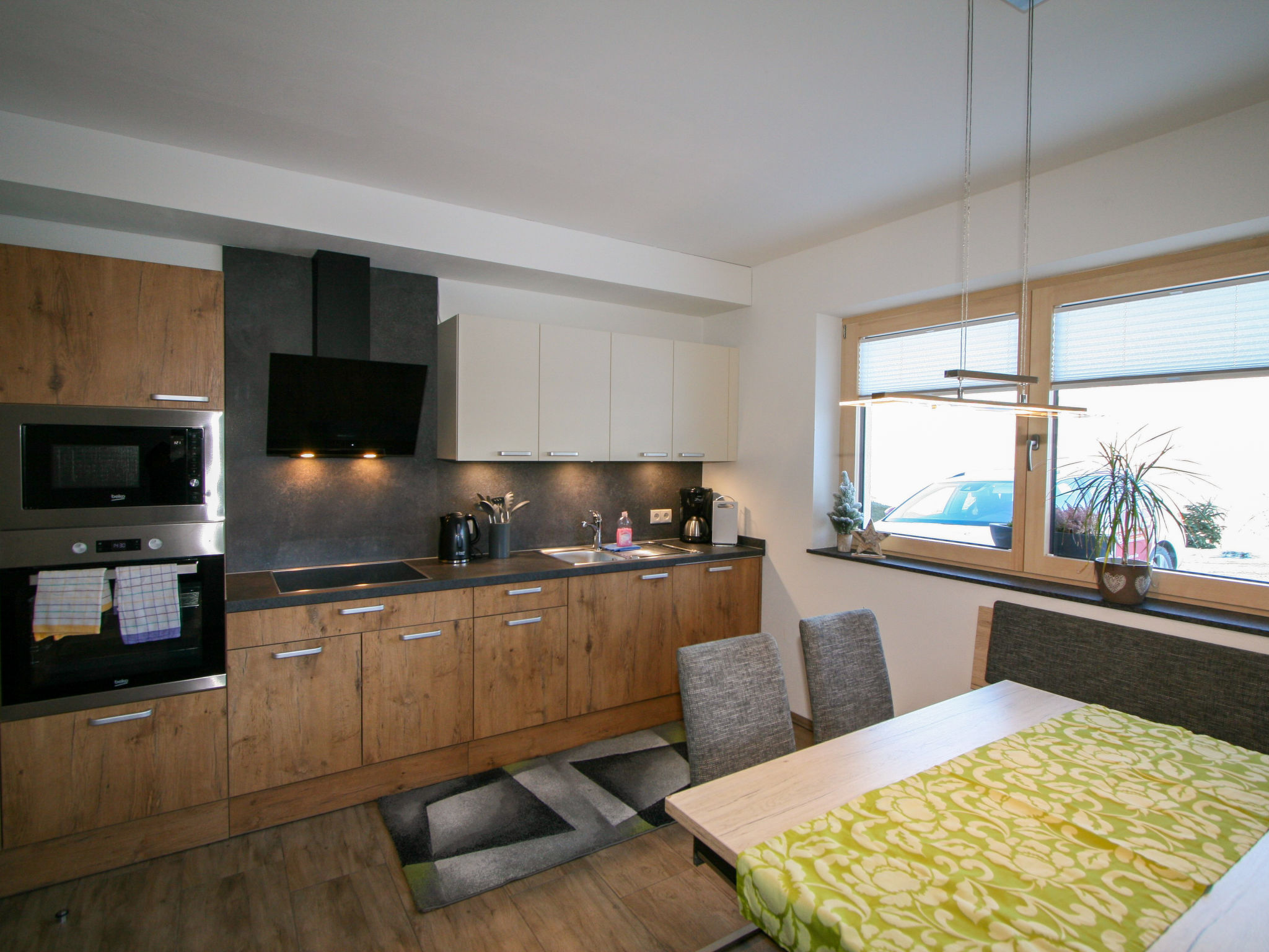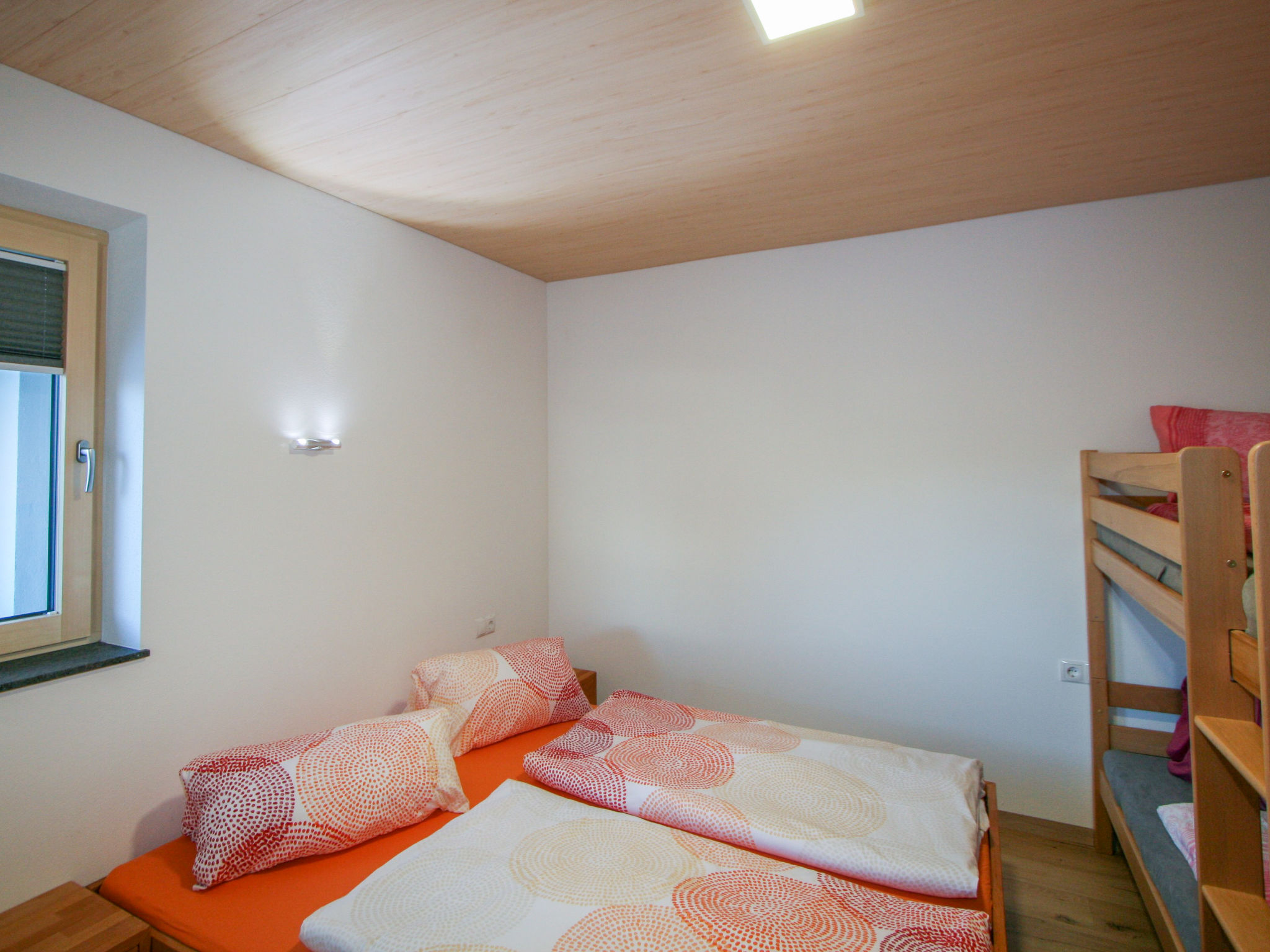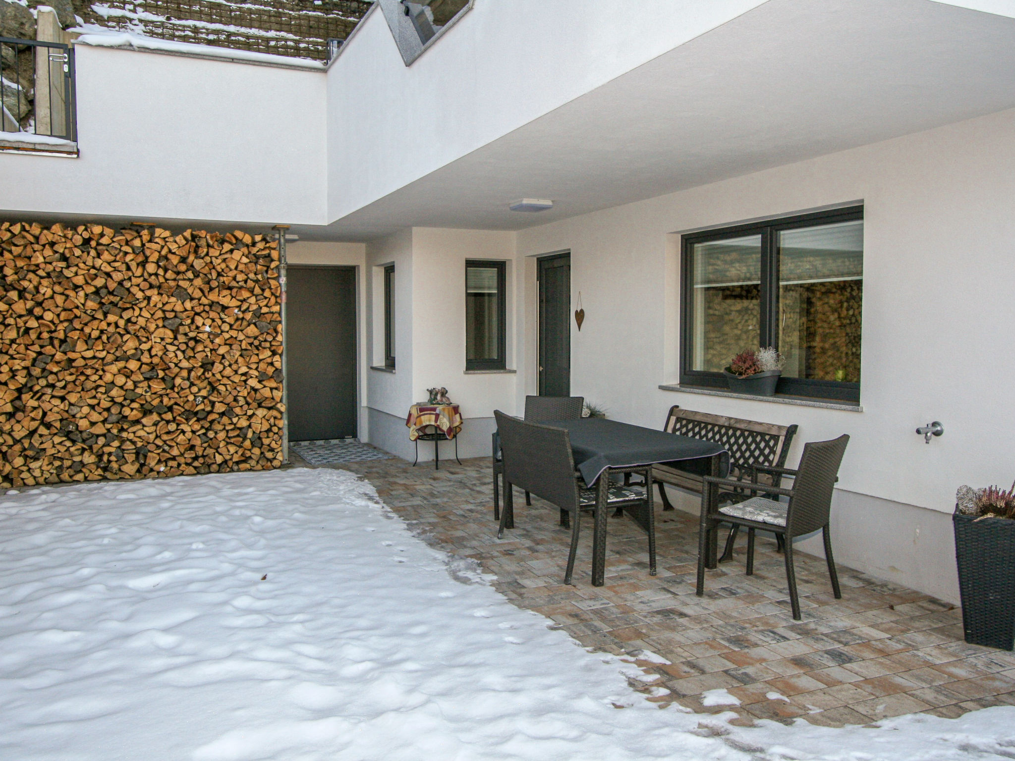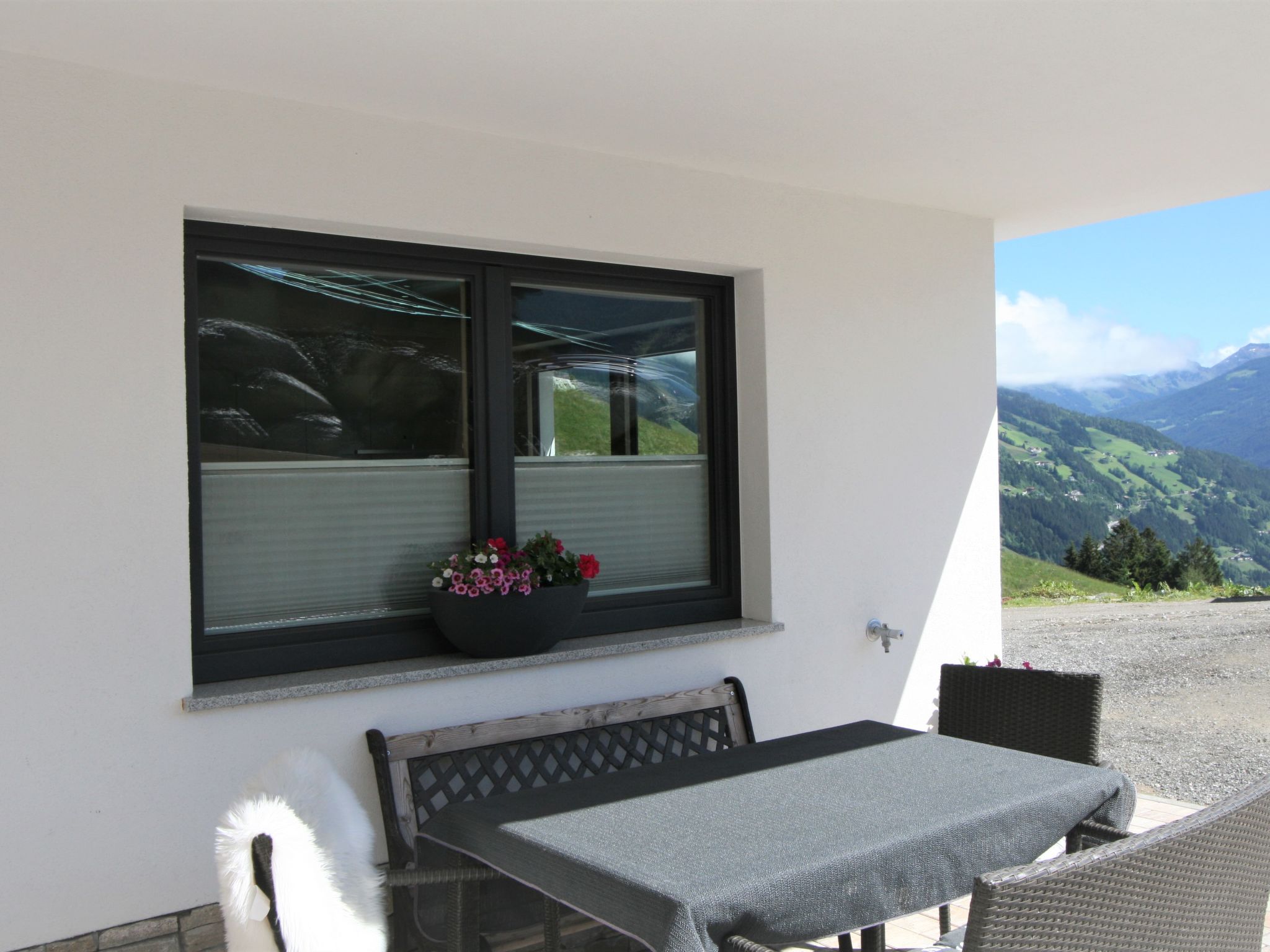 3-Zimmer-Wohnung 67 m2, im Erdgeschoss. Modern und gemütlich eingerichtet: Eingang. 1 Doppelzimmer. 1 Zimmer mit 1 x 2 Etagenbetten, 1 Doppelbett. Wohnküche (Backofen, Geschirrspüler, 4 Glaskeramikherd Platten, Toaster, Wasserkocher, Mikrowelle) mit Essecke und Sat-TV (Flachbildschirm). Dusche, sep. WC. Terrassenmöbel, Sitzplatz, Abstellkammer. Herrliche Panoramasicht auf die Berge und das Tal. Bitte beachten: eigener Eingang.