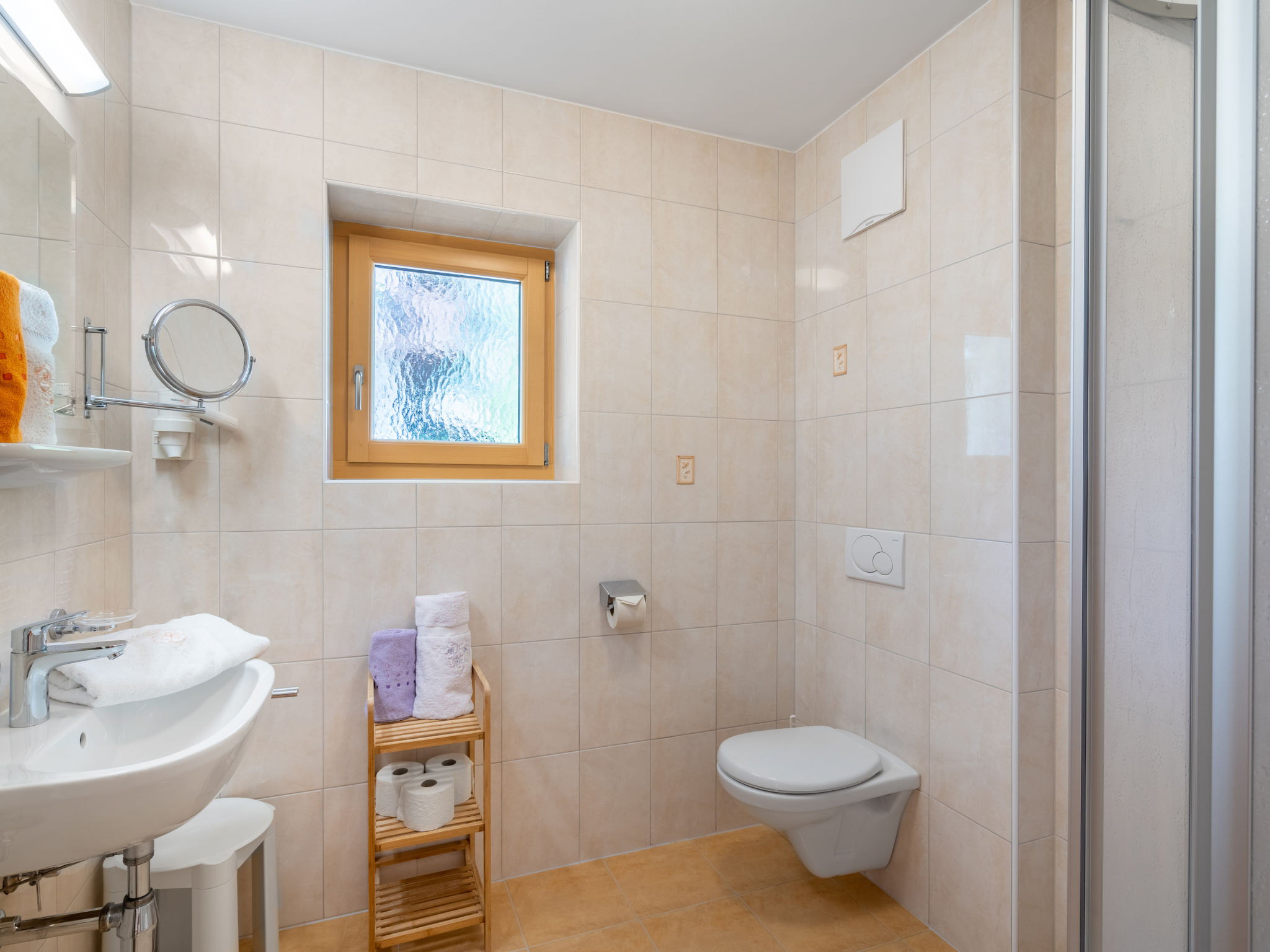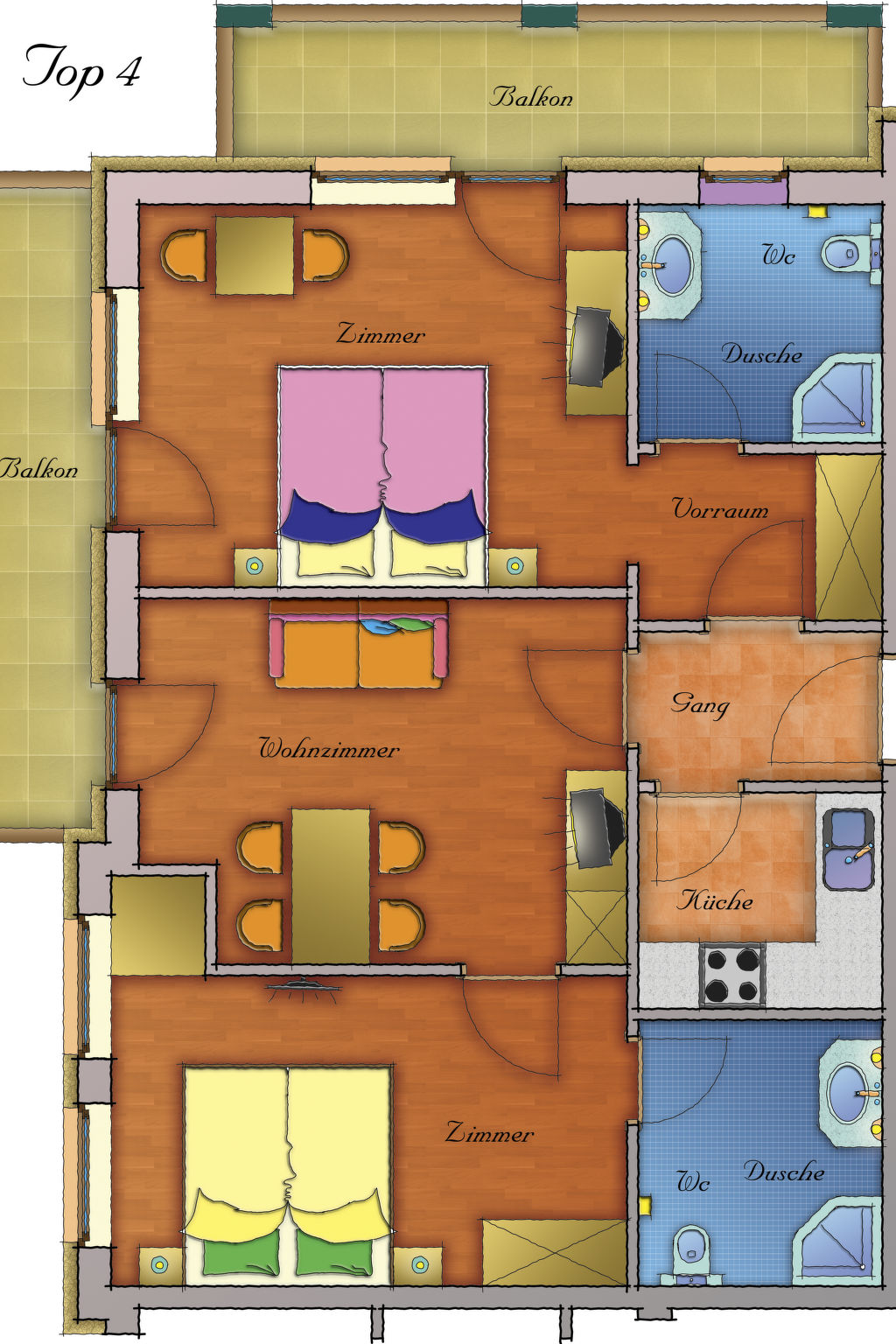 3-Zimmer-Wohnung, 1. Etage, ca. 60 m². Wohnraum mit Sitzcouch, Essplatz und Balkonausgang. Küche (4 Ceranfelder, Mikrowelle mit Grillfunktion, Geschirrspüler, Kühlschrank, Kaffeemaschine, Wasserkocher, Toaster). 2 Doppelzimmer, jeweils mit Dusche/WC, eines davon mit Balkonausgang.
