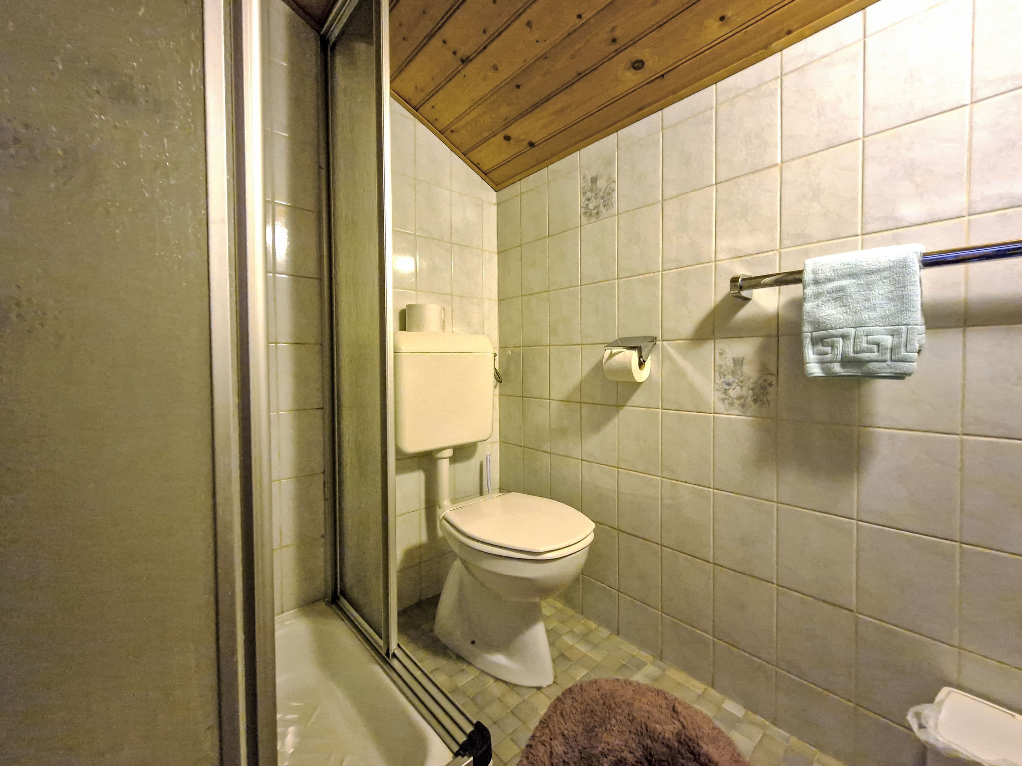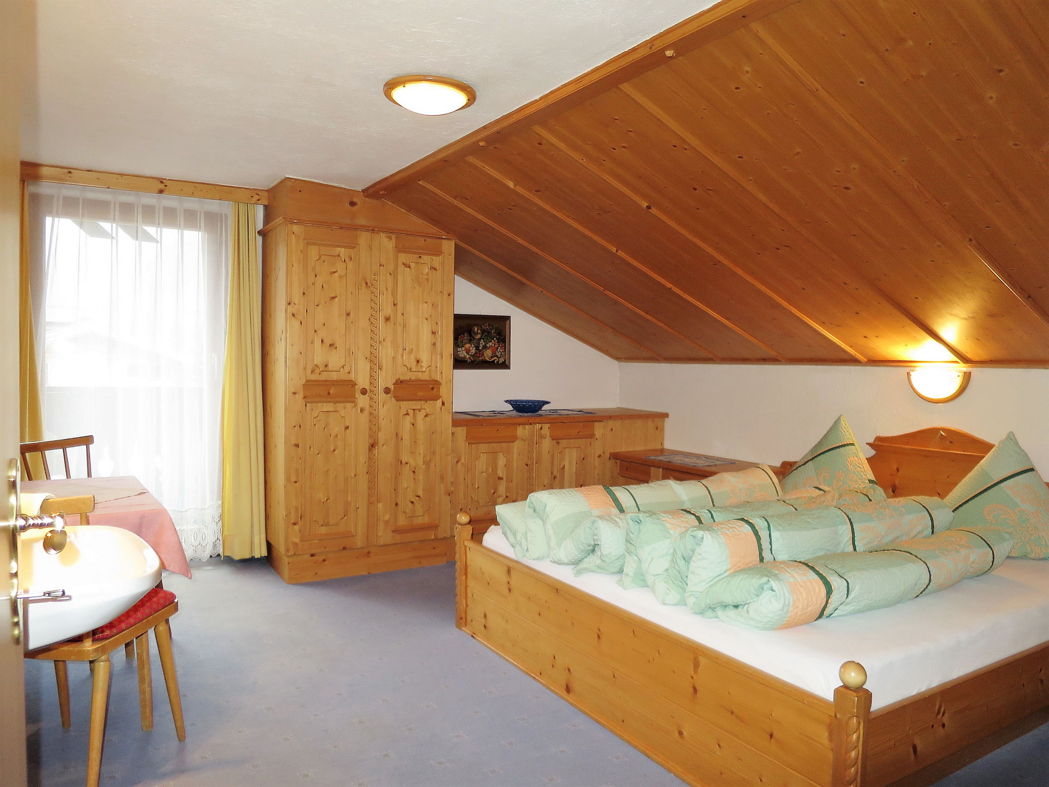 "Wiesenhof (LFD200)", 3-Zimmer-Wohnung 56 m2, im Dachgeschoss. Abgeschrägt, renoviert im Jahre 2015, zweckmässig und mit viel Holz eingerichtet: 2 Zimmer, jedes Zimmer mit 1 Doppelbett und Waschbecken. Ausgang zum Balkon. Wohnküche (4 Kochplatten, Backofen, Geschirrspüler, Toaster, Wasserkocher, Mikrowelle, elektrische Kaffeemaschine) mit Esstisch, Essecke und Sat-TV. Dusche/WC. Ölheizung. Balkon. Balkonmöbel. Panoramasicht auf Gamskogel / Hauerkogel. Zur Verfügung: Internet (Wireless LAN, gratis). Bitte beachten: Kühlschrank ohne Gefrierfach. Maximal 2 Haustiere/Hunde erlaubt.