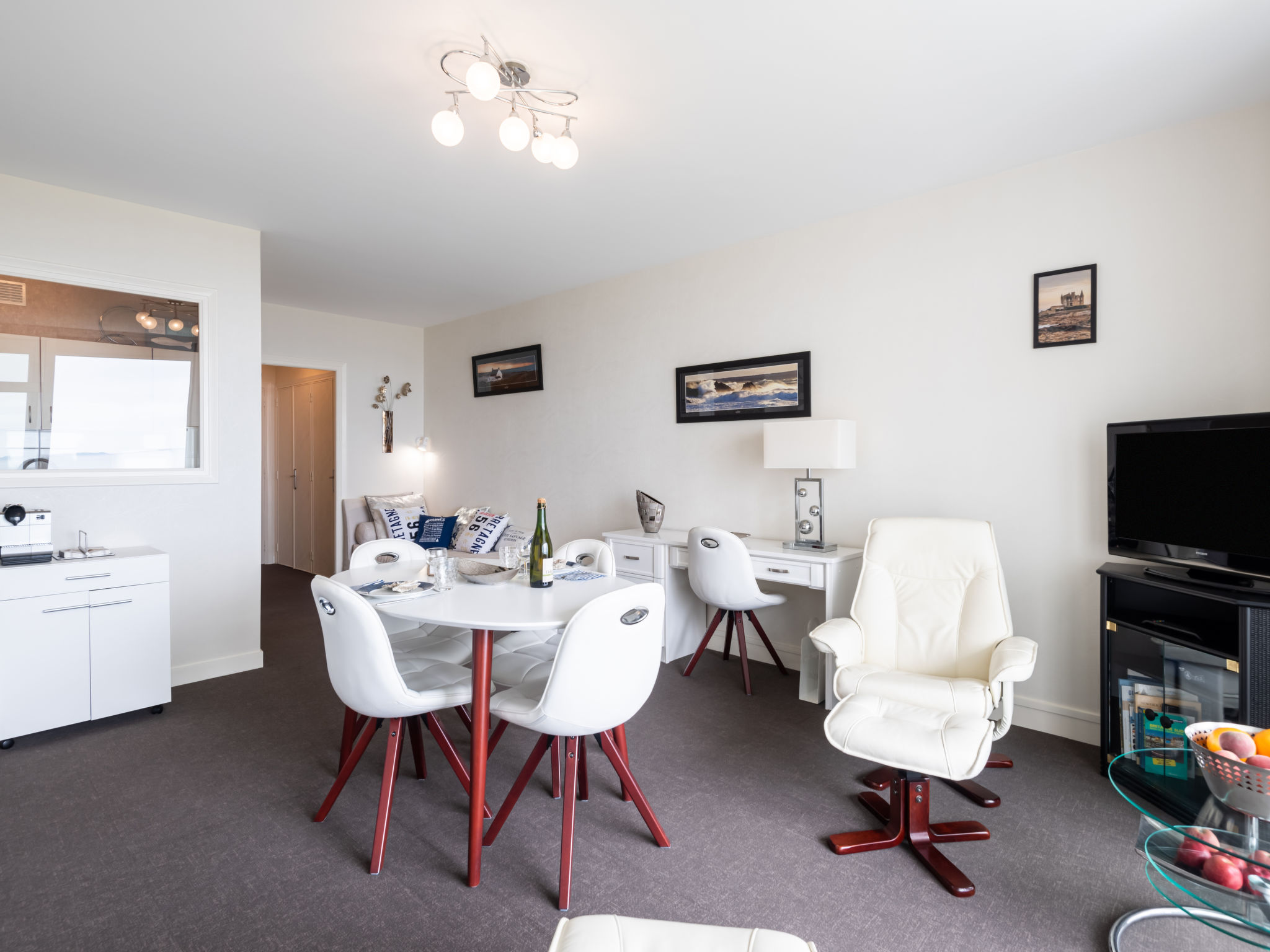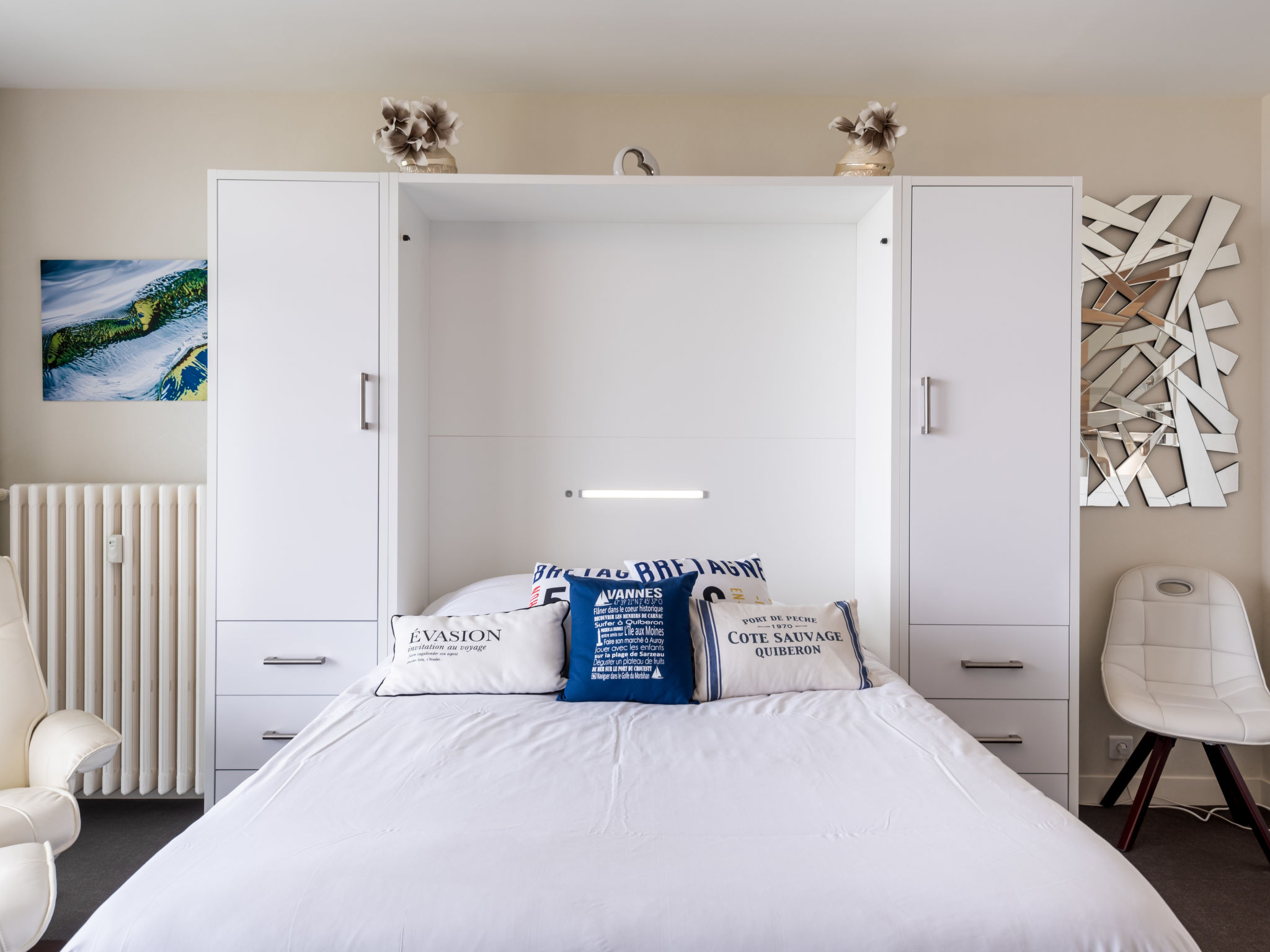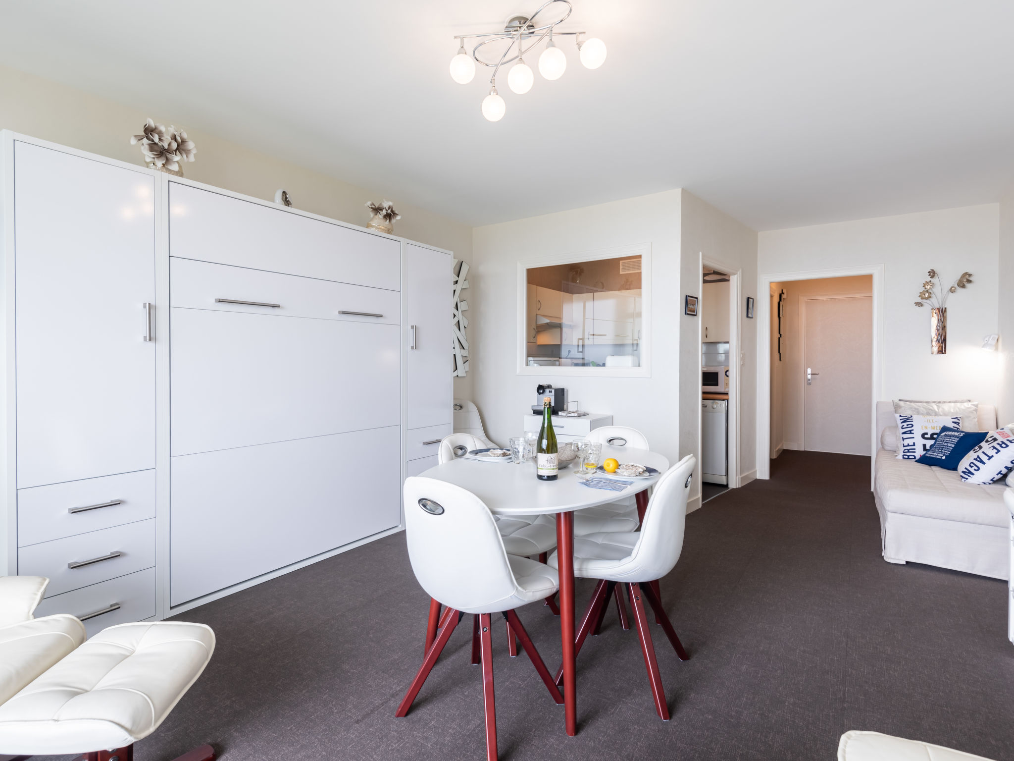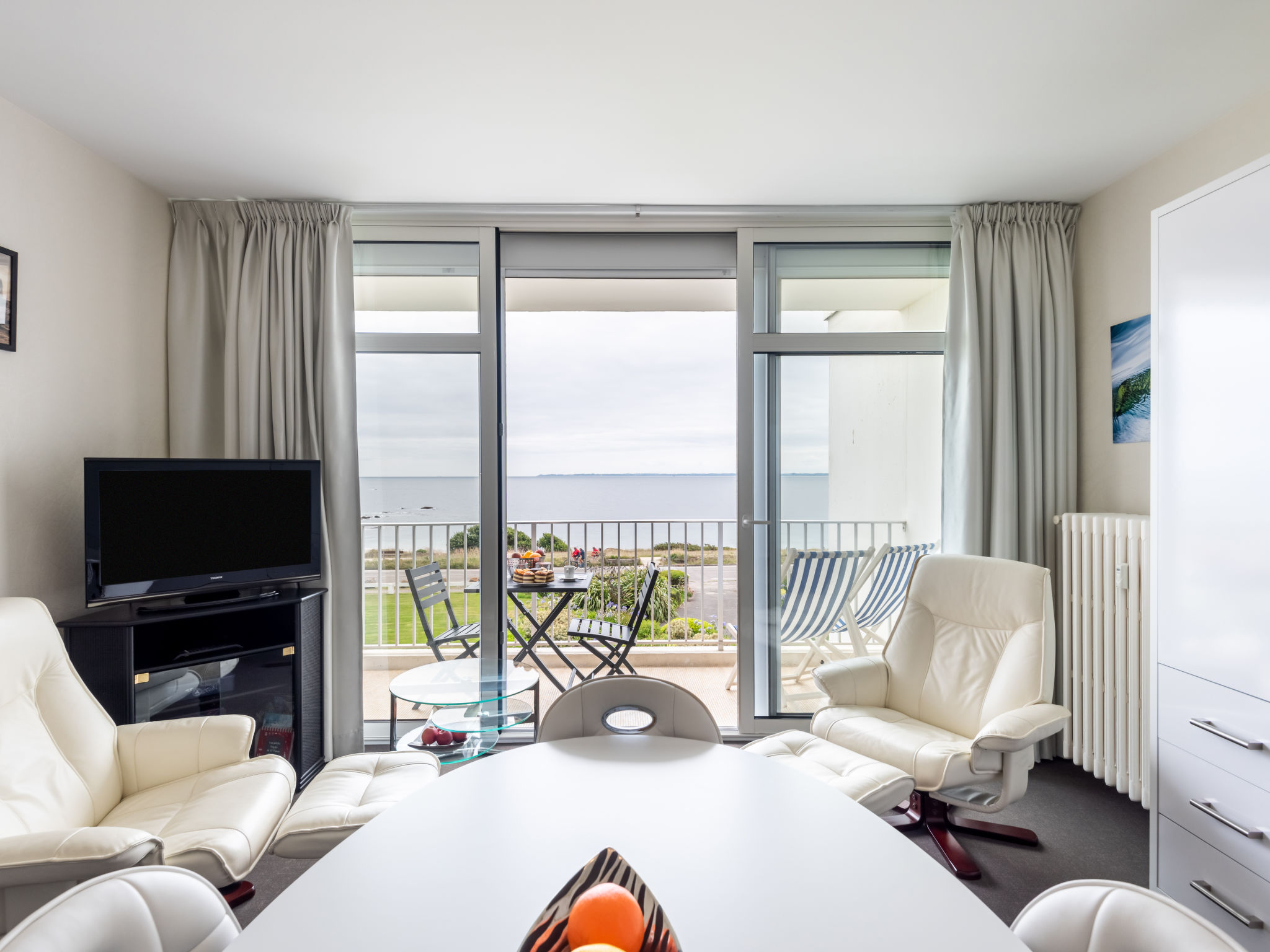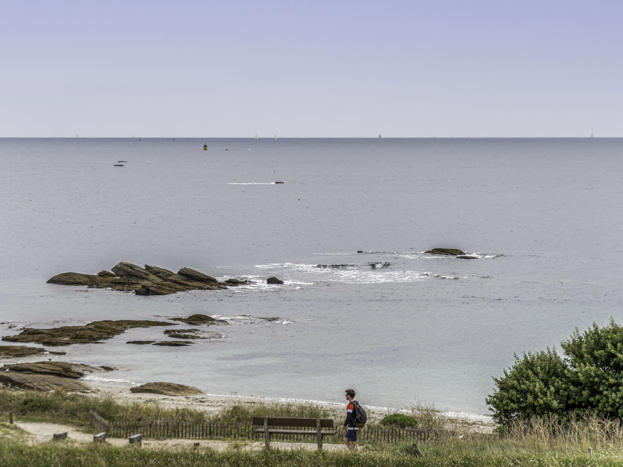 Quiberon: Kleine Residenz "Les Trois Iles", auf 2 Stockwerken. Im Ort, 2 km vom Zentrum von Quiberon, ruhige Lage, 20 m vom Meer, 30 m vom Strand. Parkplatz. Einkaufsgeschäft 1.5 km, Lebensmittelgeschäft 2 km, Supermarkt 2.4 km, Restaurant 2 km, Bahnstation "Quiberon" 2.5 km, Fähre "Port Maria" 2.5 km, Sandstrand "Plage du Conguel" 600 m, Thermalbad "Thalassothérapie de Quiberon" 200 m. Jacht-Hafen 3 km, Golfplatz (3 Loch) 500 m, Segelschule 3 km. Nahe gelegene Sehenswürdigkeiten: Presqu'ile de Quiberon et côte sauvage 3 km, Gare maritime les iles Houat, Hoedic. 3 km, Les alignements de Carnac 26 km, Auray et le port de St Goustan 33 km, Vannes 48 km, Lorient 63 km.