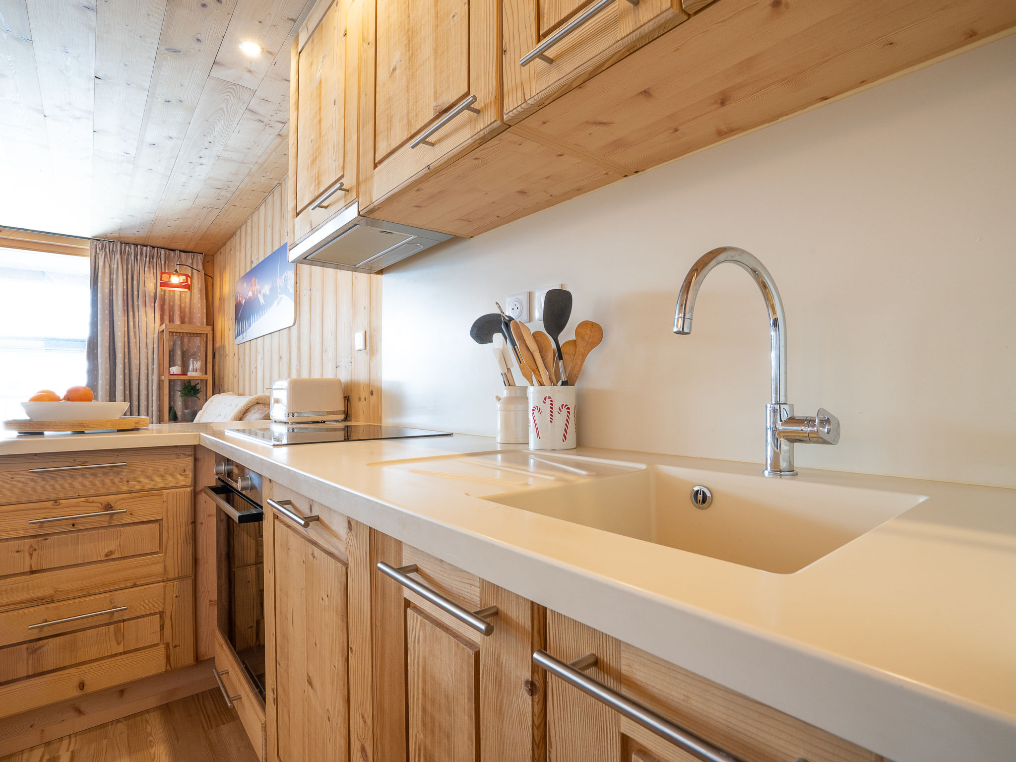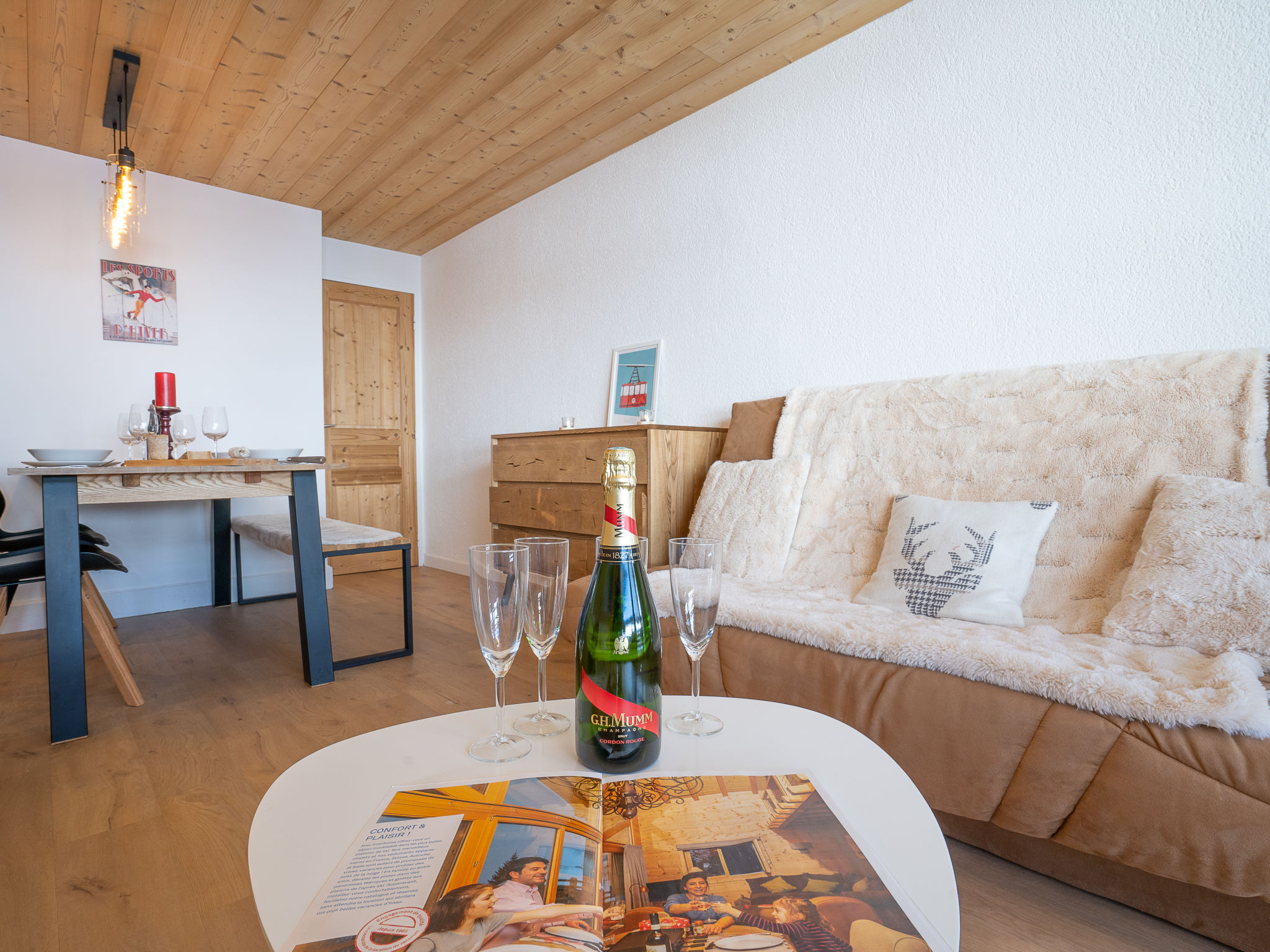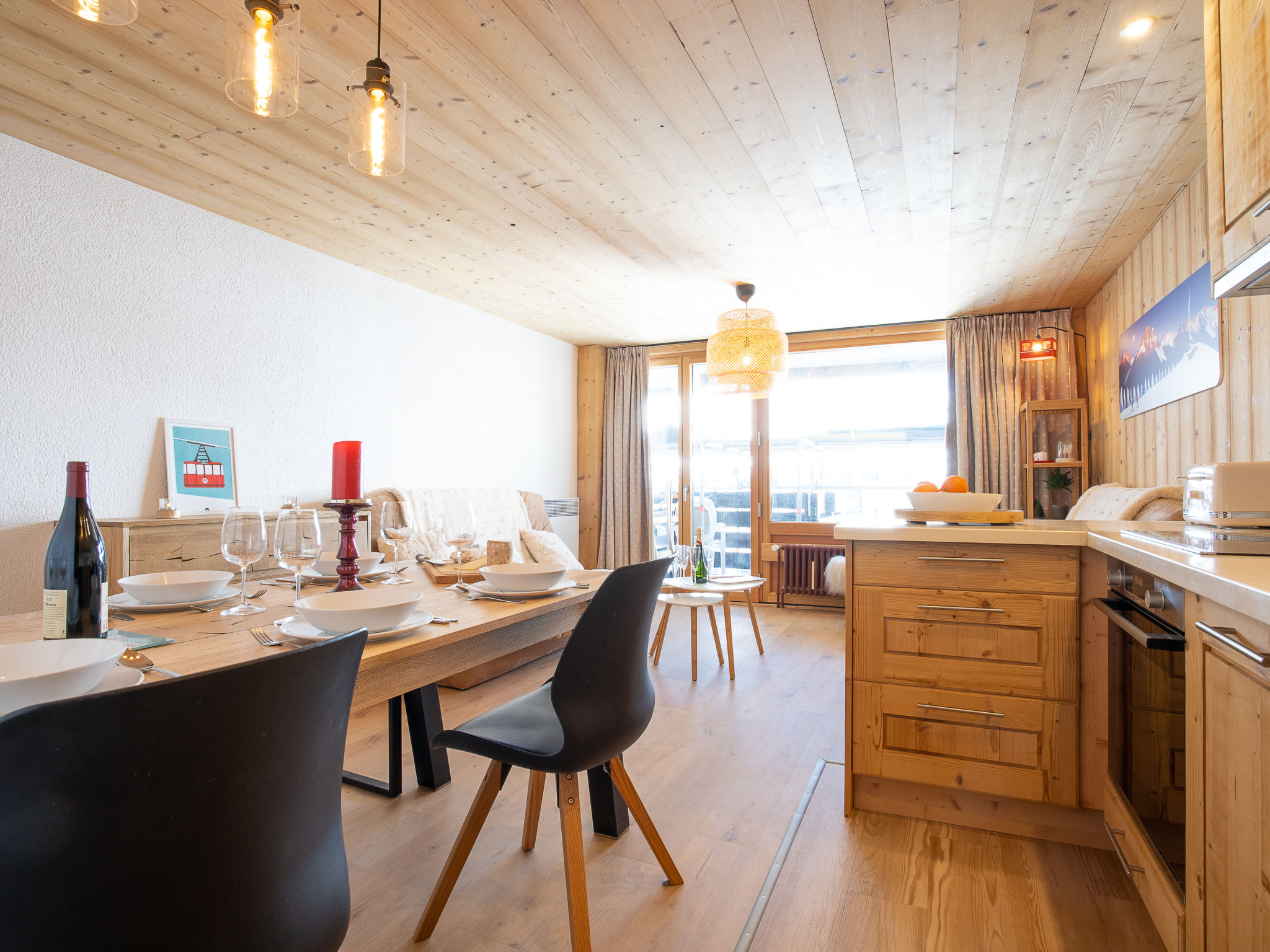 3-Zimmer-Wohnung 50 m2 im 3. Stock. Geräumig, luxuriös und stilvoll eingerichtet: Wohn-/Esszimmer. Ausgang zum Balkon, Richtung Südwesten. 1 Zimmer mit 1 franz. Bett (160 cm, Länge 200 cm), TV (Flachbildschirm). 1 kleines Zimmer mit 1 x 1 Etagenbetten (90 cm, Länge 190 cm), 1 franz. Bett (140 cm, Länge 190 cm). Offene Küche (Backofen, Geschirrspüler, 4 Induktionskochplatten, Toaster, Wasserkocher, Mikrowelle, elektrische Kaffeemaschine, Kapseln für die Kaffeemaschine (Nespresso) extra). Bad, sep. WC. Parkettböden. Balkonmöbel. Sehr schöne Panoramasicht auf die Berge und die Skipiste. Zur Verfügung: Waschmaschine, Bügeleisen, Haartrockner. Internet (Wireless LAN, gratis). Bitte beachten: Nichtraucher-Unterkunft. Rauchmelder.