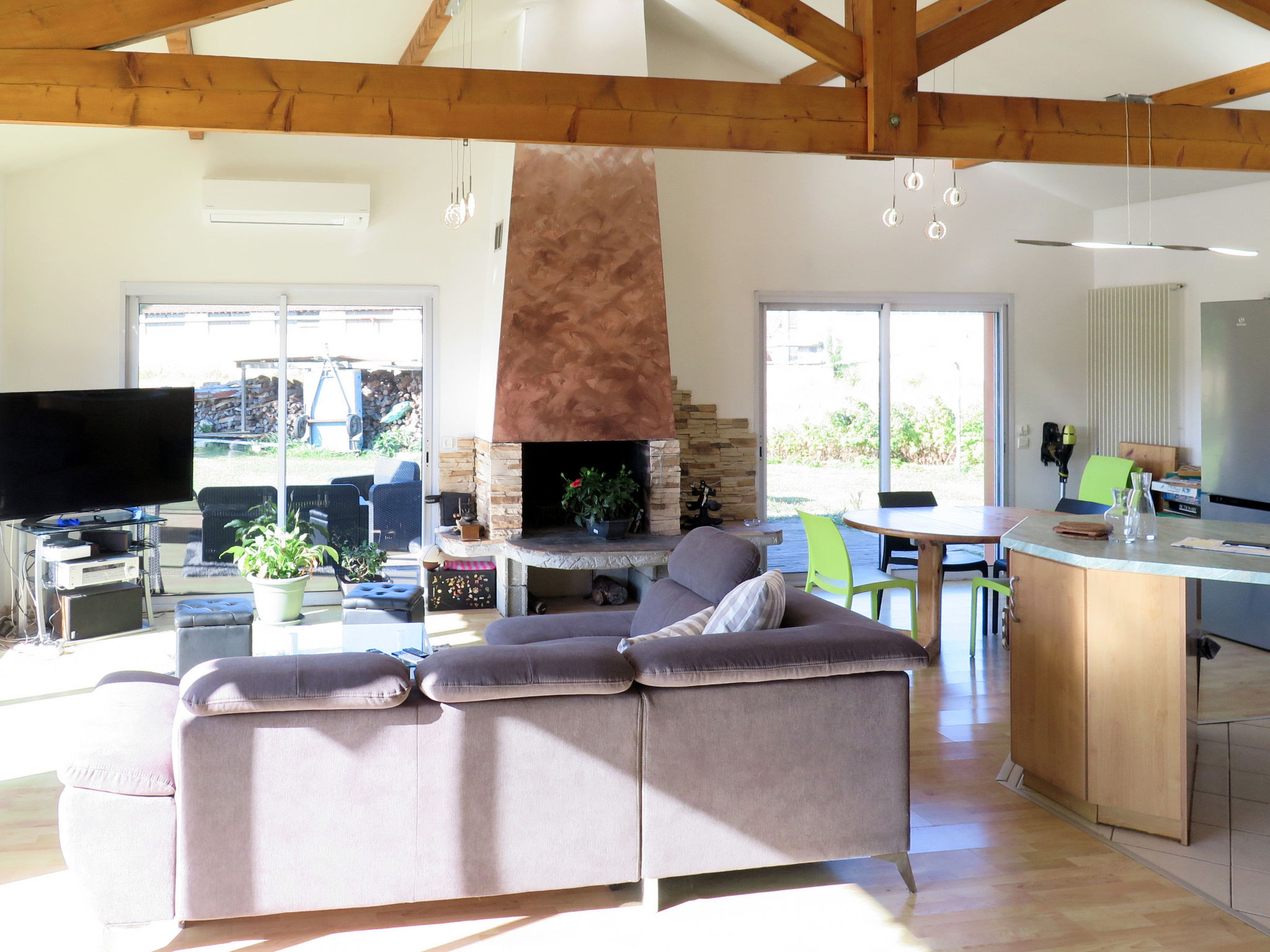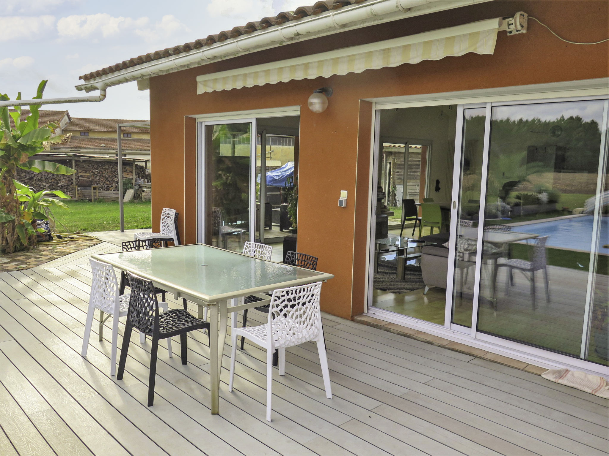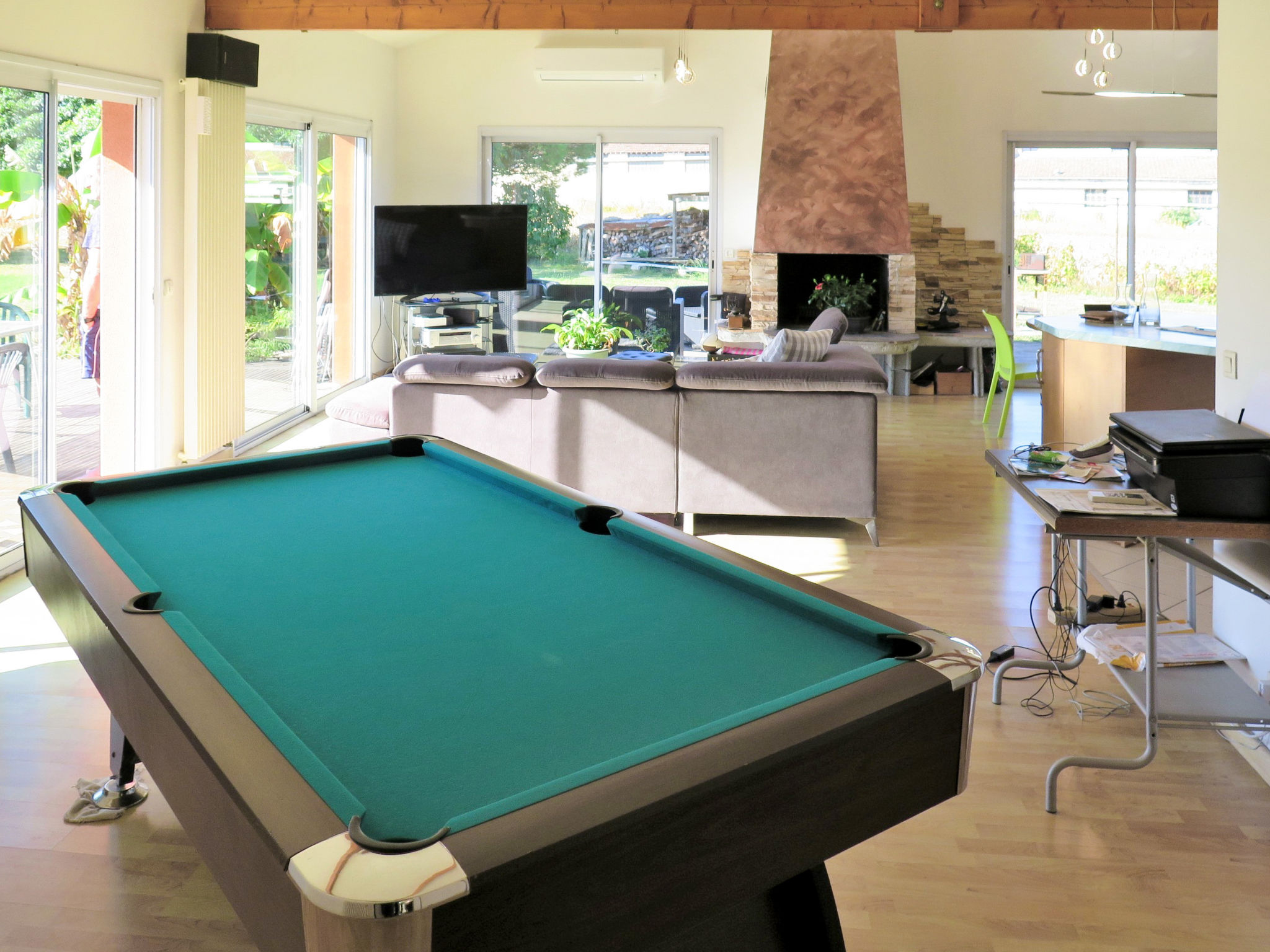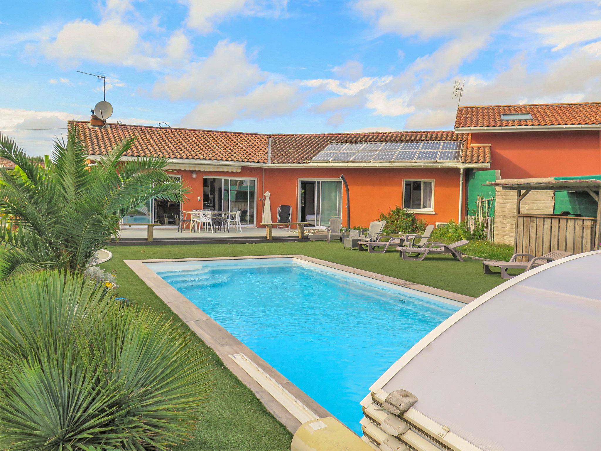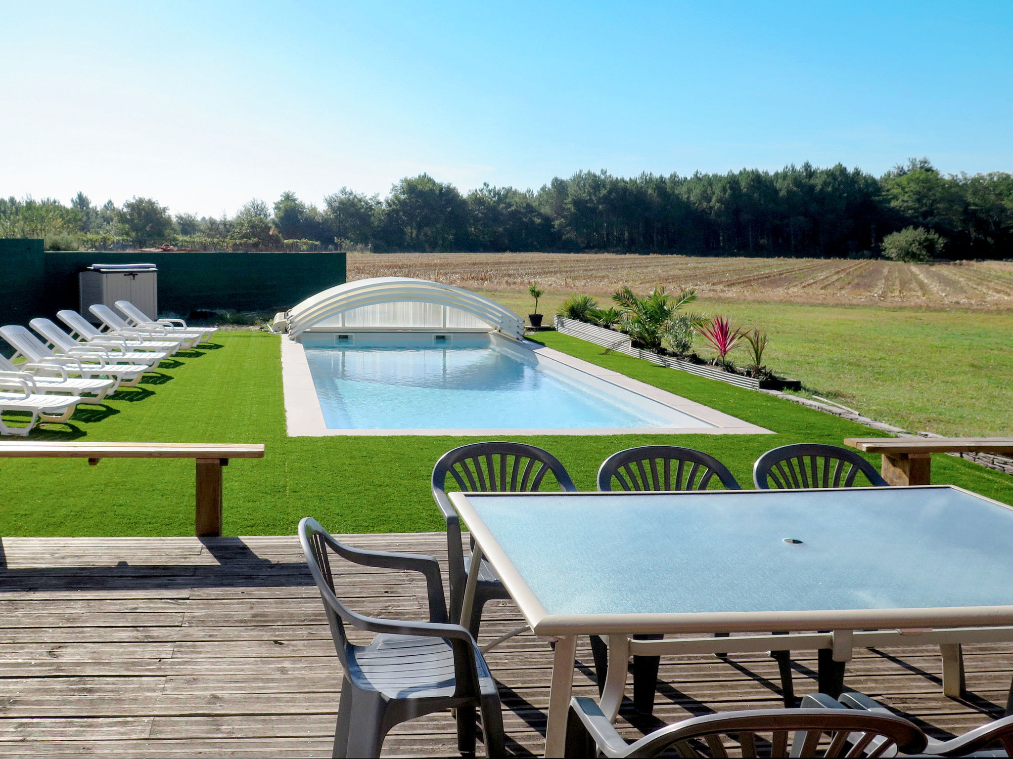 Das Ferienhaus MAROYE steht angrenzend an das Haus des Vermieters, in ländlicher Umgebung, 4 km von der Ortsmitte von Soustons mit Einkaufsmöglichkeiten entfernt. Zum Strand am See von Soustons 4 km, zu den Atlantikstränden Soustons-plage und Vieux-Boucau 11,5 km. Golf in Seignosse 11 km. Ca. 1000 m² großes, offenes Grundstück mit Kunstrasen und Blick ins Grüne. Große umlaufende Holzterrasse mit Markise, Sitzgruppe (Polyrattan), Gartenmöbeln, transportablem Grill und Sonnenschirm. Pool (10 x 4 m, 1,40 m tief, gesamte Saison geöffnet, Salzelektrolyse) mit mobiler Überdachung, Außendusche und 8 Sonnenliegen. Billard im Haus. 2 überdachte Parkmöglichkeiten auf dem Grundstück. Angenehme, feriengerechte Einrichtung. Fliesen-und Laminatböden. Sat-TV (deutsche Programme), Radio. Internetzugang (WLAN, inklusive). Waschmaschine im Abstellraum. Bügeleisen/-brett. Elektroheizung, Klimaanlage mit Kühl-/Heizfunktion. Hinweis: Rauchen ist im Haus nicht gestattet.