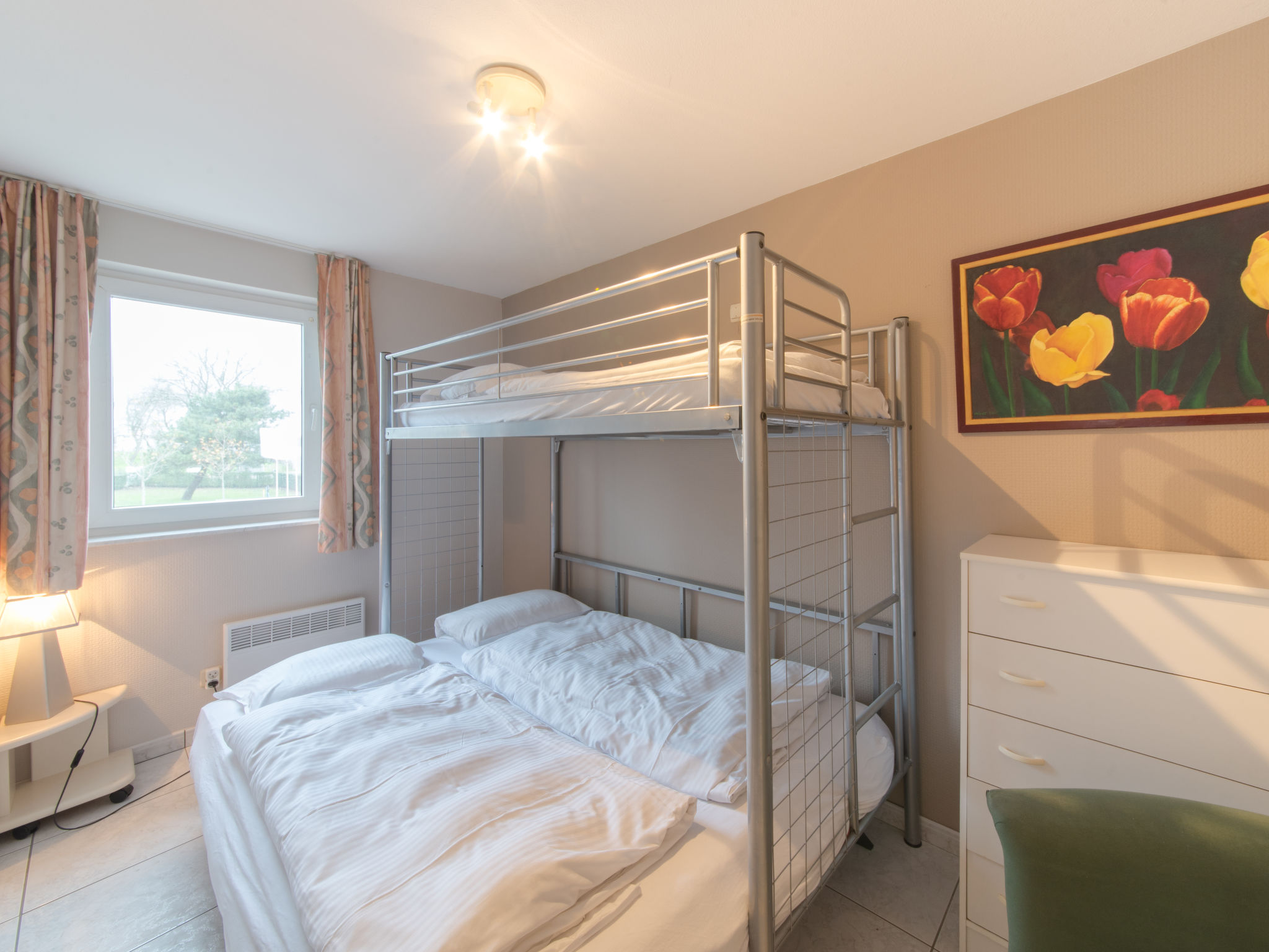 "De vakantieduinen aan zee", 3-Zimmer-Wohnung 65 m2 im 1. Stock. Zweckmässig und komfortabel eingerichtet: Eingang mit sep. WC. Wohn-/Esszimmer mit Esstisch, TV, Internationale TV-Sender, Flachbildschirm, DVD und DVD Sammlung vorhanden. Ausgang zum Balkon. 1 Zimmer mit 1 Doppelbett (160 cm, Länge 200 cm). 1 Kinderzimmer mit 1 x 2 Etagenbetten (90 cm, Länge 200 cm). Offene Küche (4 Kochplatten, Backofen, Geschirrspüler, Wasserkocher, Mikrowelle, Tiefkühler, elektrische Kaffeemaschine) mit kleiner Bar. Dusche, Doppelwaschbecken. E-Heizung. Balkonmöbel. Zur Verfügung: Internet (Wireless LAN, gratis). Parkplatz. Bitte beachten: Nichtraucher-Haus. 1 kleines Haustier/Hund erlaubt. Rauchmelder, Feuerlöscher. Flexibilität bei der Bettenaufteilung: Es stehen mehr Schlafmöglichkeiten zur Verfügung als die maximal zugelassene Personenzahl, diese darf dennoch nicht überschritten werden.
