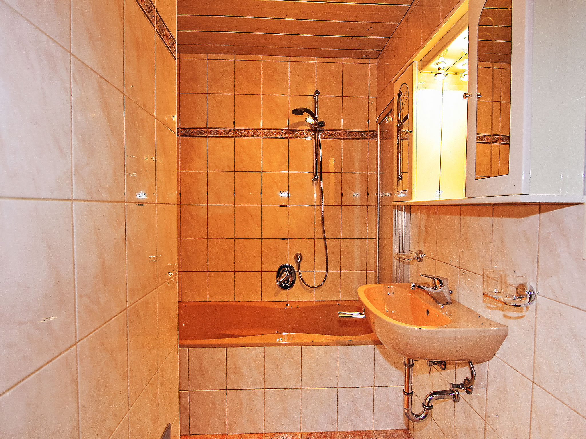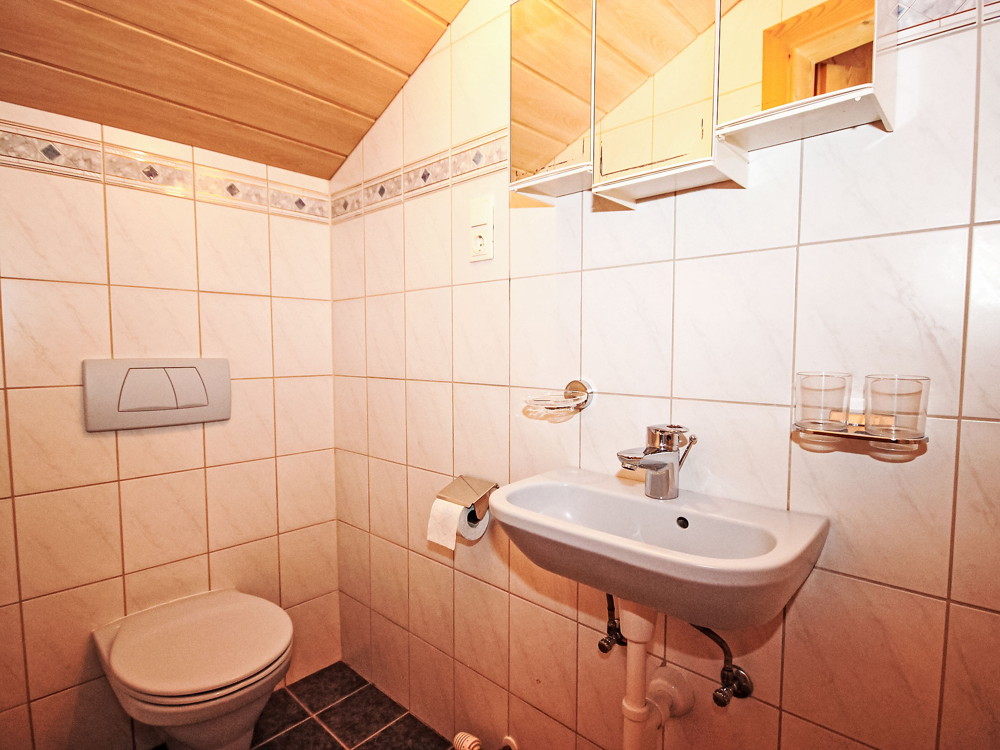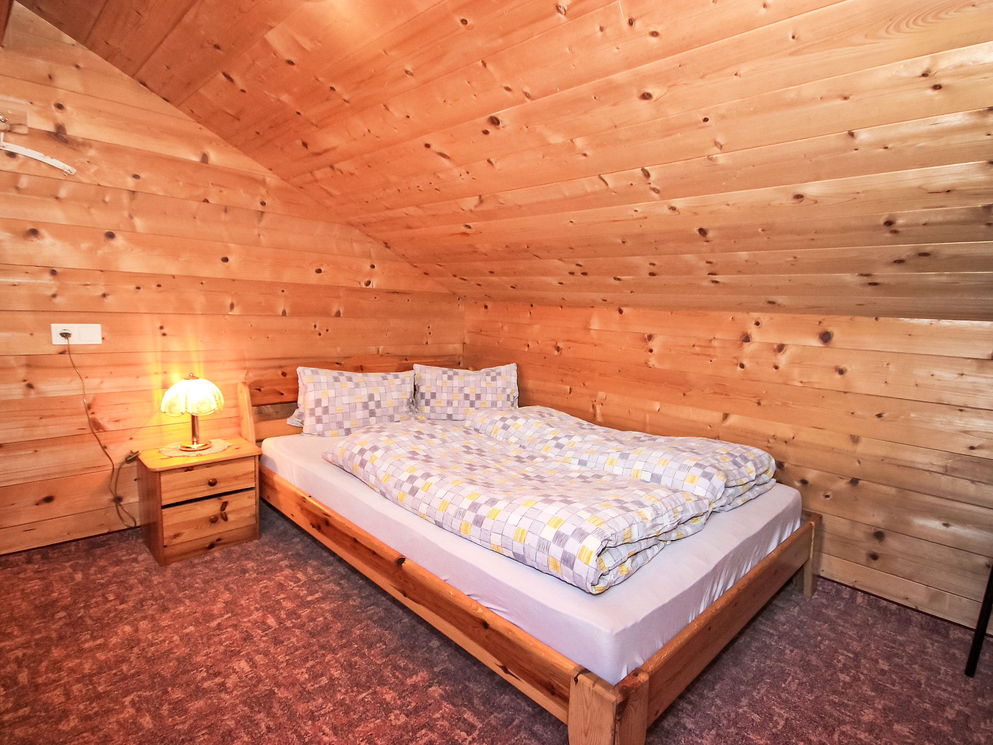 5-Zimmer-Wohnung 100 m2 auf 2 Stockwerken im 1. Stock. Rustikal und gemütlich eingerichtet: Eingang. Wohn-/Esszimmer mit Essecke und Sat-TV. Ausgang zum Balkon. 1 abgeschrägtes Zimmer mit Dachfenster mit 1 Diwanbett, 1 Doppelbett und Dusche/WC. 1 Doppelzimmer. Ausgang zum Balkon. 1 Zimmer mit 2 Betten und 1 x 1 Etagenbetten. Offene Küche (4 Kochplatten, Backofen, Geschirrspüler, Mikrowelle). Bad, sep. WC. Dachgeschoss: (steile Treppe) 1 abgeschrägtes Zimmer mit Dachfenster mit 1 franz. Bett (140 cm, Länge 200 cm), Waschbecken und sep. WC. 2 Balkone. Balkonmöbel. Herrliche Panoramasicht auf die Berge und die Landschaft. Zur Verfügung: Internet (Wireless LAN, extra). In einem 3 Bett Zimmer steht ein Etagenbett, unten können 2 Personen schlafen, eine Person schläft oben. Die Wohnung darf maximal mit 10 Personen belegt werden (inklusive Gitterbett). Bei Belegung mit weniger Personen als der maximalen Personenzahl stehen nicht alle Schlafzimmer zur Verfügung.