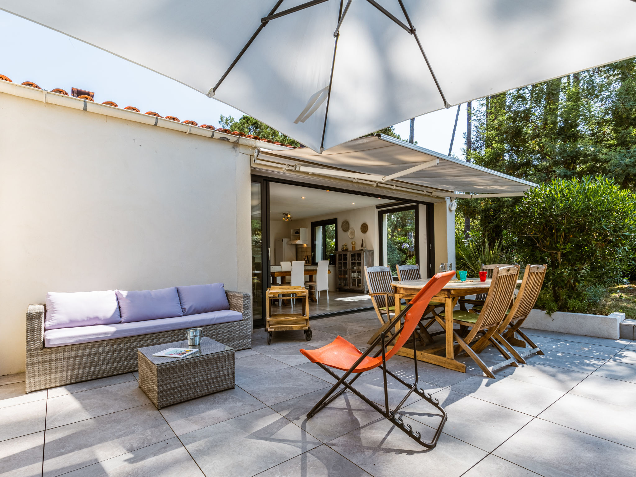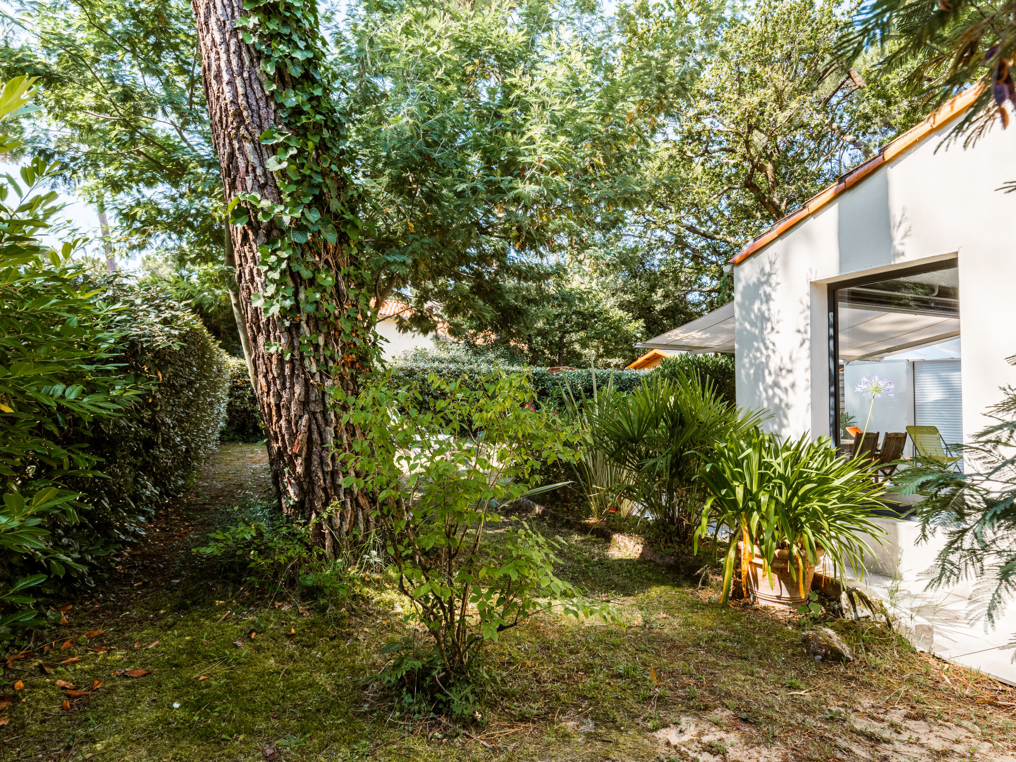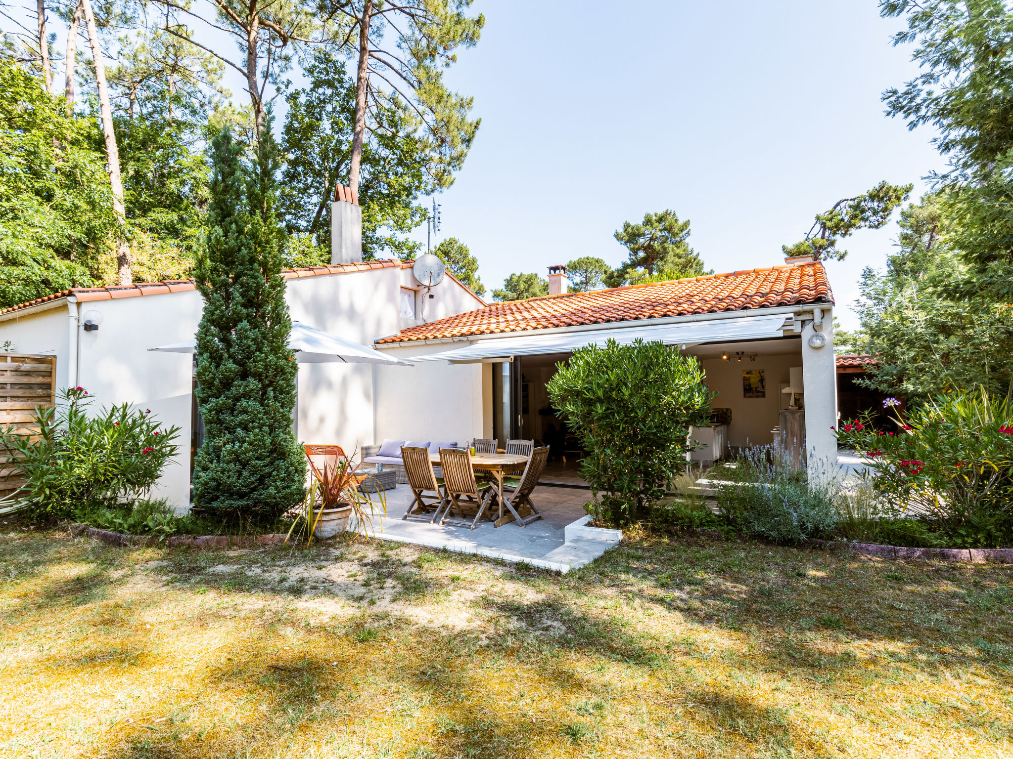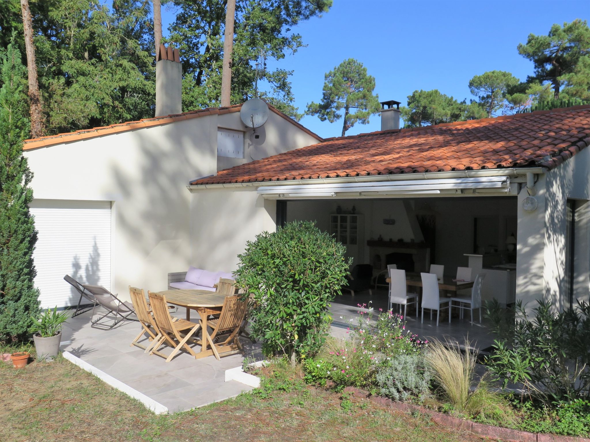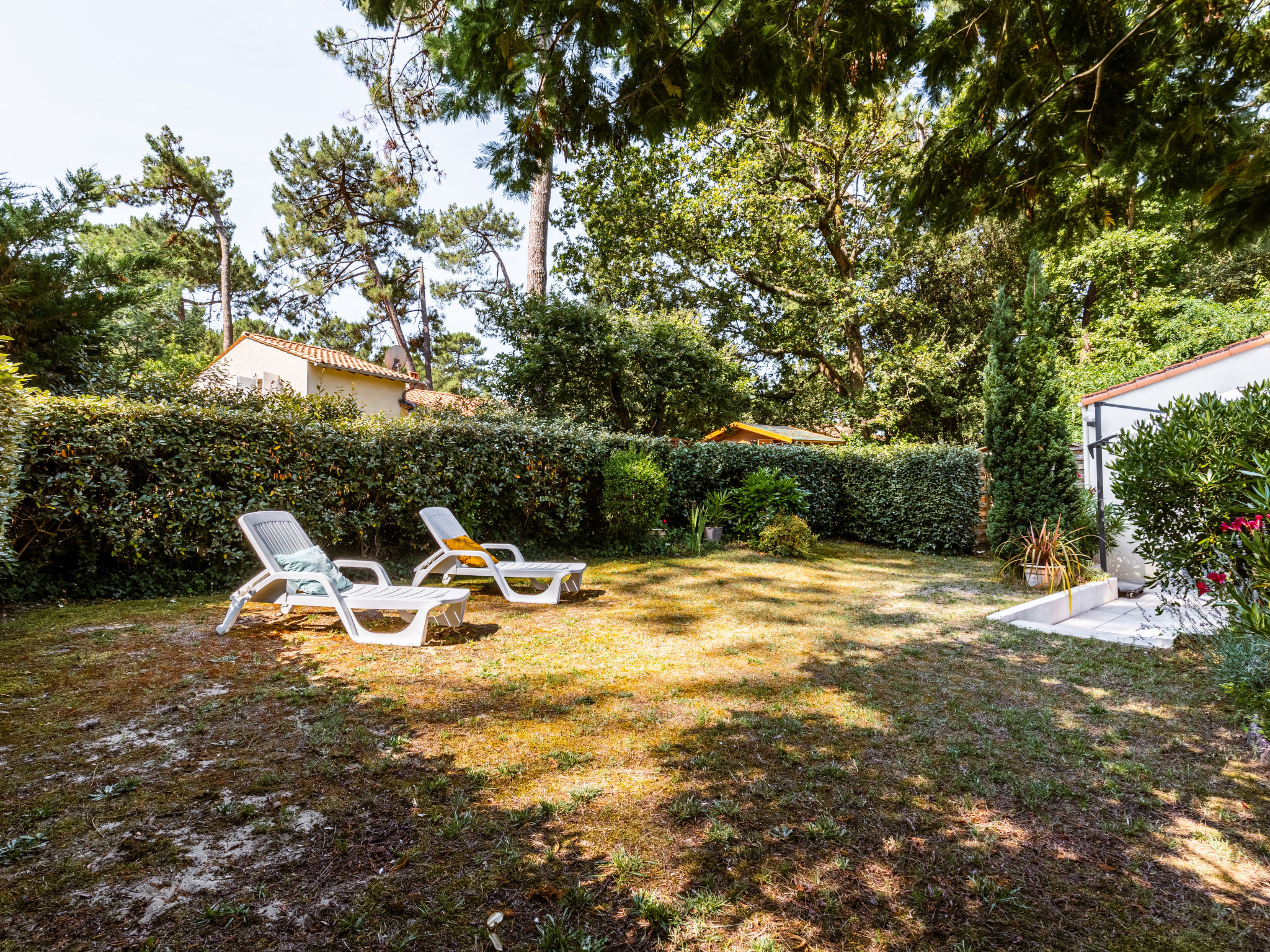 Einfamilienhaus "Les Narcisses". 500 m vom Zentrum von Ronce-les-Bains, 4 km vom Zentrum von La Tremblade, 29 km vom Zentrum von Royan, in einem Wohnquartier, 500 m vom Meer, in einer Sackgasse. Zur Alleinbenutzung: naturbelassenes Grundstück 600 m2 (eingezäunt) mit Pflanzen und Bäumen, Parkplatz (überdacht) auf dem Grundstück. Einkaufsgeschäft 500 m, Supermarkt 4 km, Sandstrand "Plage de Mus de Loup" 500 m. Ein Teil des Hauses ist abgeschlossen und unbewohnt.