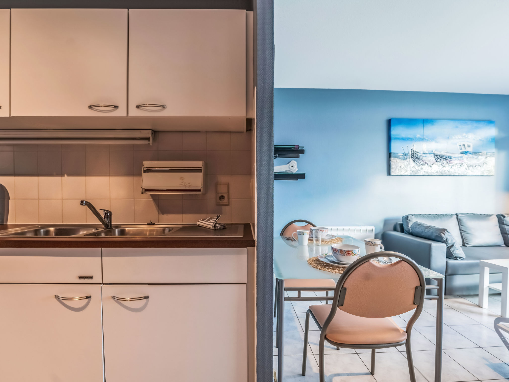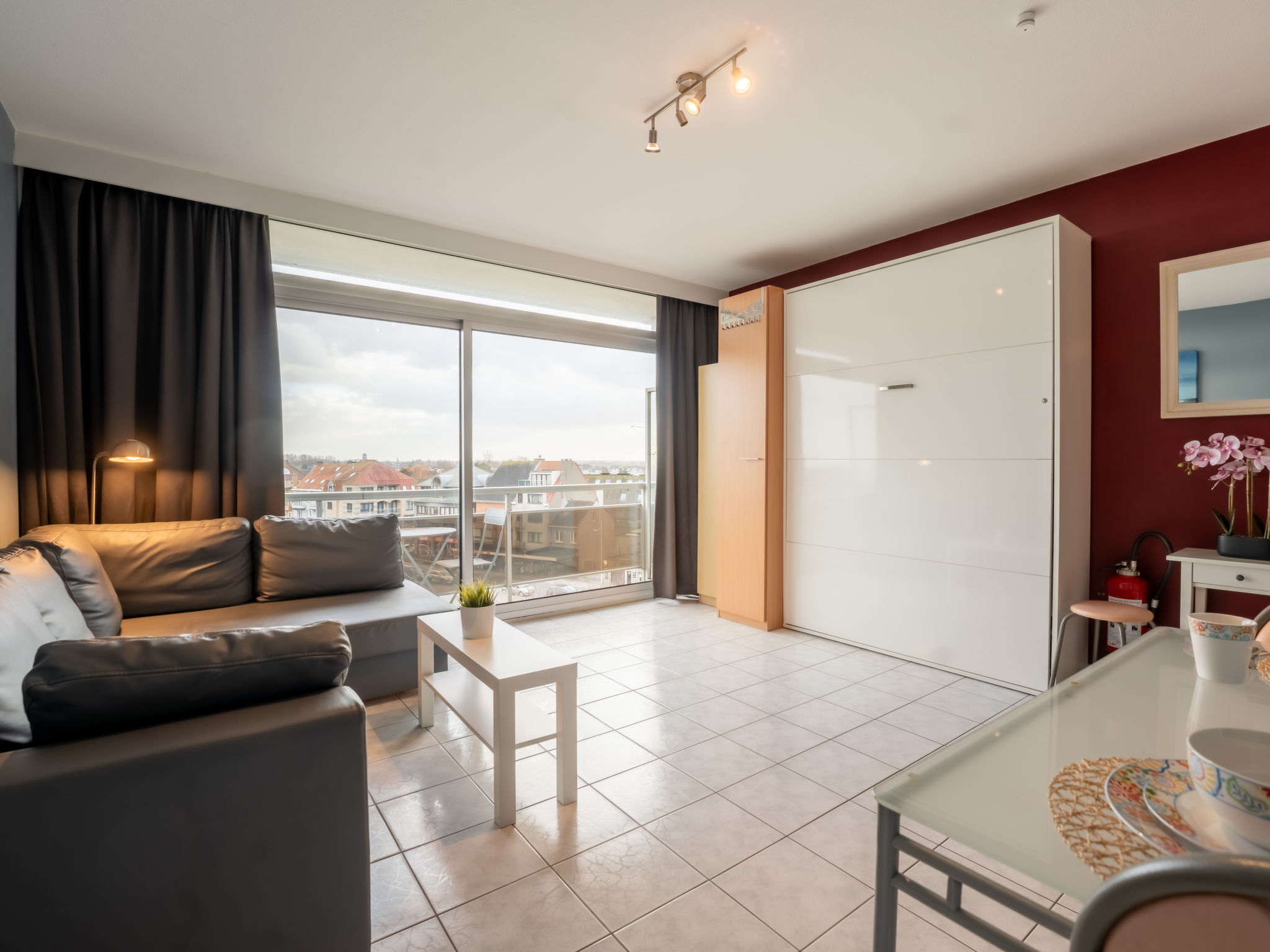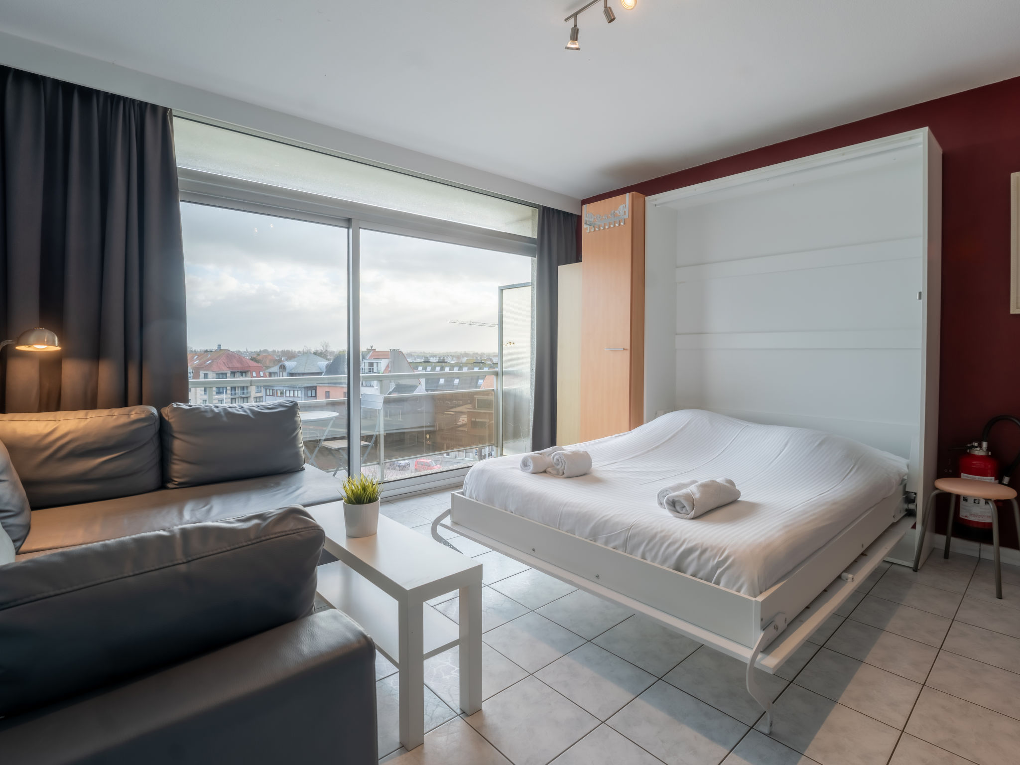 "Studio 502", 1-Zimmer-Studio 25 m2 im 5. Stock. Komfortabel eingerichtet: Wohn-/Schlafzimmer mit 1 Doppeldiwanbett und 1 Wandschrankbett (160 cm, Länge 200 cm), Digital-TV. Ausgang zum Balkon. Küche (4 Kochplatten, Wasserkocher, elektrische Kaffeemaschine). Dusche/WC. E-Heizung. Balkonmöbel. Sicht auf die Ortschaft. Zur Verfügung: Internet (Wireless LAN, gratis). Parkplatz Nr. 21 (extra). Bitte beachten: Nichtraucher-Haus. 1 kleines Haustier/Hund erlaubt. Rauchmelder, Feuerlöscher.