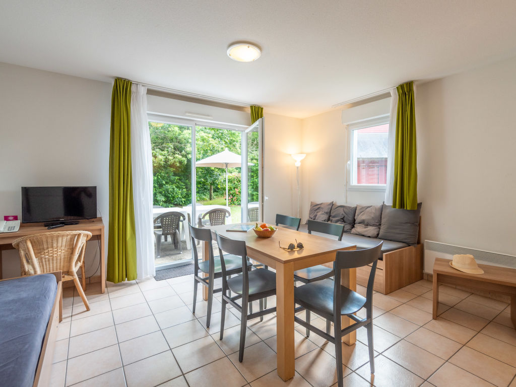 2-Zimmer-Reihenhaus, ca. 39 m2. Wohn-/Schlafzimmer mit Bettcouch, Doppelausziehbett, Esstisch und Küchenzeile (4 Ceranfelder, Mikrowelle, Geschirrspüler, Küh-/Gefrierkombination, Kaffeemaschine, Toaster). Zweibettzimmer. Bad. Sep. WC.