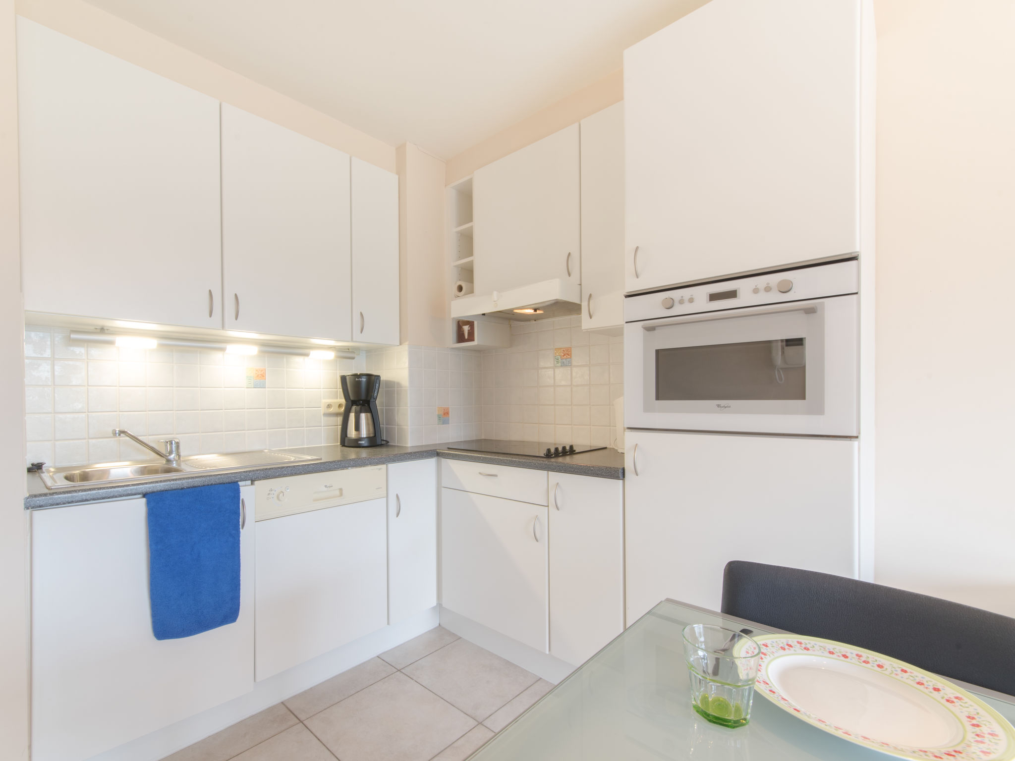 "Green Garden VIII - 105", 2-Zimmer-Wohnung 47 m2 im 1. Stock. Zweckmässig und gemütlich eingerichtet: Eingang mit 1 x 2 Etagenbetten (90 cm, Länge 200 cm). 1 Doppelzimmer mit 1 Doppelbett (160 cm, Länge 200 cm). Wohnzimmer mit TV, Internationale TV-Sender und CD. Offene Küche (4 Kochplatten, Geschirrspüler, Toaster, Wasserkocher, elektrische Kaffeemaschine, Kombinationsmikrowelle) mit Esstisch. Dusche/WC. E-Heizung, Boiler (70 Liter). Kleiner Balkon, Südwestlage. Balkonmöbel. Schöne Sicht auf den Garten. Zur Verfügung: Internet (Wireless LAN, gratis). Garage Nr. 65 auf dem Grundstück. Bitte beachten: Nichtraucher-Haus. Rauchmelder, Feuerlöscher.