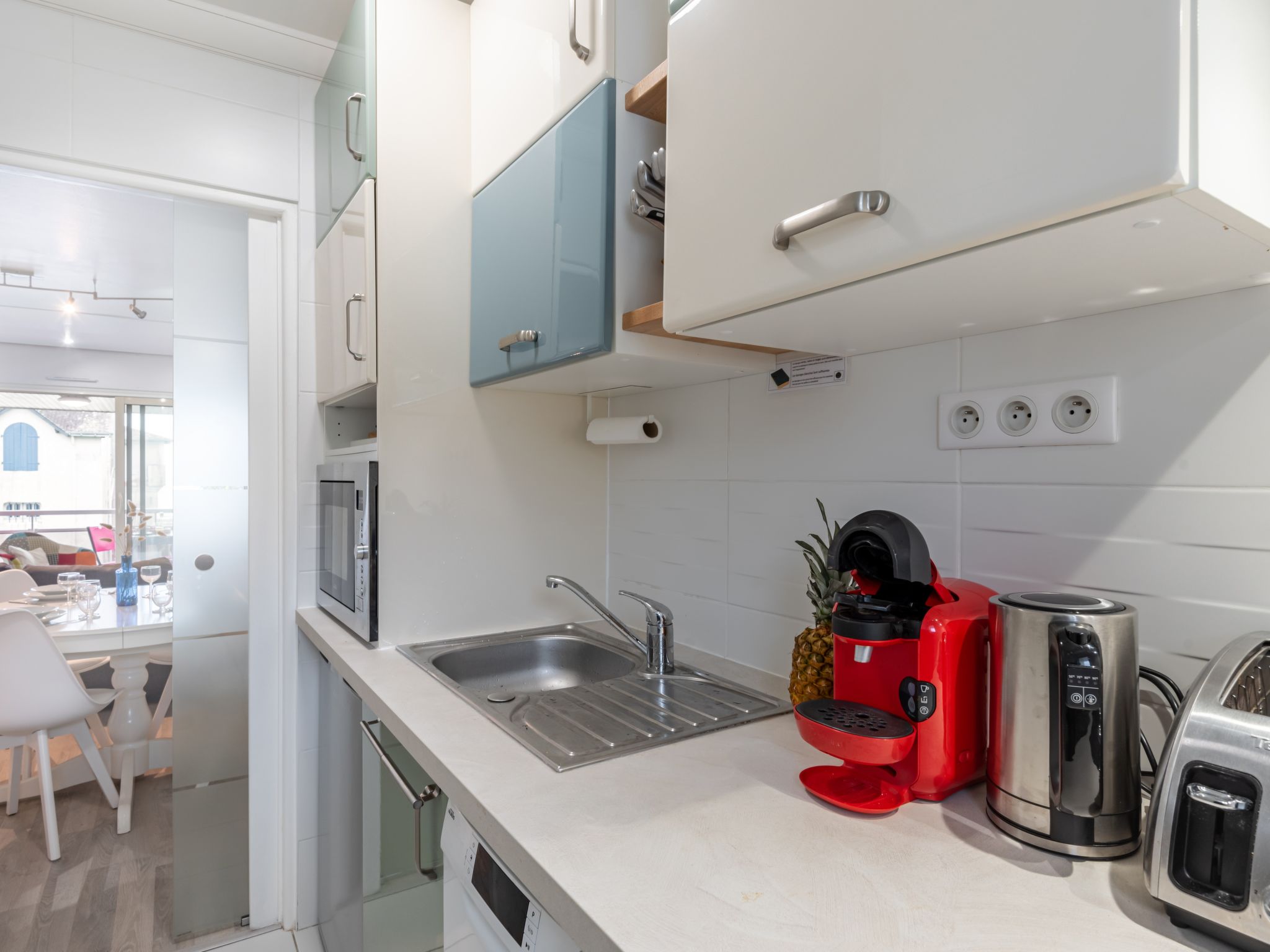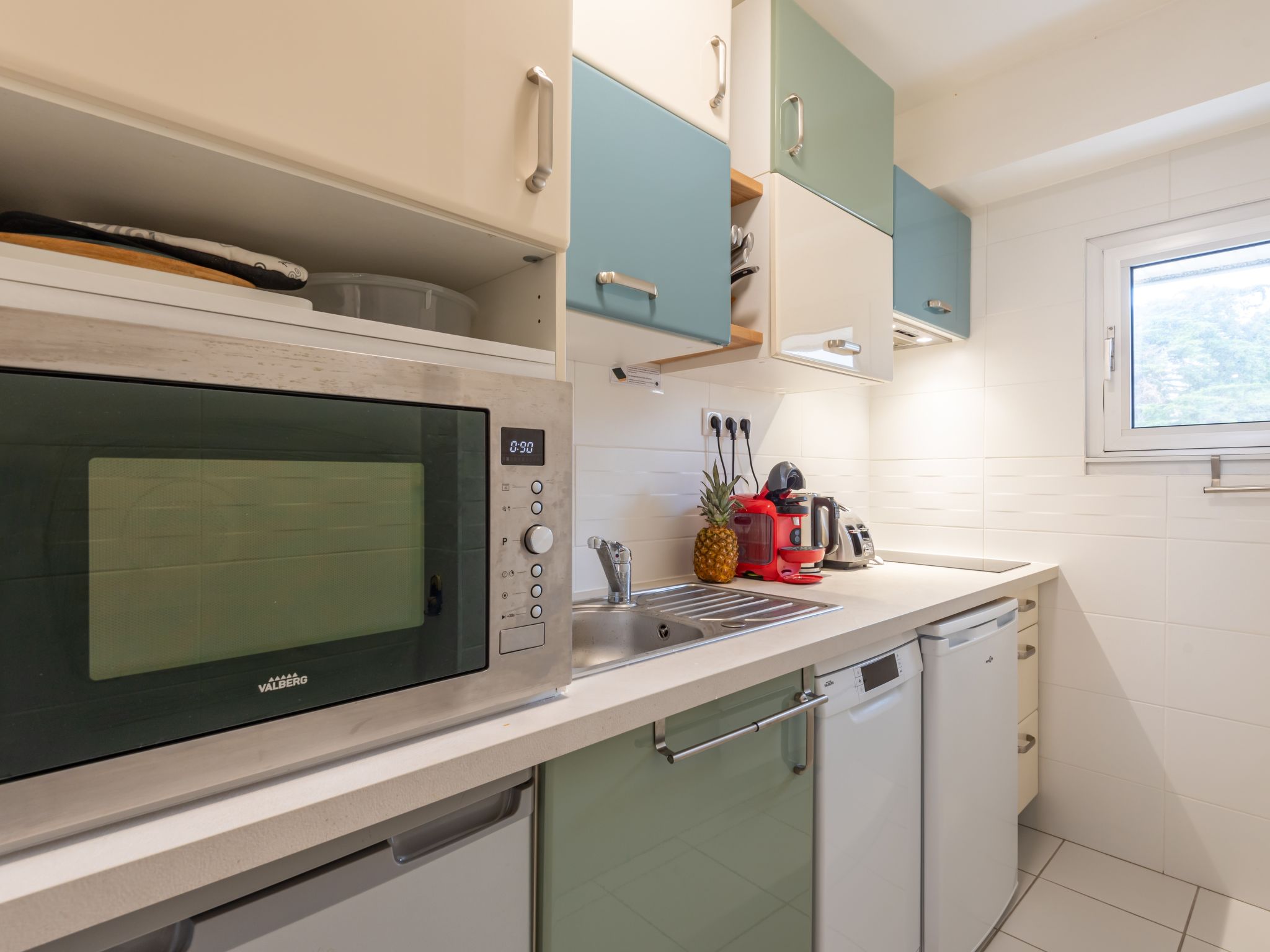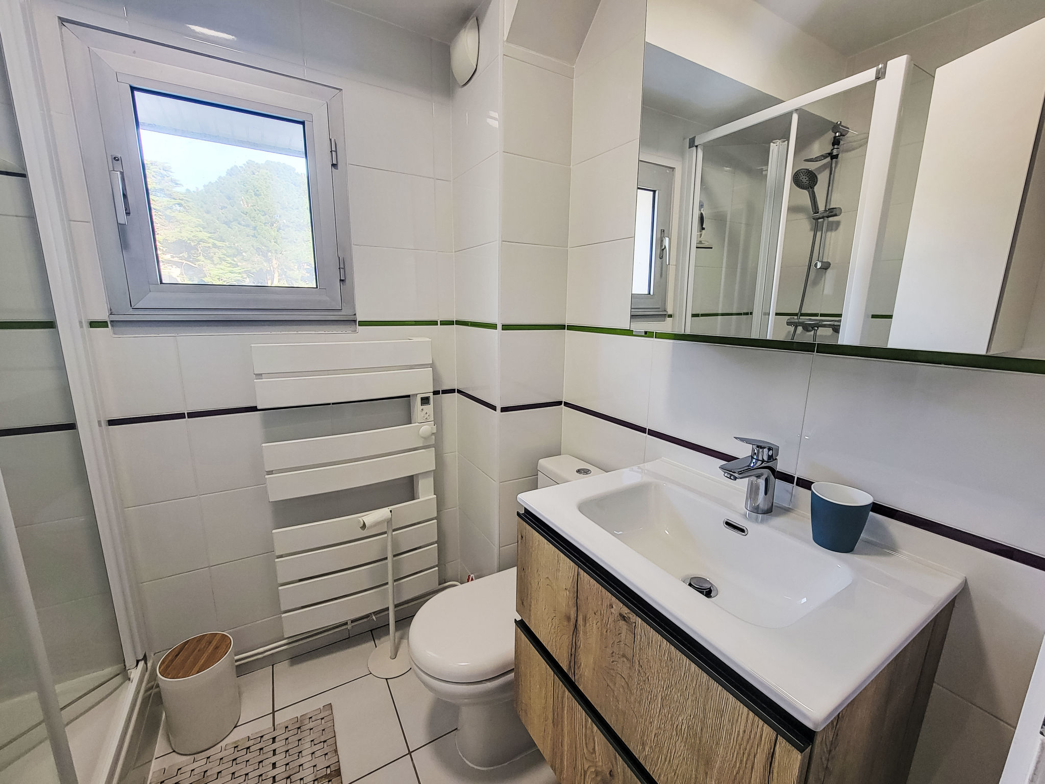 3-Zimmer-Wohnung 50 m2 auf 2 Stockwerken im 1. Stock. Komfortabel und schön eingerichtet: Wohn-/Esszimmer mit TV (Flachbildschirm). Ausgang zum Balkon. Küche (Backofen, Geschirrspüler, 2 Induktionskochplatten, Toaster, Wasserkocher, Tiefkühler, elektrische Kaffeemaschine, Kapseln für die Kaffeemaschine (Bosh) extra, Kombinationsmikrowelle). Bad/WC. Obergeschoss: 1 Zimmer mit 1 franz. Bett (1 x 160 cm, Länge 200 cm), TV (Flachbildschirm). 1 Zimmer mit 2 Betten (90 cm, Länge 190 cm). E-Heizung. Balkon 9 m2. Balkonmöbel, Liegestühle (2). Eingeschränkte Sicht auf das Meer. Zur Verfügung: Waschmaschine, Bügeleisen, Haartrockner. Internet (Wireless LAN, gratis). Parkplatz Nr. 12 (1 Auto). Bitte beachten: Nichtraucher-Unterkunft.