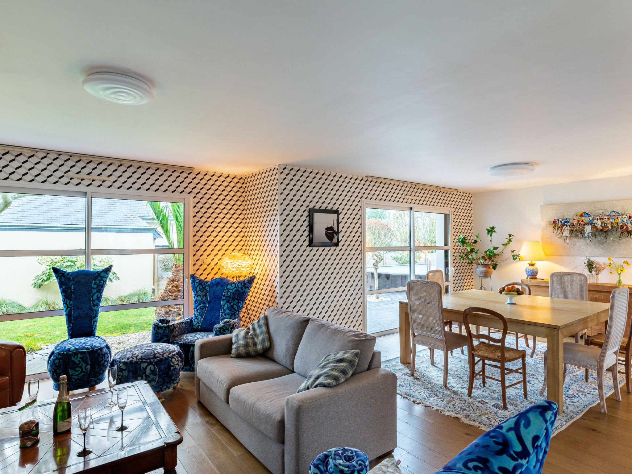 "Le Clos Velin", 5-Zimmer-Haus 150 m2 auf 2 Stockwerken. Komfortabel eingerichtet: Wohn-/Esszimmer mit offenem Kamin (nur Deko), TV (Flachbildschirm). Ausgang zur Terrasse. 1 Zimmer mit 1 franz. Bett (160 cm, Länge 200 cm), TV (Flachbildschirm). Ausgang zum Garten. Offene Küche (Backofen, Geschirrspüler, 3 Induktionskochplatten, Toaster, Wasserkocher, Tiefkühler, elektrische Kaffeemaschine, Kapseln für die Kaffeemaschine (Nespresso) extra). Bad/Dusche, sep. WC, Doppelwaschbecken. Obergeschoss: 1 abgeschrägtes Zimmer mit 1 Bett (90 cm, Länge 190 cm), 1 franz. Bett (140 cm, Länge 190 cm). 1 abgeschrägtes Zimmer mit 2 Betten (90 cm, Länge 200 cm). 1 abgeschrägtes Zimmer mit 1 franz. Bett (140 cm, Länge 190 cm). Dusche, sep. WC, Doppelwaschbecken. E-Heizung, Fussbodenheizung. Grosse Terrasse, Südlage. Terrassenmöbel, Gartengrill, Liegestühle (2). Zur Verfügung: Waschmaschine, Wäschetrockner. Internet (Wireless LAN, gratis). Bitte beachten: Nichtraucher-Unterkunft. Rauchmelder. Flexibilität bei der Bettenaufteilung: Es stehen mehr Schlafmöglichkeiten zur Verfügung als die maximal zugelassene Personenzahl, diese darf dennoch nicht überschritten werden. Inserat einer Privatperson nach Artikel 155, IV, CGI.