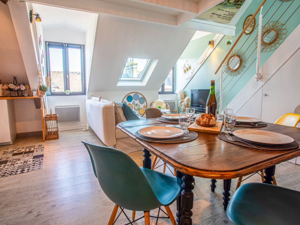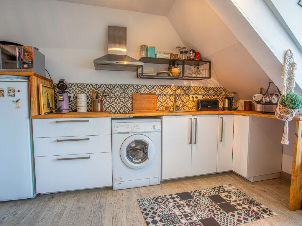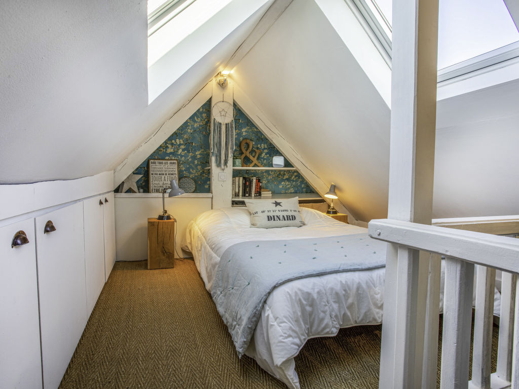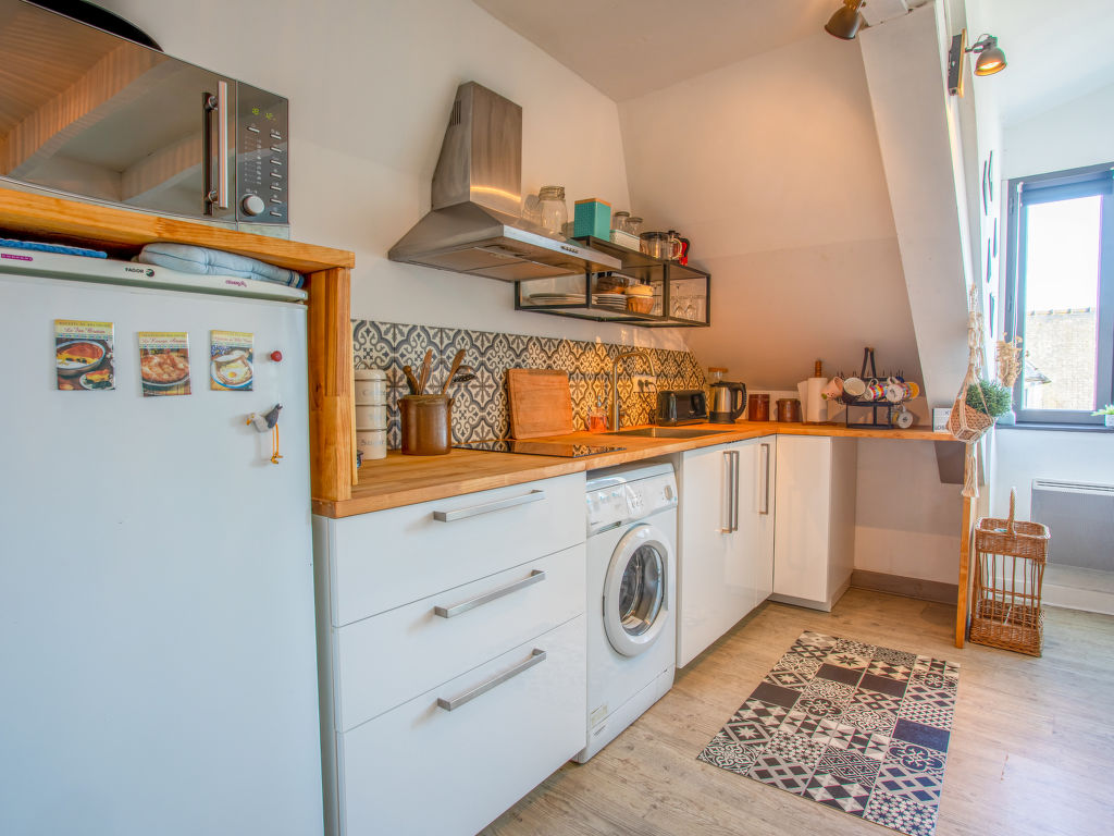2-Zimmer-Wohnung 33 m2 auf 2 Stockwerken im 2. Stock. Hell, abgeschrägt, zweckmässig und geschmackvoll eingerichtet: Wohn-/Esszimmer mit TV (Flachbildschirm). 1 Zimmer mit 2 Betten (90 cm, Länge 190 cm). Offene Küche (Geschirrspüler, 2 Induktionskochplatten, Toaster, Wasserkocher, elektrische Kaffeemaschine, Kombinationsmikrowelle) mit Esstisch. Dusche/WC. Obergeschoss: abgeschrägte Galerie mit 1 franz. Bett (140 cm, Länge 190 cm). Bitte beachten: Nichtraucher-Unterkunft. Rauchmelder, kein Fahrstuhl.
