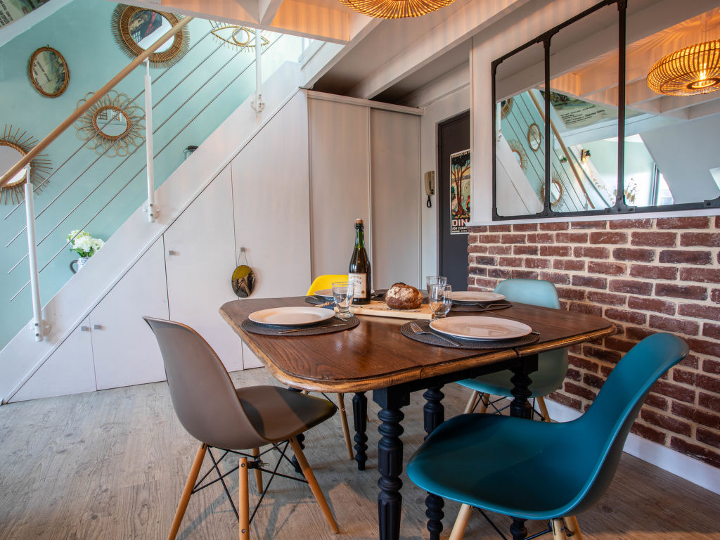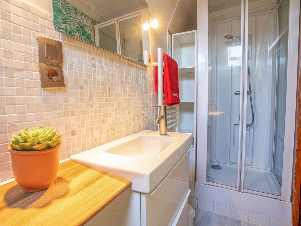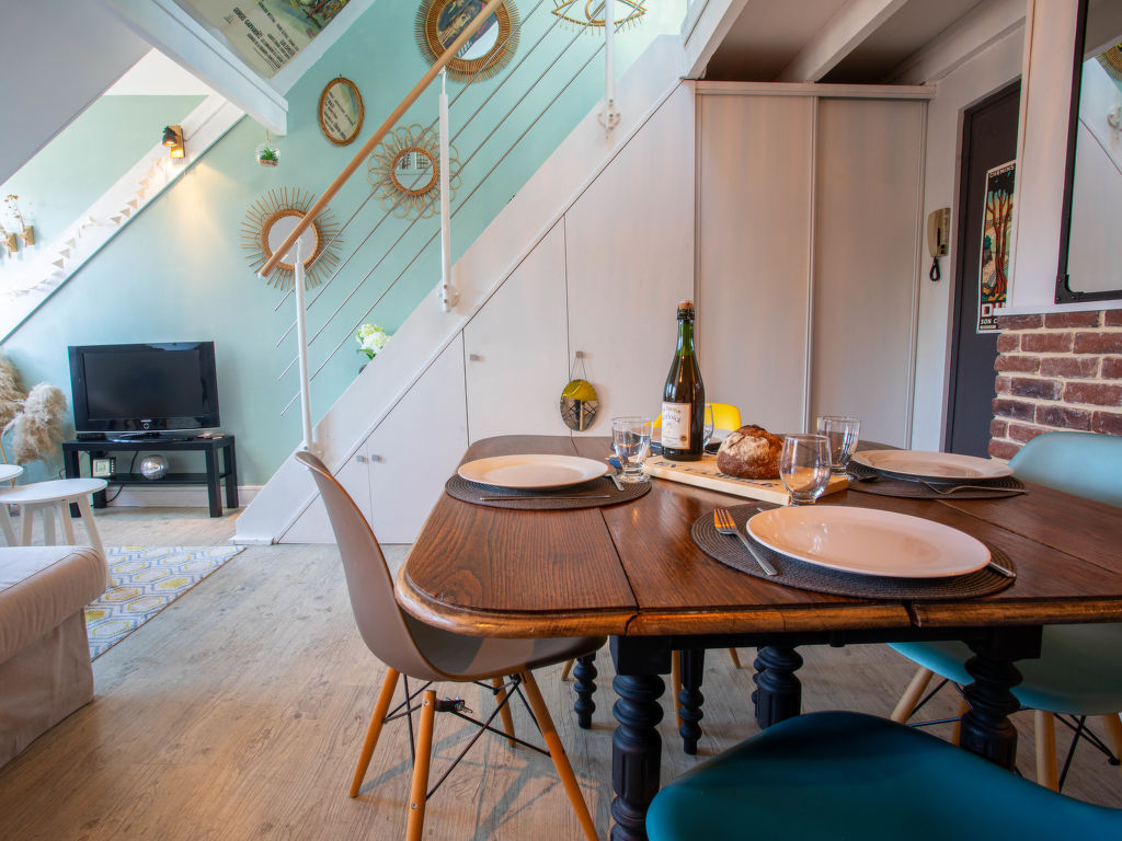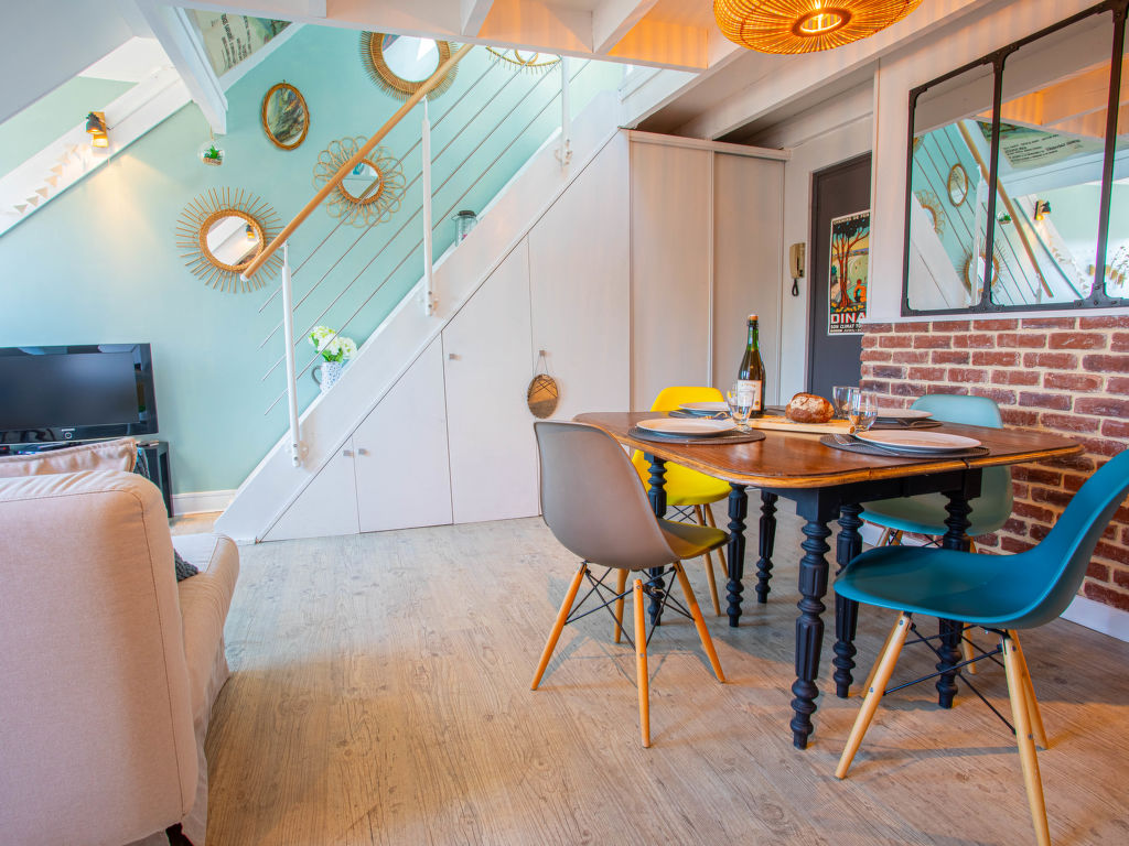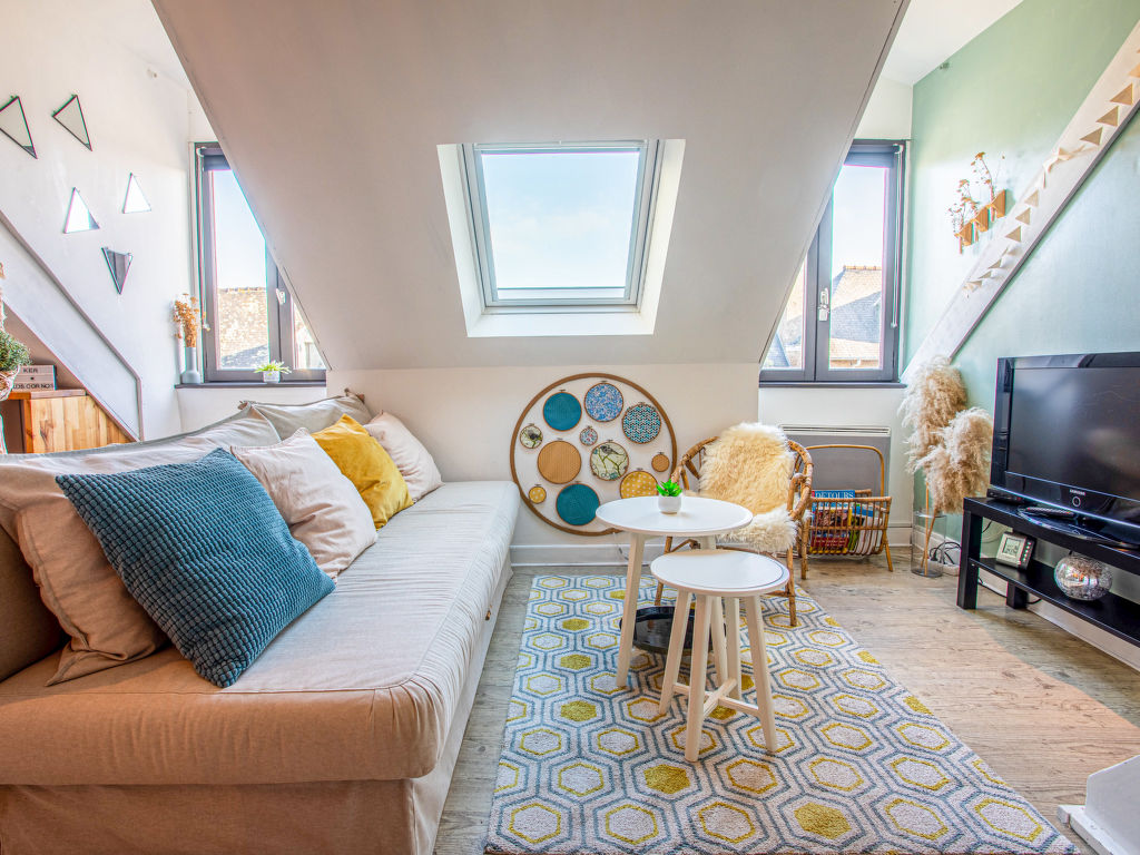 2-Zimmer-Wohnung 33 m2 auf 2 Stockwerken im 2. Stock. Hell, abgeschrägt, zweckmässig und geschmackvoll eingerichtet: Wohn-/Esszimmer mit TV (Flachbildschirm). 1 Zimmer mit 2 Betten (90 cm, Länge 190 cm). Offene Küche (Geschirrspüler, 2 Induktionskochplatten, Toaster, Wasserkocher, elektrische Kaffeemaschine, Kombinationsmikrowelle) mit Esstisch. Dusche/WC. Obergeschoss: abgeschrägte Galerie mit 1 franz. Bett (140 cm, Länge 190 cm). Bitte beachten: Nichtraucher-Unterkunft. Rauchmelder, kein Fahrstuhl.