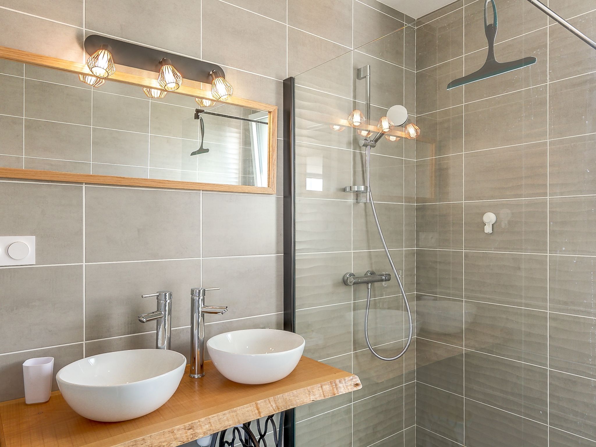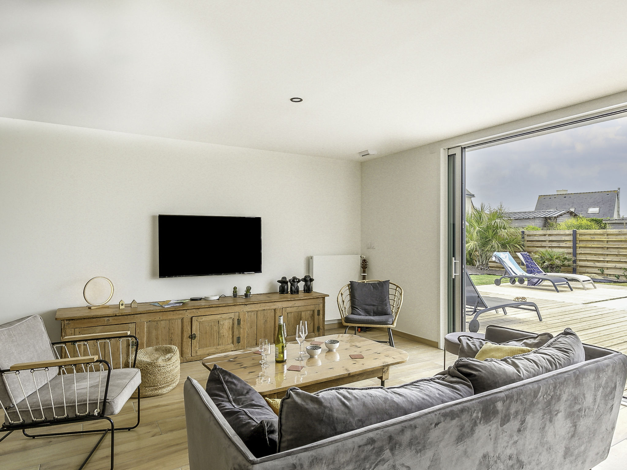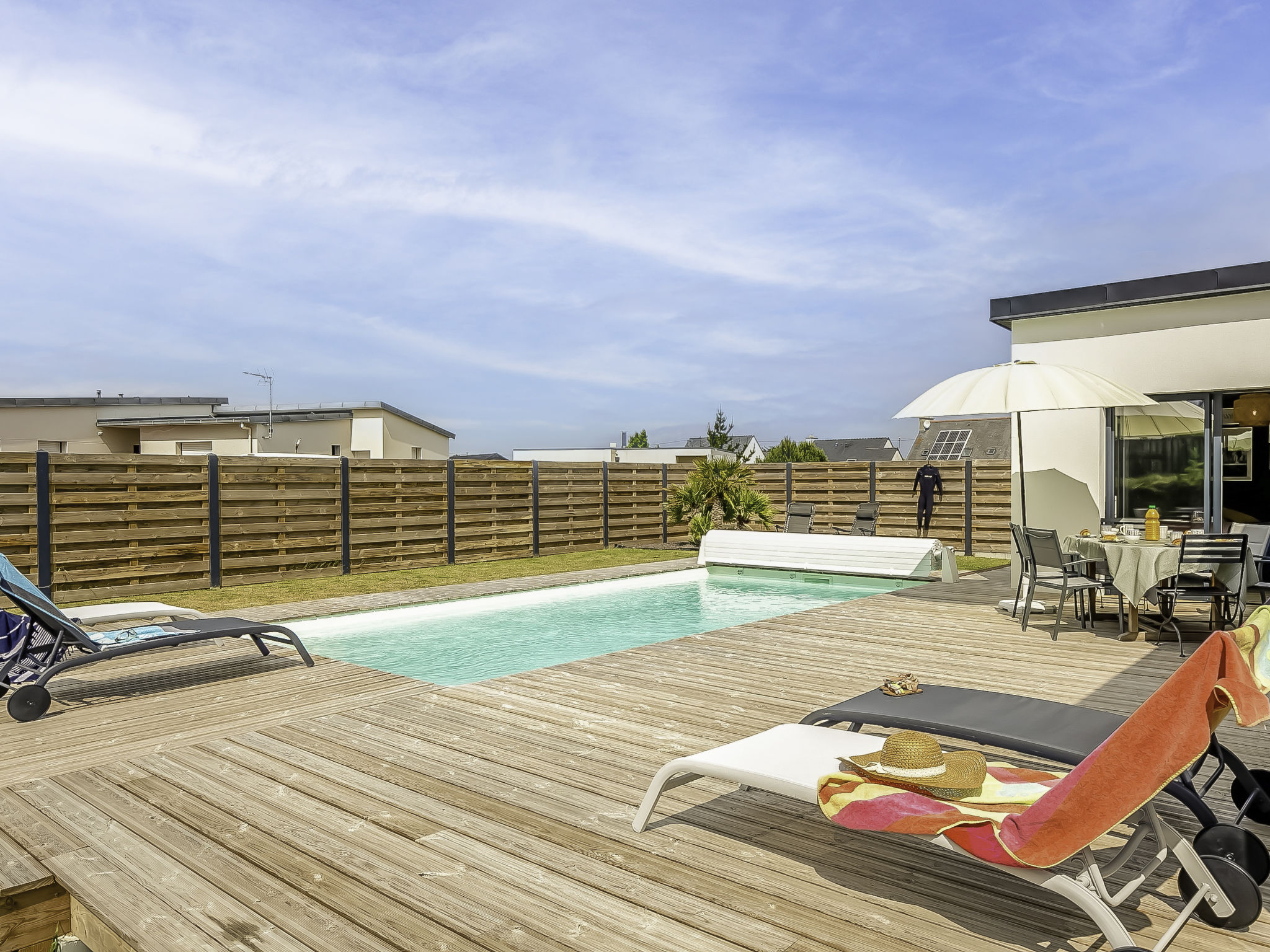 "Les Lagons du Lividic", 5-Zimmer-Haus 117 m2. Modern und geschmackvoll eingerichtet: grosses Wohn-/Esszimmer 53 m2 mit TV (Flachbildschirm). Ausgang zur Terrasse, zum Schwimmbad. 1 Zimmer mit 1 franz. Bett (160 cm, Länge 200 cm), elektrischem Rollladen. Ausgang zur Terrasse. 1 Zimmer mit 1 x 2 Etagenbetten (90 cm, Länge 200 cm), elektrischem Rollladen mit Dusche/WC und Doppelwaschbecken. 1 Zimmer mit 1 franz. Bett (140 cm, Länge 190 cm), elektrischem Rollladen. Ausgang zur Terrasse. 1 Zimmer mit 2 Betten (80 cm, Länge 200 cm), elektrischem Rollladen mit sep. WC, Dusche und Doppelwaschbecken. Grosse, offene Küche (Backofen, Geschirrspüler, 3 Induktionskochplatten, Toaster, Wasserkocher, Tiefkühler, elektrische Kaffeemaschine). G-Heizung. Grosse Terrasse 100 m2, Südlage, Rasen. Terrassenmöbel, Gartengrill (mobil), Liegestühle (8). Zur Verfügung: Waschmaschine, Wäschetrockner, Haartrockner. Internet (Wireless LAN, gratis). Bitte beachten: Nichtraucher-Haus. 1 Haustier/Hund erlaubt. Rauchmelder, Feuerlöscher. Das Schlafzimmer mit dem Bett 160x200 und die Dusche/Wc in diesem Teil des Hauses sind für Rollstuhlfahrer geeignet. Inserat einer Privatperson nach Artikel 155, IV, CGI.