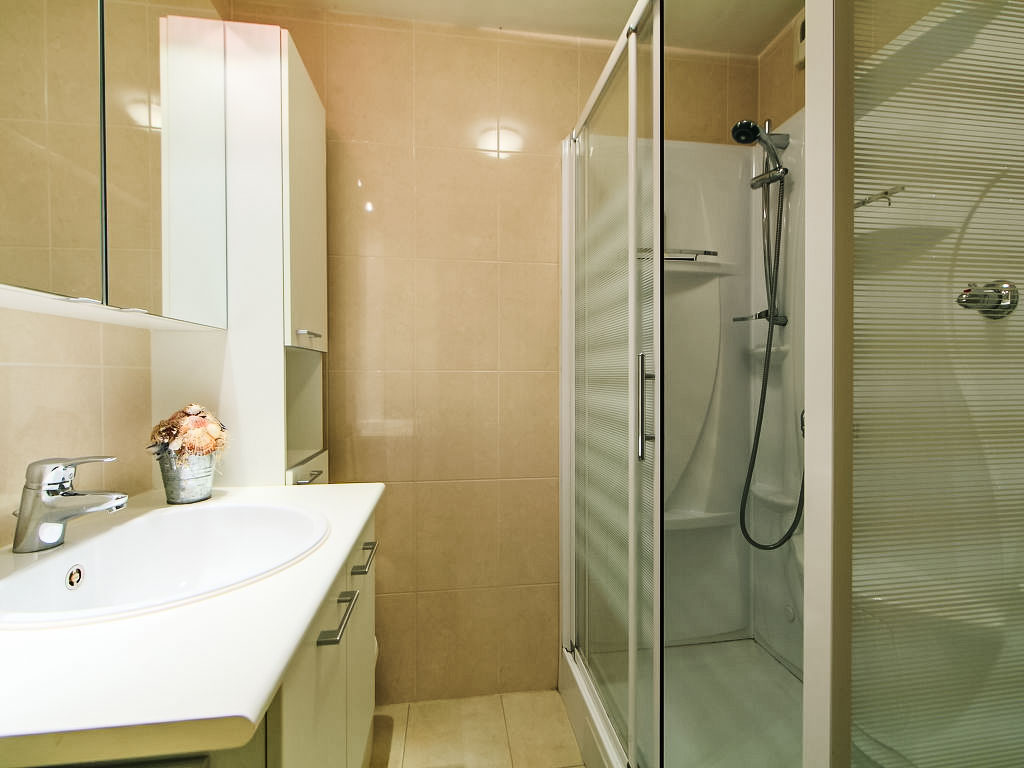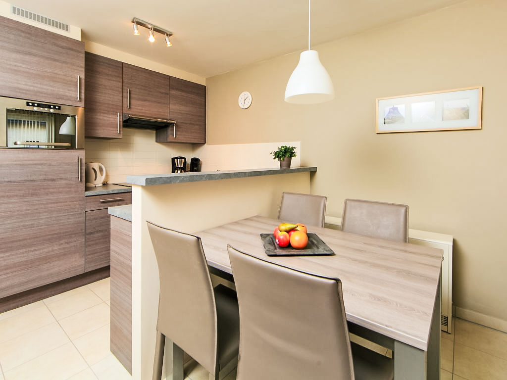 "Appartement 001", 3-Zimmer-Wohnung 55 m2. Komfortabel eingerichtet: Wohn-/Esszimmer mit Esstisch, TV und CD. Ausgang zur Terrasse. 1 Doppelzimmer mit 1 Doppelbett (160 cm, Länge 200 cm). 1 Doppelzimmer mit 1 x 2 Etagenbetten (90 cm, Länge 200 cm). Offene Küche (Backofen, 4 Glaskeramikherd Platten, Wasserkocher, Mikrowelle, Tiefkühler, elektrische Kaffeemaschine). Dusche/WC. Terrassenmöbel. Zur Verfügung: Haartrockner. Garage Nr. 6 auf dem Grundstück. Bitte beachten: Nichtraucher-Haus.