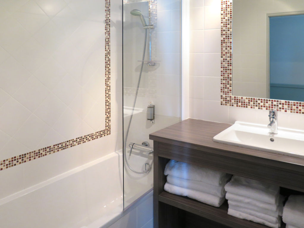 2-Zimmer-Wohnung, 2. Etage, ca. 60 m². Wohn-/Schlafraum mit Doppelbettcouch, Sessel, Essplatz und Balkonausgang. Küche (4 Induktionsfelder, Mikrowelle, Geschirrspüler, Kühlschrank, Kaffeemaschine, Kaffeekapselmaschine, Wasserkocher, Toaster). Schlafzimmer mit Doppelbett (1,80 m breit) oder 2 Einzelbetten sowie Schlafsessel. Bad/WC. SepWC.