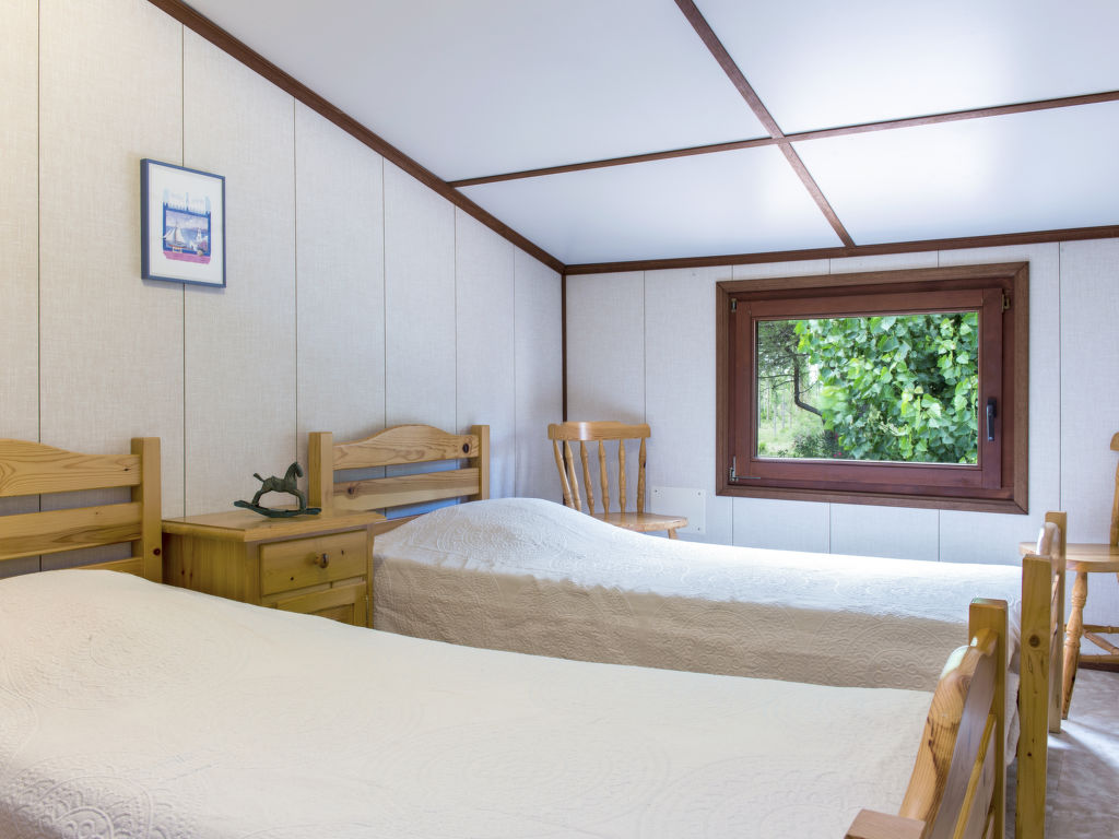 3-Zimmer-Haus, 2 Etagen, ca. 55 m². Erdgeschoss: Wohn-/Schlafraum mit Doppelbettcouch, Essplatz, Kochnische. Bad (kleine Wanne) oder Dusche. Sep.WC. Vom Wohnraum teils steile Treppe ohne Geländer in die 1. Etage (Dachschräge, eingeschränkte Stehhöhe): Zweibettzimmer (Betten 0,80 m breit) oder Schlafzimmer mit Etagenbett (0,80 m breit). Schlafzimmer mit franz. Bett.