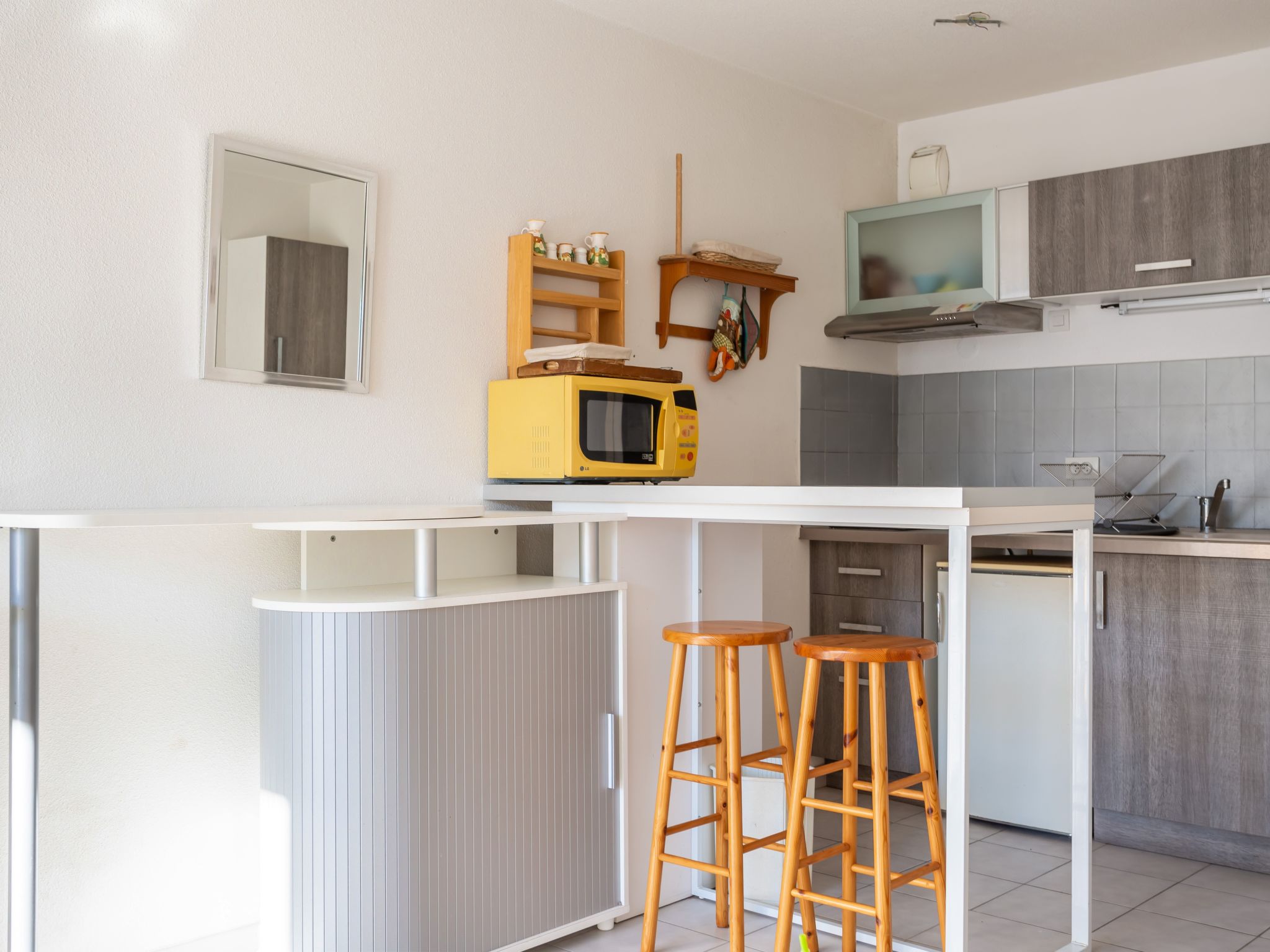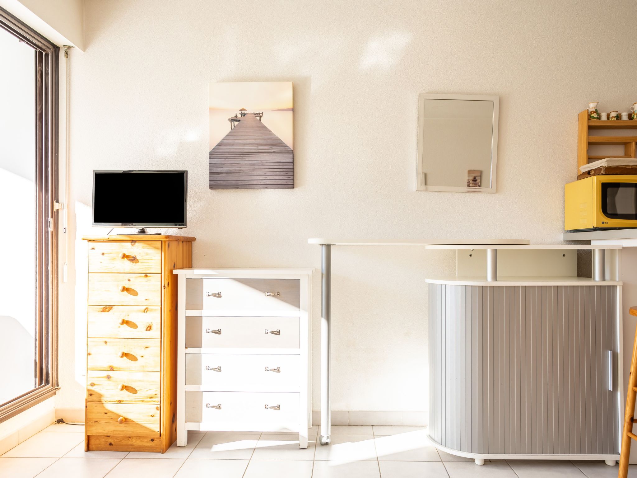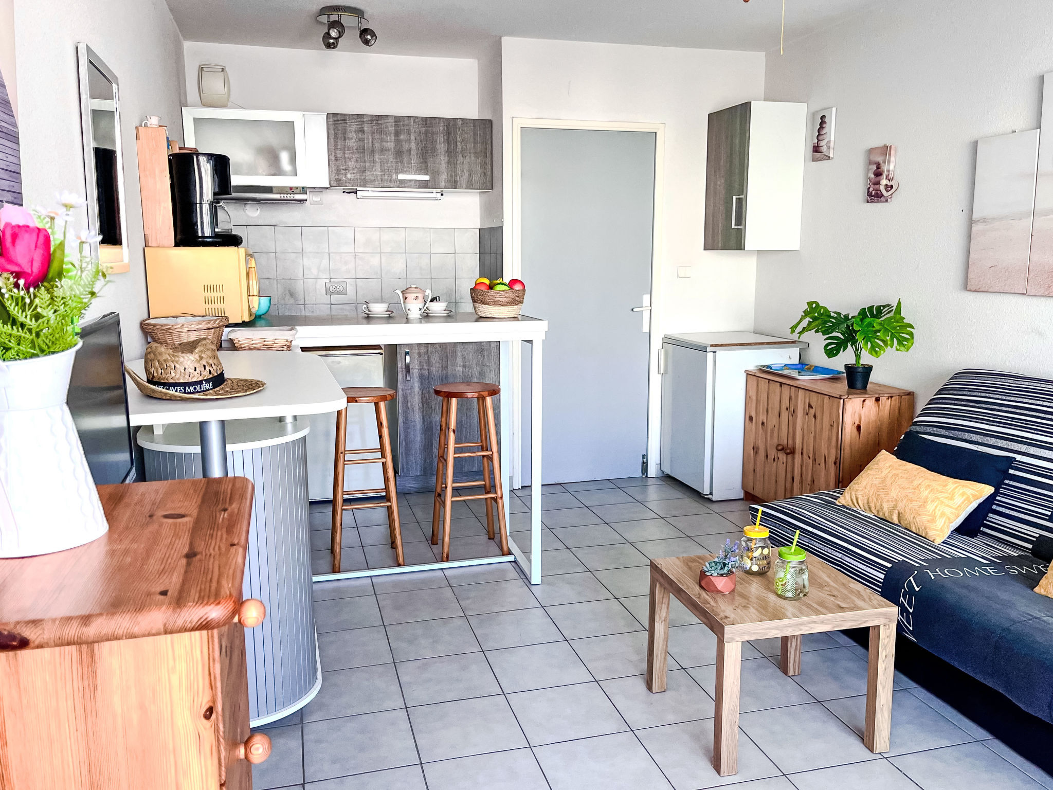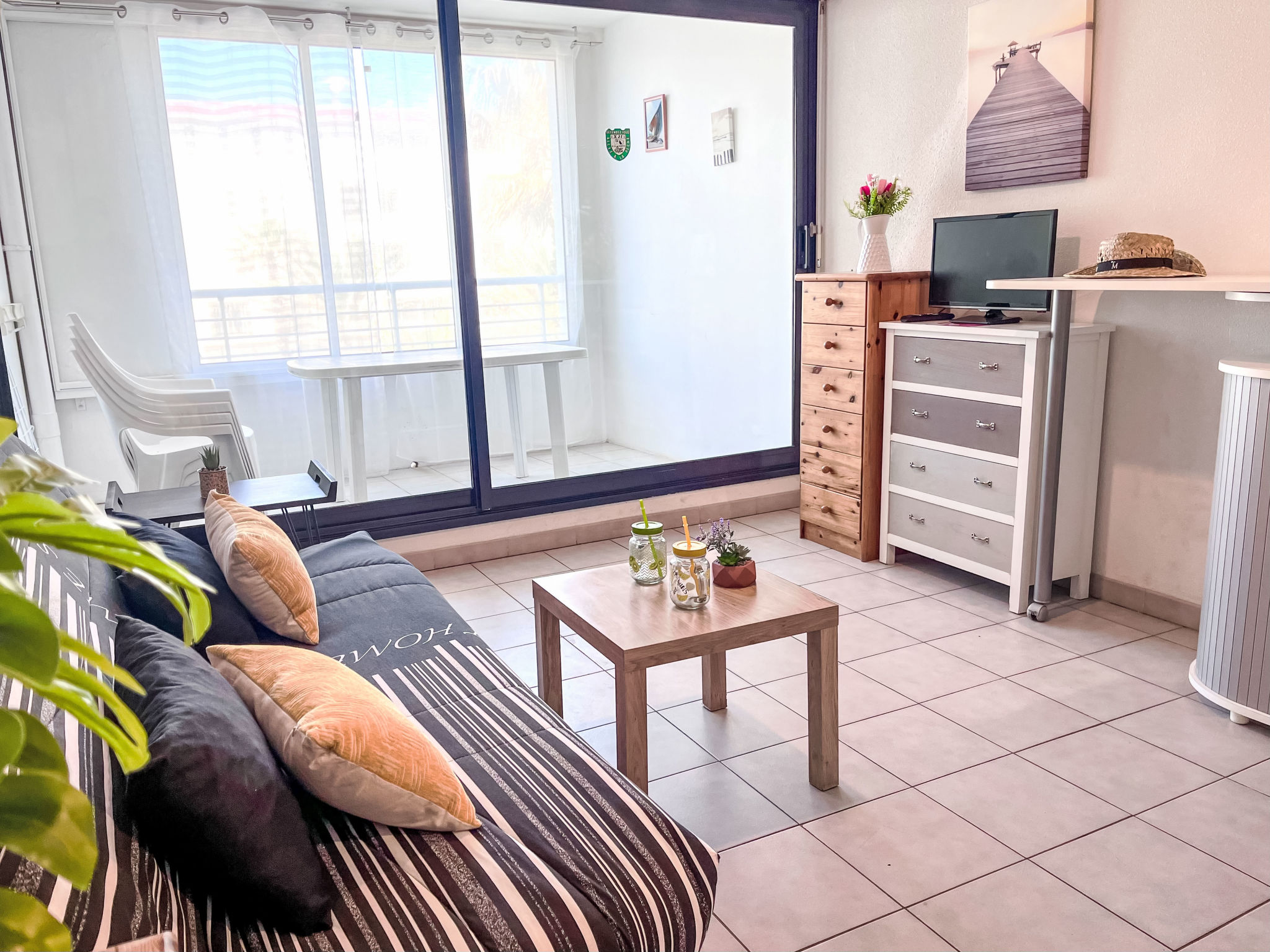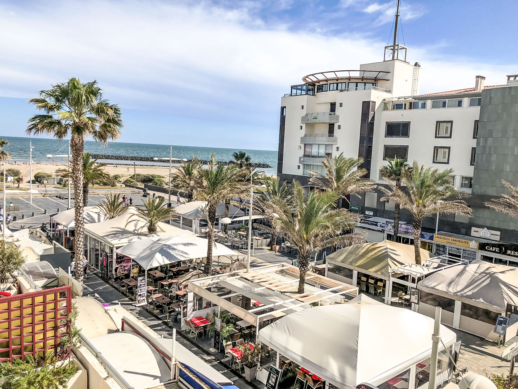 Residenz "Le Sunset/Cap Sud". Im Ortsteil Rochelongue, 230 m vom Meer, 230 m vom Strand. Zur Mitbenutzung: Garten (eingezäunt), Schwimmbad (12 x 6 m, 40 - 175 cm tief, saisonale Verfügbarkeit: 01.Jul.-31.Aug.). Kinderspielplatz. In der Anlage: Fahrstuhl. Öffentliche Parkplätze 50 m auf der Strasse. Einkaufsgeschäft, Lebensmittelgeschäft, Restaurant 350 m, Bäckerei 110 m, Sandstrand "Rochelongue" 230 m. Sporthafen 3 km, Golfplatz (27 Loch) 1.5 km, Tennis 3 km, Reitstall 1.4 km. Nahe gelegene Sehenswürdigkeiten: Aqualand 1.7 km, Ile des Loisirs 1.9 km, Musée de l'Ephèbe 3 km, Casino 2.5 km, Luna Park 2.4 km, Accrobranche 4.7 km.