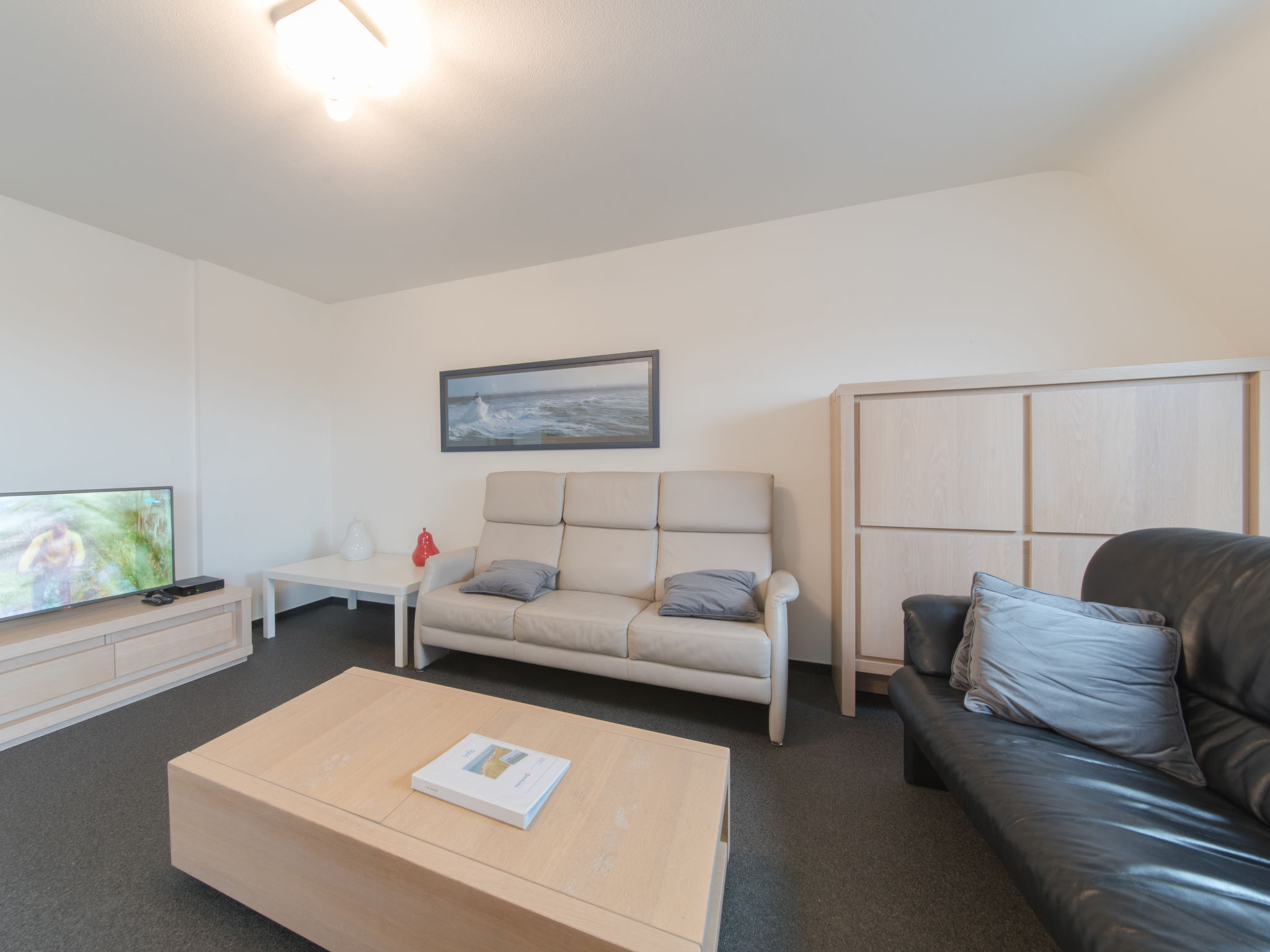 "Duplex", 3-Zimmer-Wohnung 106 m2 im 5. Stock. Komfortabel eingerichtet: Eingang mit sep. WC. Offenes Wohn-/Esszimmer mit Esstisch, Digital-TV und E-Heizung. Ausgang zum Balkon. Offene Küche (Backofen, Geschirrspüler, 4 Glaskeramikherd Platten, Mikrowelle, Tiefkühler, elektrische Kaffeemaschine). Obergeschoss: 1 grosses Doppelzimmer mit 1 Doppelbett (160 cm, Länge 200 cm). 1 grosses Zimmer mit 3 Betten (90 cm, Länge 200 cm). Bad/Dusche/WC, Doppelwaschbecken. Boiler (250 Liter). Balkon 5 m2, Nordwestlage. Sicht auf das Meer. Zur Verfügung: Internet (Wireless LAN, gratis). Bitte beachten: Nichtraucher-Haus.