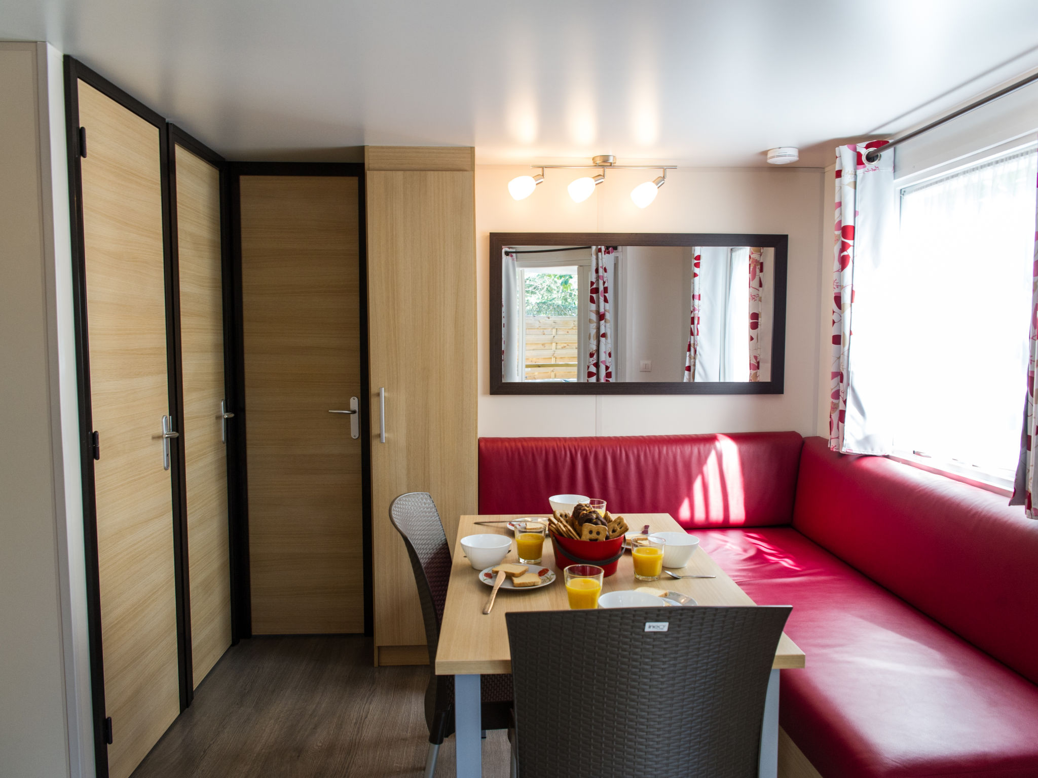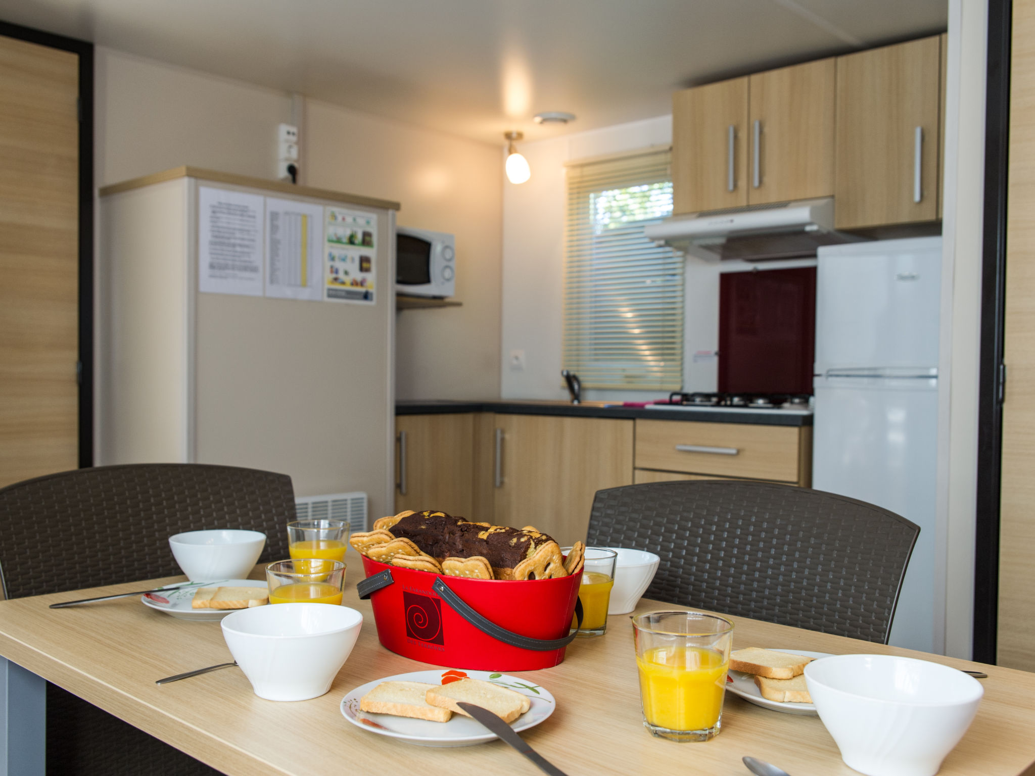"Camping La Plage (AGL273)", 3-Zimmer-Mobilheim 28 m2. Zweckmässig eingerichtet: Wohn-/Esszimmer mit TV. 1 Zimmer mit 1 franz. Bett. 1 Zimmer mit 2 Betten (80 cm). Kochnische (4 Flammen, Mikrowelle, Tiefkühler, elektrische Kaffeemaschine). Dusche, sep. WC. E-Heizung, Klimaanlage. Terrasse teilweise überdacht. Terrassenmöbel. Zur Verfügung: Kinderhochstuhl, Babybett bis 2 Jahre (extra). Internet (Wireless LAN, extra). Maximal 2 Haustiere/Hunde erlaubt.
