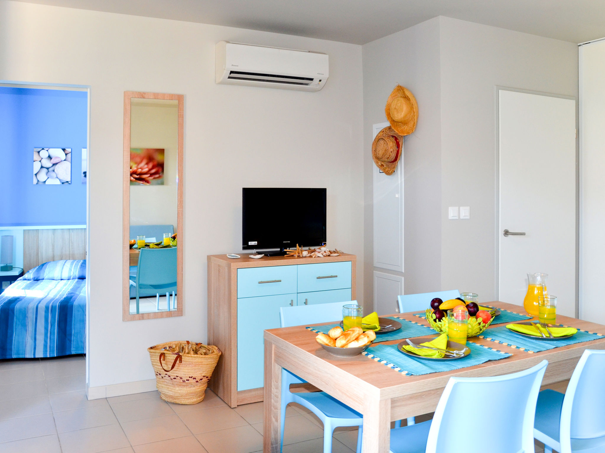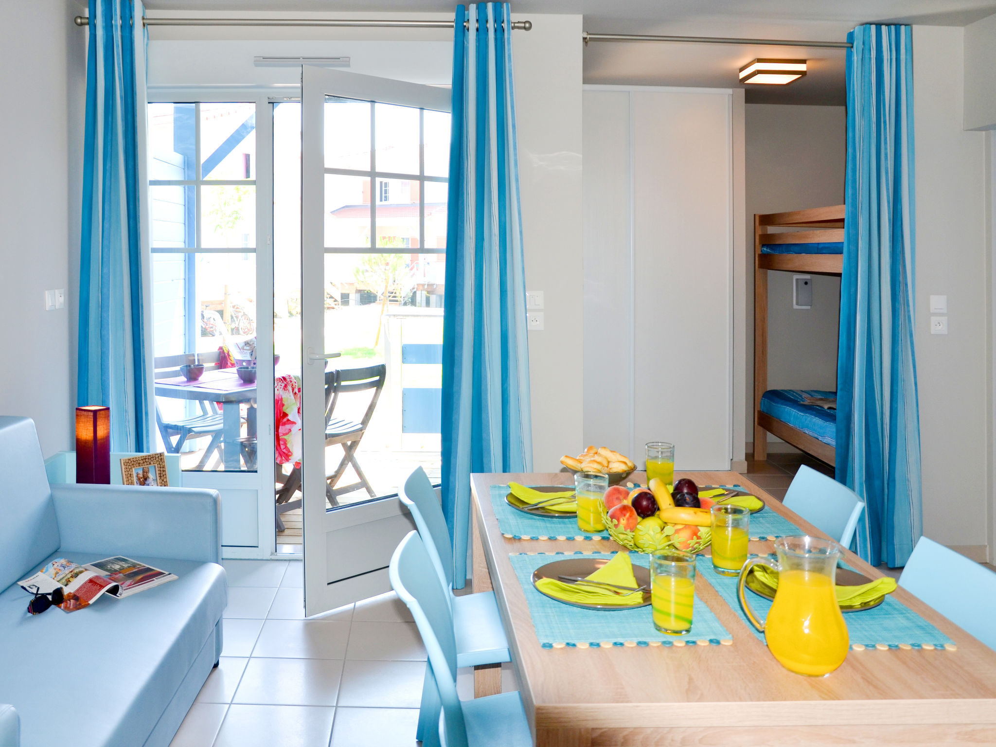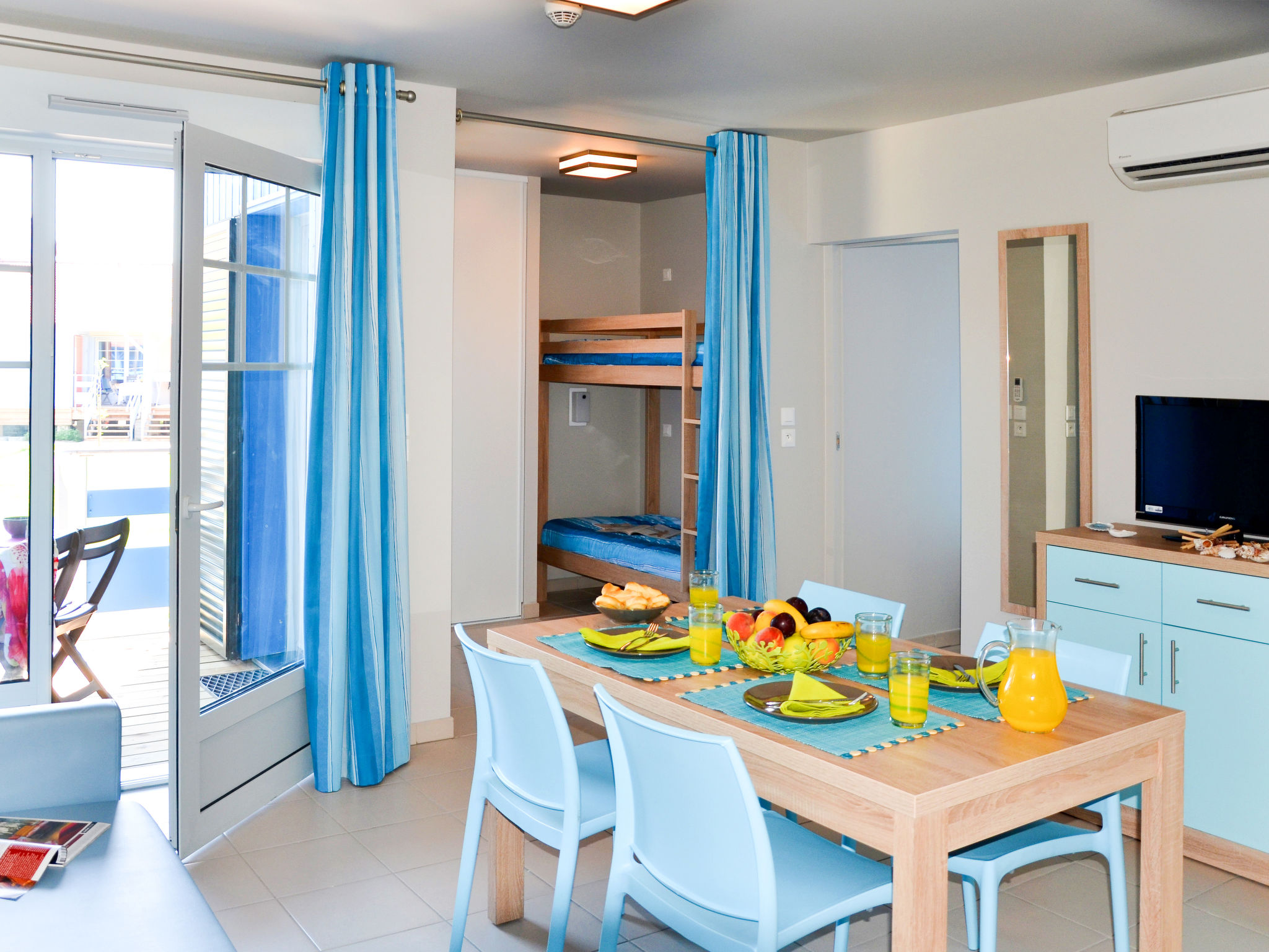 "La Grenadine (MPE121)", 2-Zimmer-Reihenhaus 38 m2. Objekt geeignet für 4 Erwachsene + 2 Kinder. Zweckmässig und modern eingerichtet: Wohn-/Schlafzimmer mit 1 Doppeldiwanbett, Esstisch, TV mietbar und Klimaanlage. 1 Zimmer mit Schiebetür mit 1 franz. Bett (160 cm). Schlafnische mit Vorhang mit 1 x 2 Etagenbetten (80 cm). Kochnische (Geschirrspüler, 4 Glaskeramikherd Platten, Toaster, Wasserkocher, Mikrowelle, Tiefkühler, elektrische Kaffeemaschine). Dusche/WC. E-Heizung. Kleine Terrasse überdacht. Terrassenmöbel. Zur Verfügung: Kinderhochstuhl, Babybett (extra). Internet (Wireless LAN, extra). Bitte beachten: Nichtraucher-Unterkunft. Maximal 2 Haustiere/Hunde erlaubt. Rauchmelder. Bedingt durch das Coronavirus (COVID-19) ergreift diese Unterkunft Maßnahmen, um die Sicherheit der Gäste und Mitarbeiter zu gewährleisten. Einige Services und Einrichtungen können daher nur eingeschränkt bzw. teilweise auch gar nicht nutzbar sein.