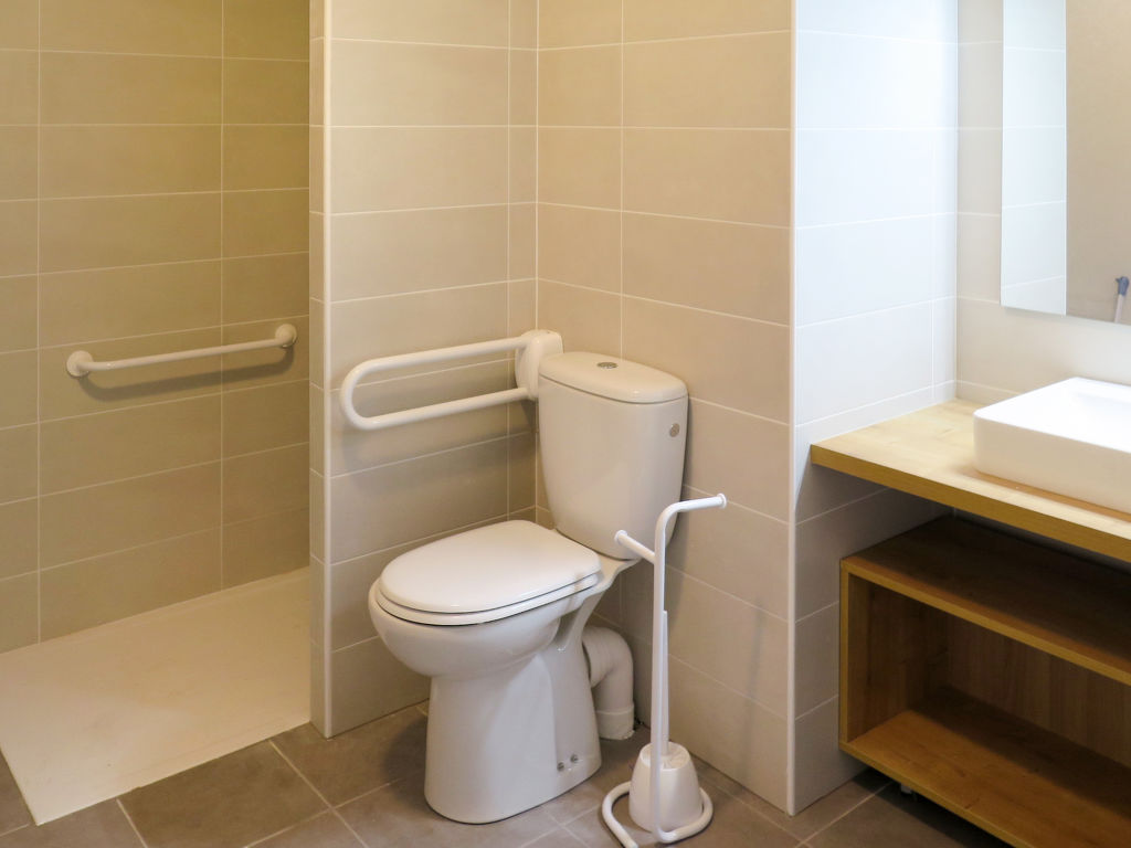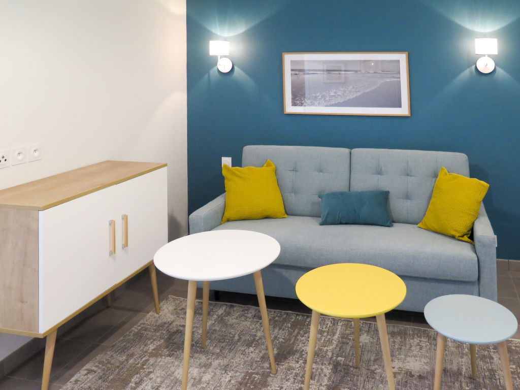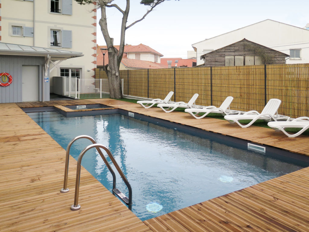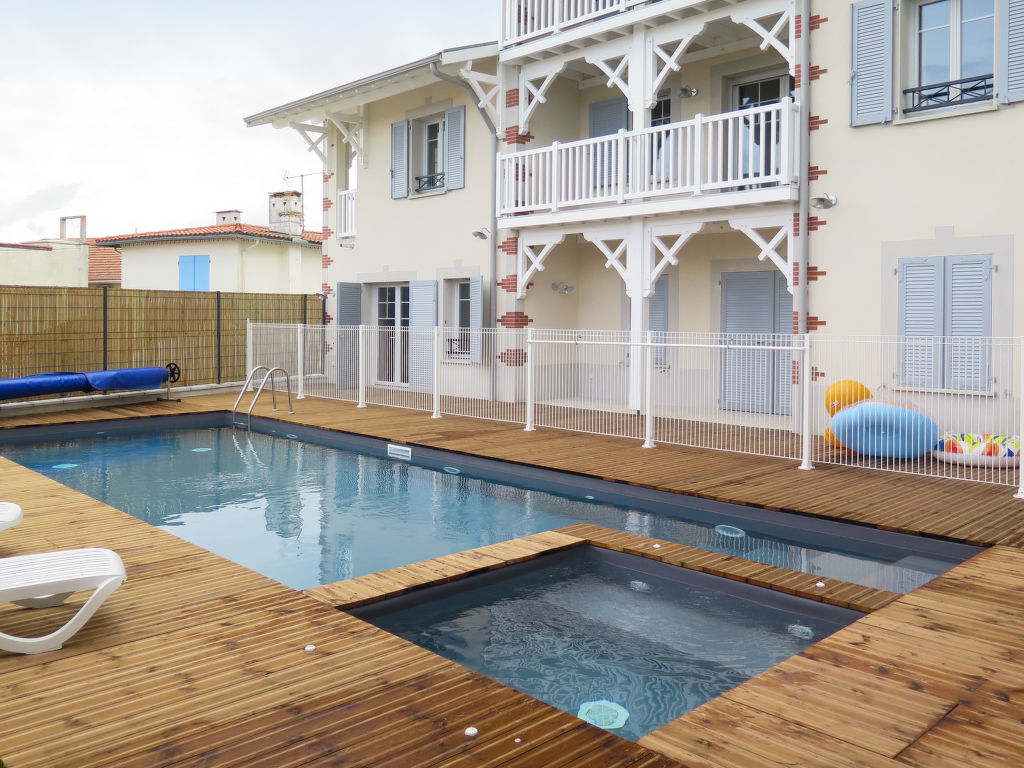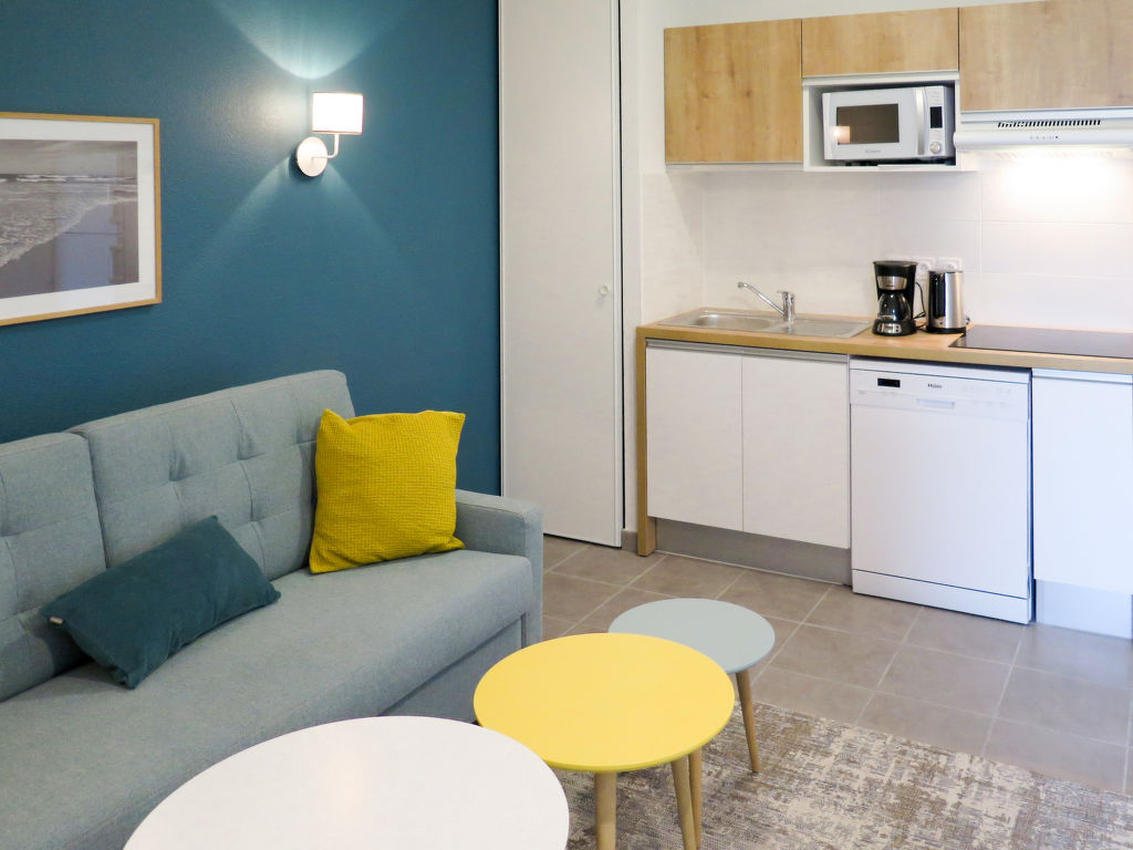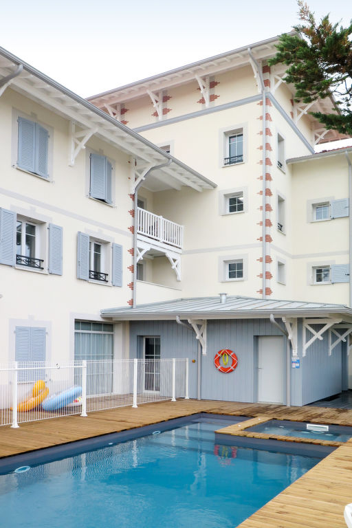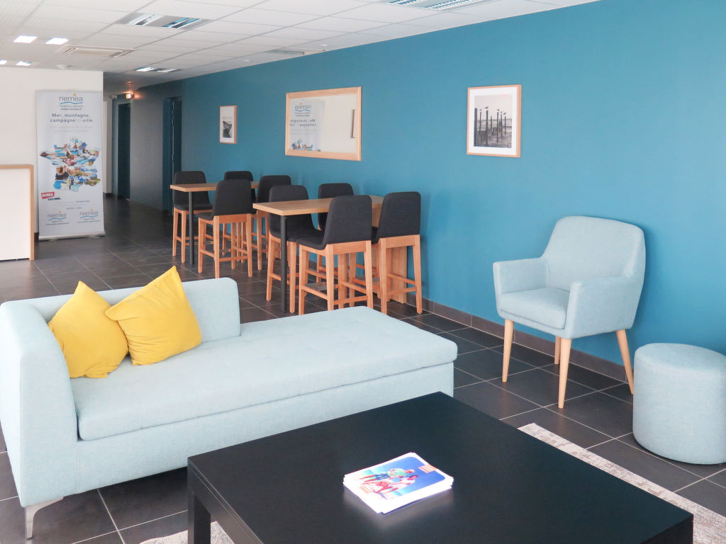 Kleine Ferienanlage "Le Marché de la Plage", auf 4 Stockwerken, Baujahr 2017. 37 Wohnungen in der Residenz. Im Ortszentrum von Mimizan-Plage, 6 km vom Zentrum von Mimizan-Bourg, 70 km vom Zentrum von Arcachon, 250 m vom Meer. Zur Mitbenutzung: Schwimmbad beheizt, eingezäunt (9 x 4 m, 140 cm tief, saisonale Verfügbarkeit: 25.Apr.-26.Sep.) mit Innentreppe. Aussendusche, Sprudelbad, Terrasse. In der Anlage: Empfang, Internetzugang, Wireless LAN, Fitnessraum, Fahrstuhl, Einstellraum für Fahrräder, Waschmaschine, Wäschetrockner (zur Mitbenutzung, extra). Frühstück möglich (extra). Gemeinschaftsgarage (extra), öffentliche Parkplätze. Einkaufsgeschäft 50 m, Supermarkt 250 m, Restaurant 50 m, Sandstrand 250 m. Das Foto ist nur ein Wohnungsbeispiel. Die Mietobjekte können sich in Wohnfläche, Raumaufteilung, Ausstattung und Einrichtung unterscheiden.