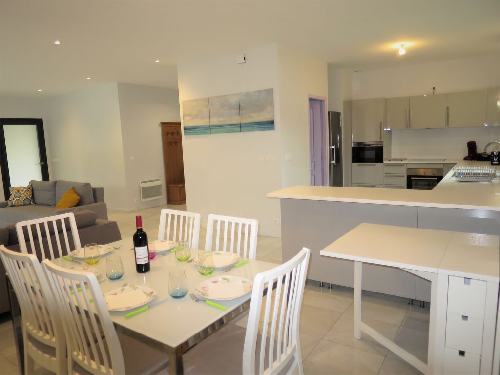 4-Zimmer-Haus, ca. 120 m². Wohnraum mit Sitzgruppe, Pelletkaminofen, Essplatz und Terrassenausgang, durch Bartheke (3 Barhocker) abgeteilte Küche (4 Induktionsfelder, Backofen, Mikrowelle, Geschirrspüler, Kühlschrank, Gefrierschrank, Kaffeemaschine, Wasserkocher, Toaster). Schlafzimmer mit franz. Bett (1,60 m breit). 2 Zweibettzimmer. Dusche/Doppelwaschbecken/WC. Sep.WC. Inserat einer Privatperson nach Artikel 155, IV, CGI.