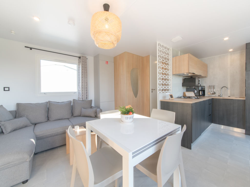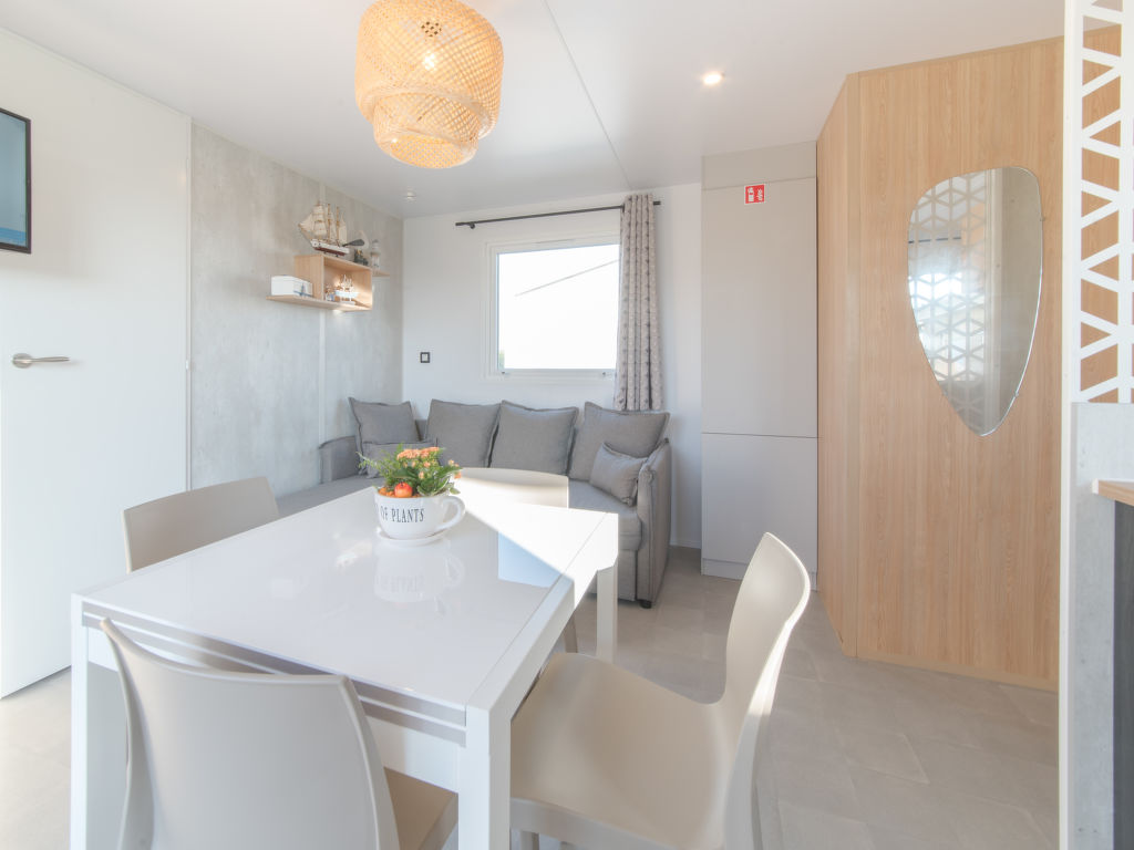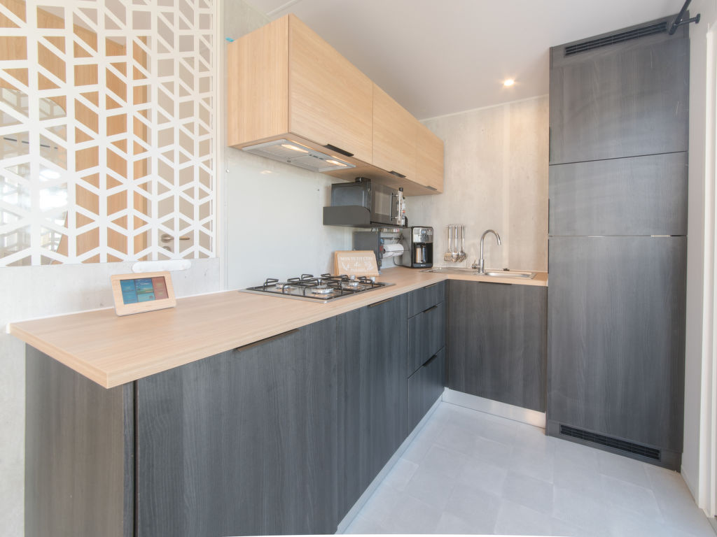 4-Zimmer-Bungalow 42 m2. Zweckmässig und gemütlich eingerichtet: offenes Wohn-/Esszimmer mit Esstisch und Digital-TV. 1 Zimmer mit 1 Doppelbett (160 cm, Länge 200 cm), Dusche/WC. 2 Zimmer, jedes Zimmer mit 2 Betten (80 cm, Länge 200 cm). Offene Küche (Geschirrspüler, Gasherd, Toaster, Wasserkocher, Tiefkühler, elektrische Kaffeemaschine, Kombinationsmikrowelle). Dusche, sep. WC. E-Heizung. Terrasse 24 m2. Terrassenmöbel, Gartengrill. Zur Verfügung: Kinderhochstuhl, Babybett bis 2 Jahre, Haartrockner. Internet (Wireless LAN, gratis). Parkplatz (extra). Bitte beachten: Nichtraucher-Haus. Rauchmelder, Feuerlöscher.