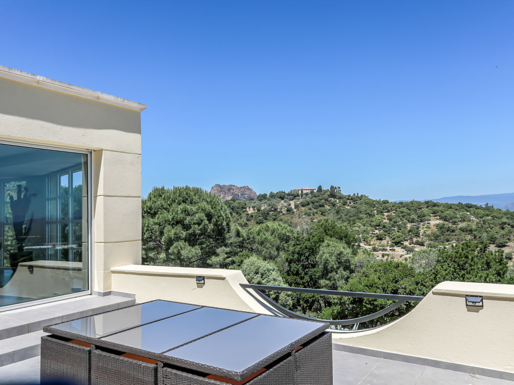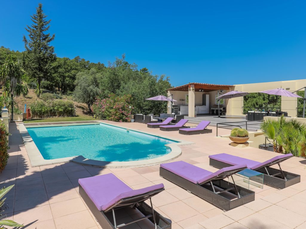Modernes Einfamilienhaus "Villa Les Toscanes", auf 2 Stockwerken, umgeben von Bäumen. Mietobjekt bestehend aus Haupt- und Nebengebäude, ausserhalb des Ortes Roquebrune sur Argens, ruhige, sonnige, erhöhte Lage auf einem Hügel, in einem Wohnquartier, verkehrsberuhigte Zone, im Grünen. Zur Alleinbenutzung: Naturgarten 1 ha (eingezäunt), Schwimmbad eckig, beheizt, nicht einsehbar (12 x 6 m, 60 - 170 cm tief, 15.05.-15.10.) mit Rollladenabdeckung und Alarmanlage. Aussendusche, Poolhaus, Terrasse (170 m2), Grill. Im Hause: Alarmanlage. Wohnungsreinigung 1 mal wöchentlich möglich (extra). Einkaufsgeschäft 3 km, Lebensmittelgeschäft 3 km, Supermarkt 5 km, Restaurant 3 km, Bar 3 km, Bäckerei 3 km, Sandstrand "Saint Aygulf" 15 km, See Lac de l'Arèna 4 km. Jacht-Hafen 15 km, Golfplatz (18 Loch) 10 km, Reitstall 7 km, Sportzentrum 4 km, Wanderwege ab Haus 100 m. Nahe gelegene Sehenswürdigkeiten: Base Nature du Rocher 4 km, Roquebrune sur Argens 3 km, Saint Aygulf 15 km, Les Issambres 20 km, Sainte Maxime 24 km, Saint Tropez 40 km. Wandergebiete: Col de Valdingarde 5 km. Bitte beachten: Fahrzeug empfohlen. Für Kleinkinder nicht geeignet. Der Besitzer akzeptiert keine Jugendgruppen. Die Residenz wird durch elektrische Tore geschlossen. Dieses Haus besteht aus zwei Gebäuden (Zugang von aussen), insgesamt 5 Zimmer – 2 Schlafzimmer und 1 Badezimmer im Nebengebäude. Bei einem Aufenthalt ab 14 Nächten wird vom Eigentümer eine Reinigung, in der Mitte des Aufenthalts, angeboten (Aufpreis).