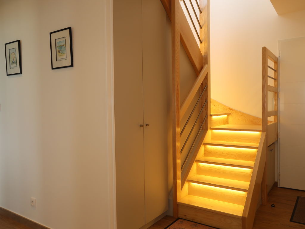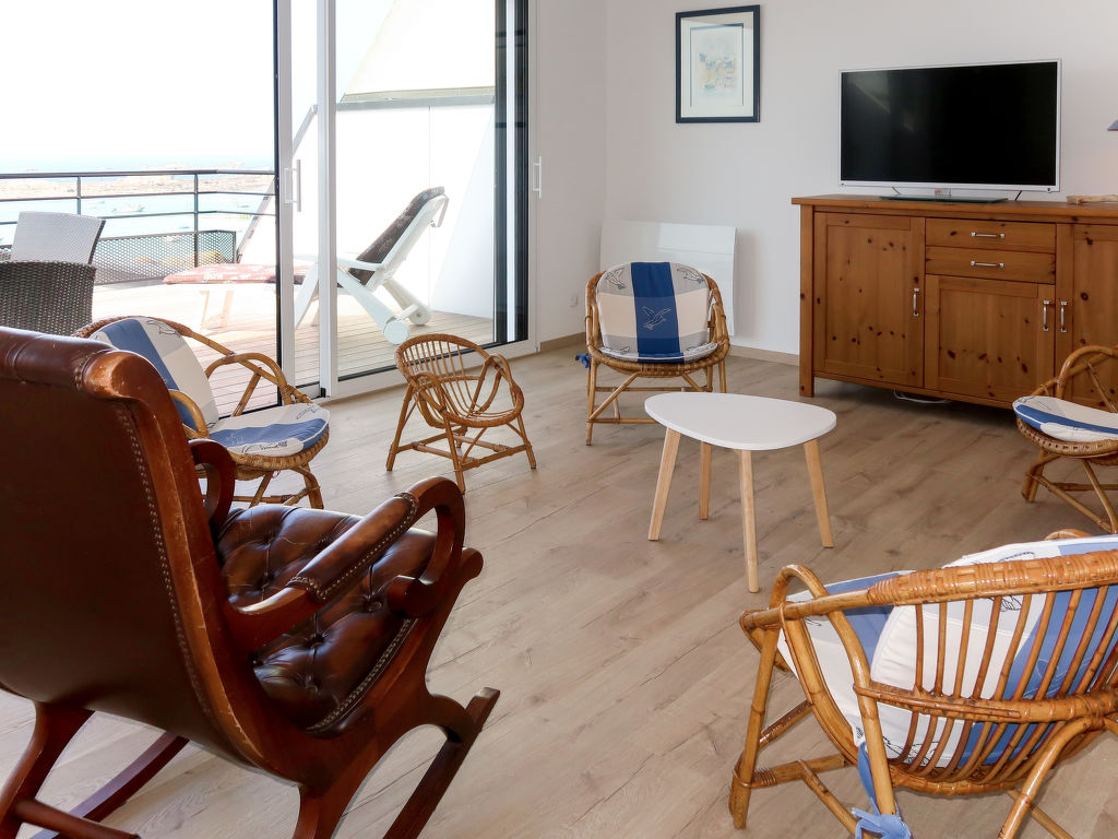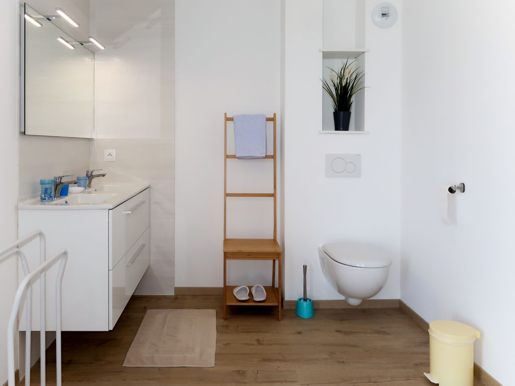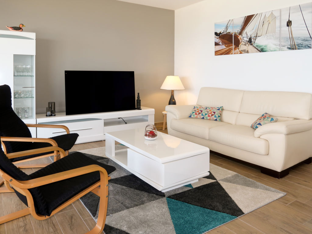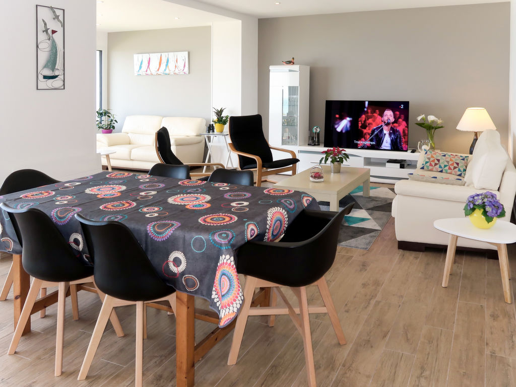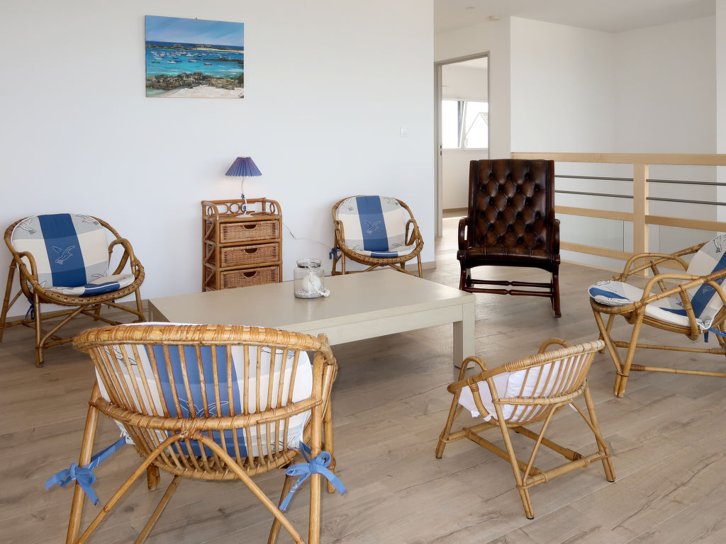 4½-Zimmer-Haus, 2 Etagen, ca. 130 m². Erdgeschoss: Wohnraum mit 2 Sitzgruppen, Essplatz, große Fensterfront zum Meer und Terrassenausgang. Zum Wohnraum offene Küche (4 Ceranfelder, Backofen, Mikrowelle, Geschirrspüler, Kühl-/Gefrierkombination, Kaffeemaschine, Kaffeepadmaschine, Wasserkocher, Toaster). Schlafzimmer mit franz. Bett (1,60 m breit), Dusche/WC und Terrassenausgang. Sep.WC. Obergeschoss: Offene Galerie mit Sitzgruppe und Balkonausgang. Zweibettzimmer (Betten zusammenstellbar). Schlafzimmer mit franz. Bett (1,60 m breit). Dusche/Doppelwaschbecken/WC. Inserat einer Privatperson nach Artikel 155, IV, CGI.