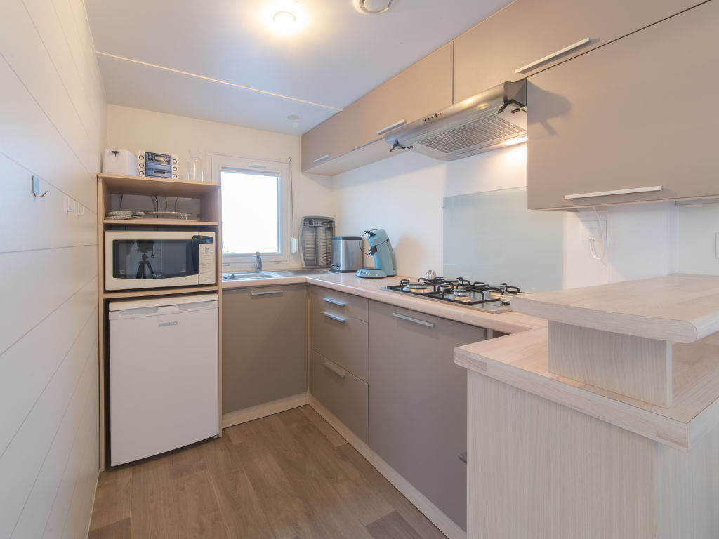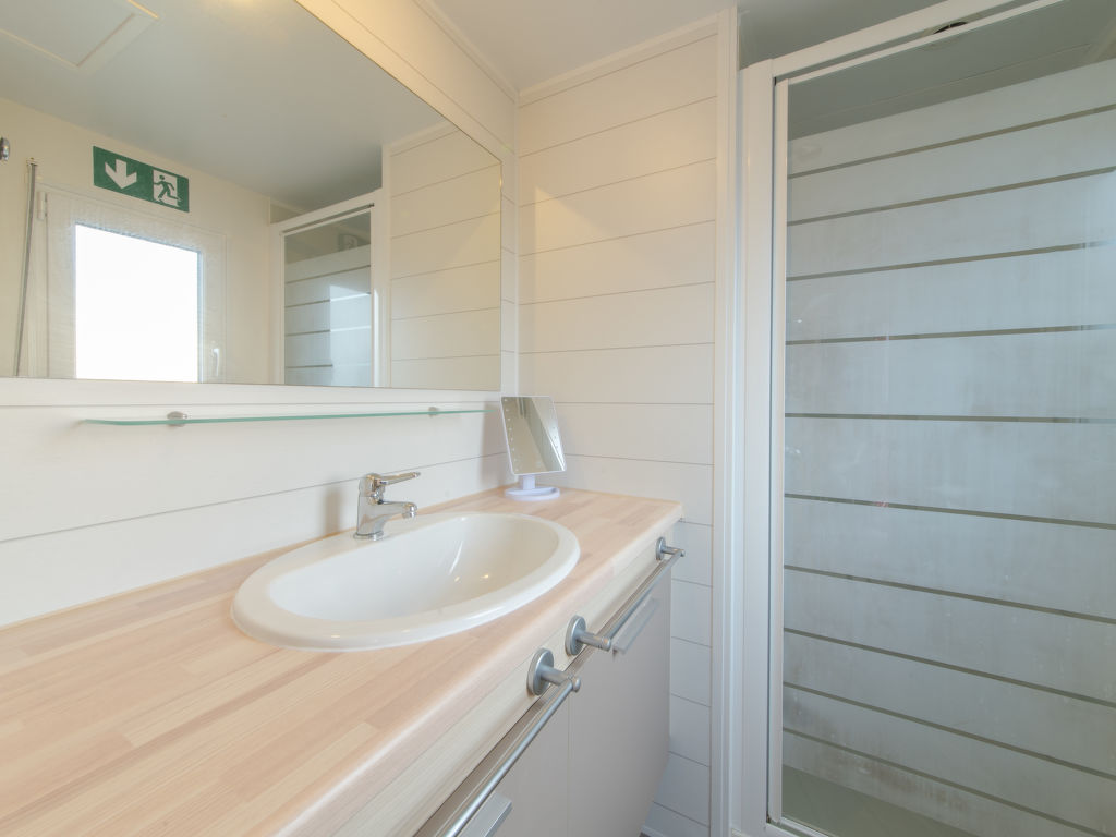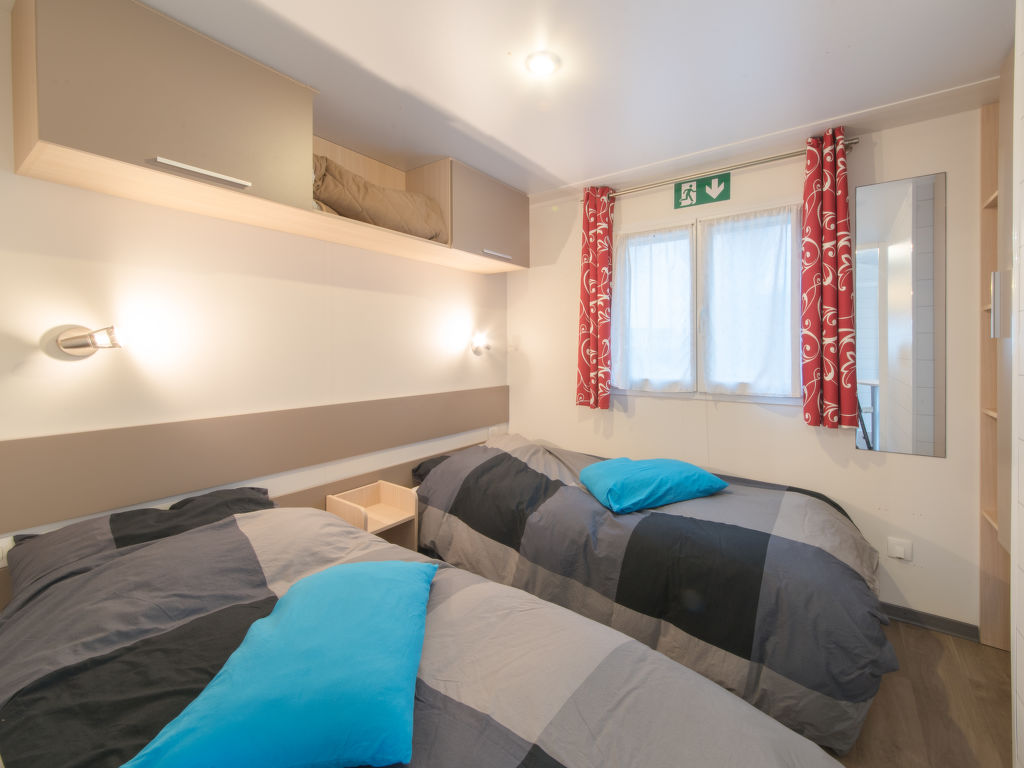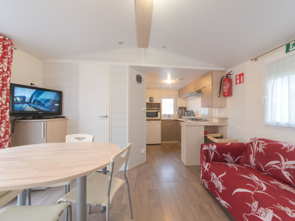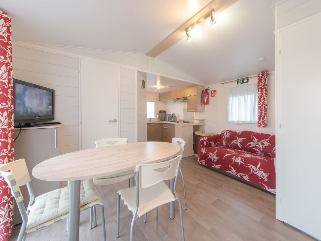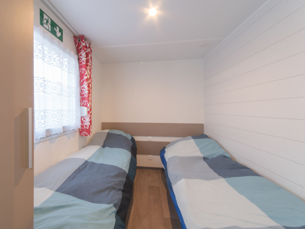 "Savanah", 3-Zimmer-Mobilheim 34 m2. Zweckmässig und komfortabel eingerichtet: Wohn-/Esszimmer mit Digital-TV, Internationale TV-Sender und Flachbildschirm. 2 Zimmer, jedes Zimmer mit 2 Betten (80 cm, Länge 200 cm). Offene Küche (4 Kochplatten, elektrische Kaffeemaschine). Dusche, sep. WC. E-Heizung. Terrasse 10 m2, Garten 20 m2. Terrassenmöbel. Zur Verfügung: Internet (Wireless LAN, gratis). Parkplatz (extra, 1 Auto). Bitte beachten: Nichtraucher-Haus. Rauchmelder, Feuerlöscher.