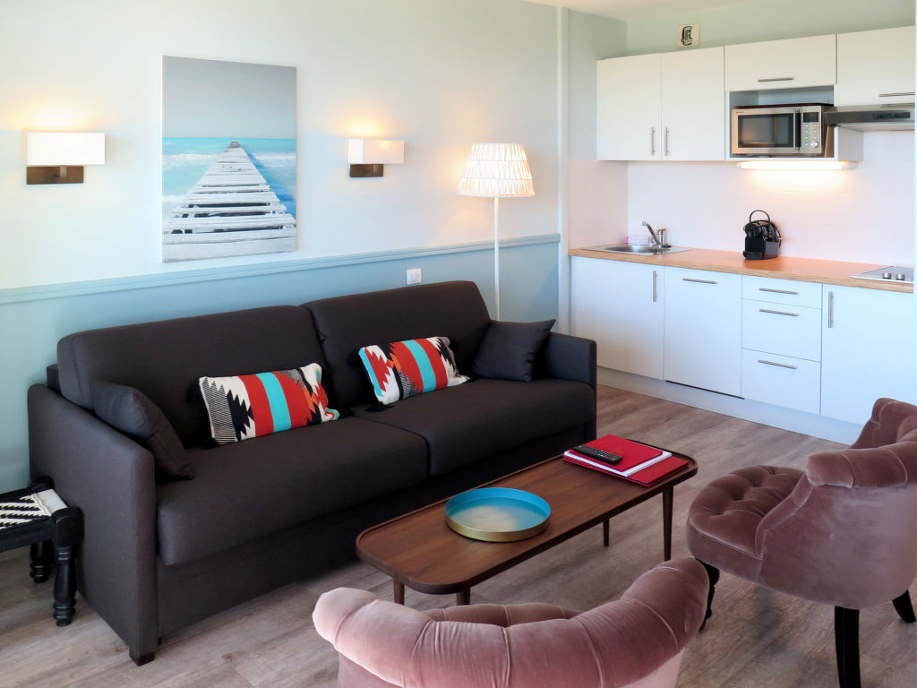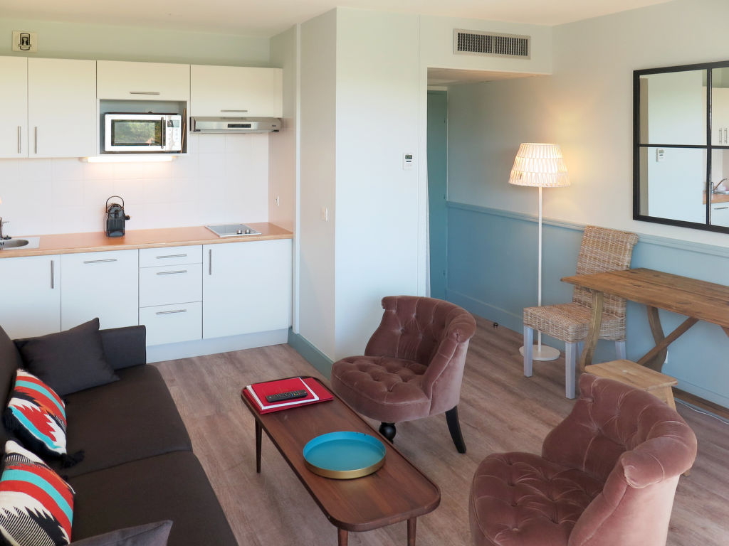 2-Zimmer-Wohnung, ca. 37 m². Wohn-/Schlafraum mit Doppelbettcouch, 2 Sesseln, Essplatz, Küchenzeile (2 Induktionsfelder, Mikrowelle, Geschirrspüler, Kühlschrank, Kaffeemaschine, Kaffeekapselmaschine, Wasserkocher, Toaster), Balkonausgang. Schlafzimmer mit Doppelbett (1,80 m breit) oder 2 Einzelbetten. Bad/WC oder Dusche/WC. Das WC kann auch separat sein.