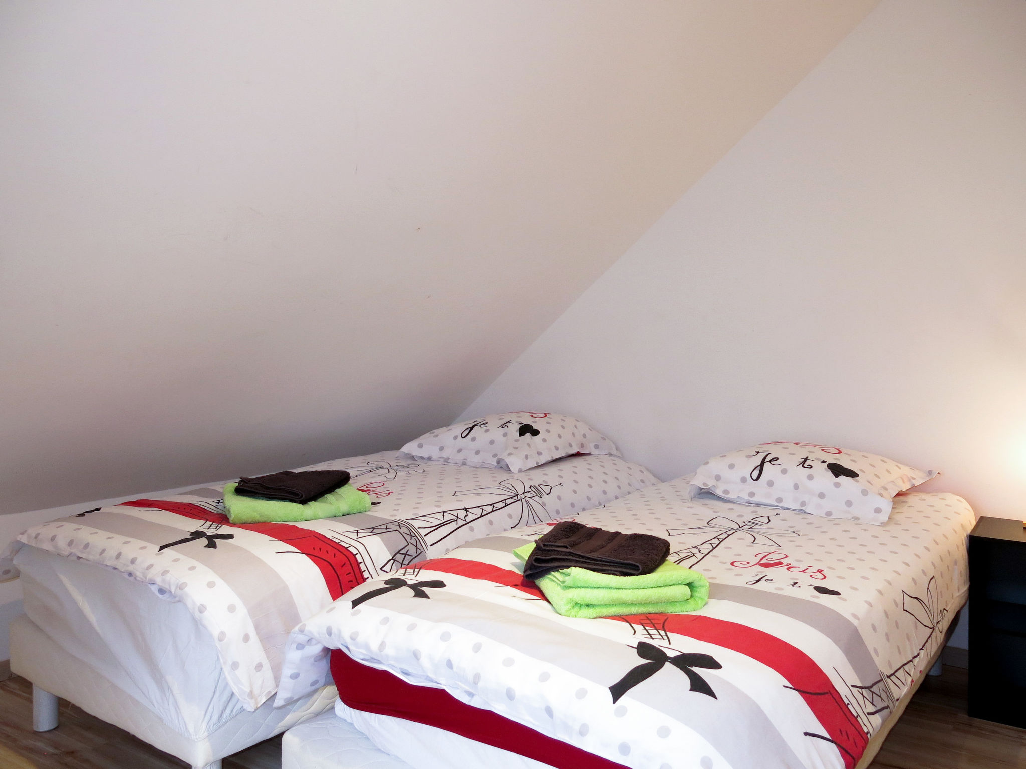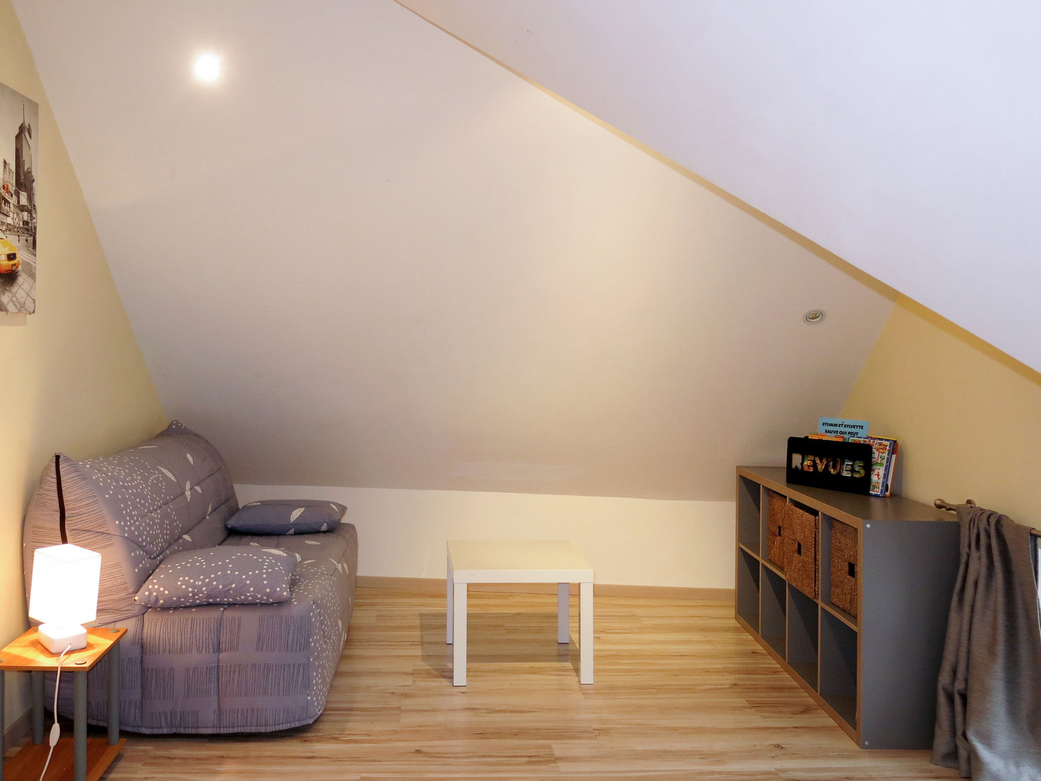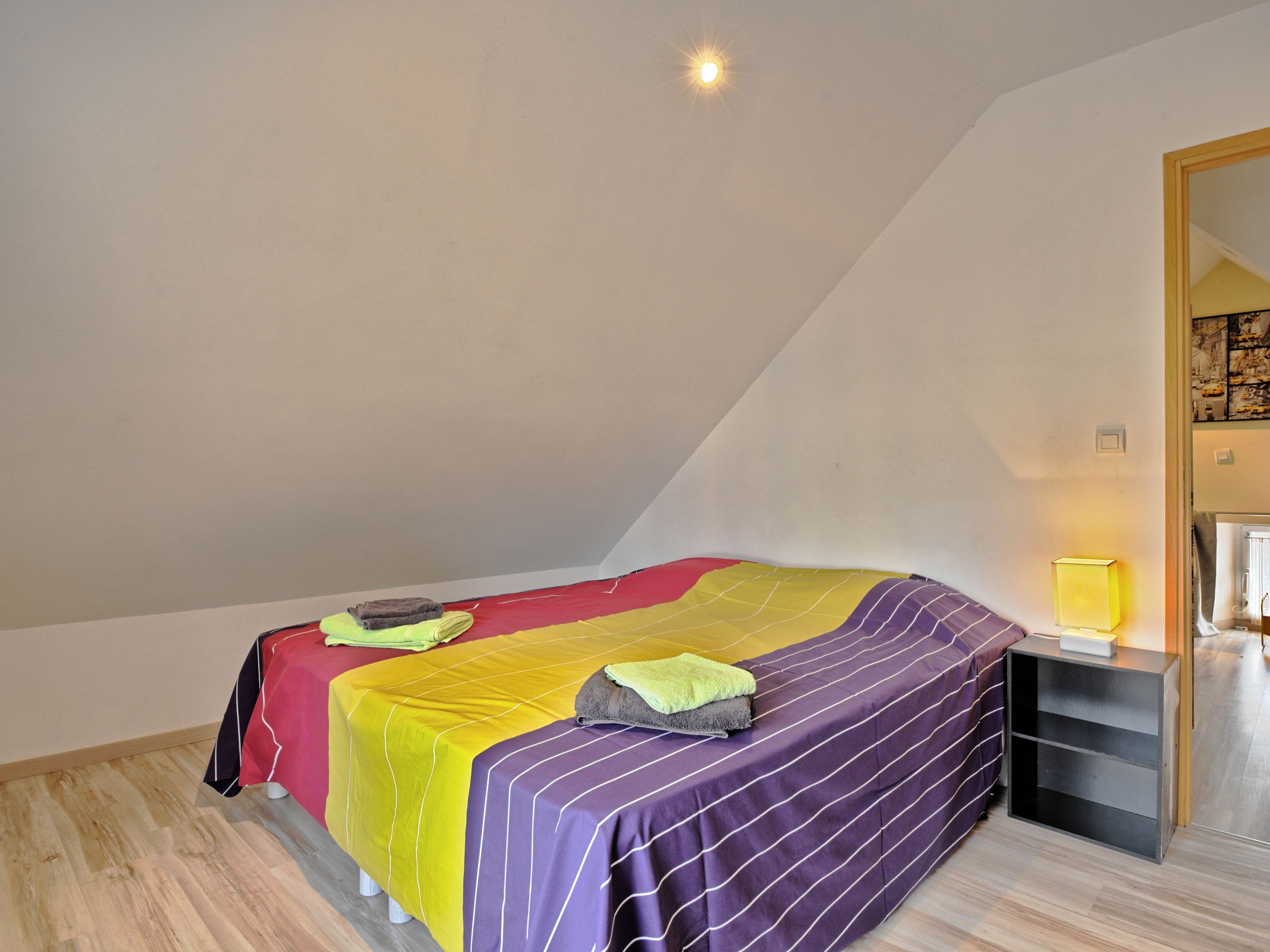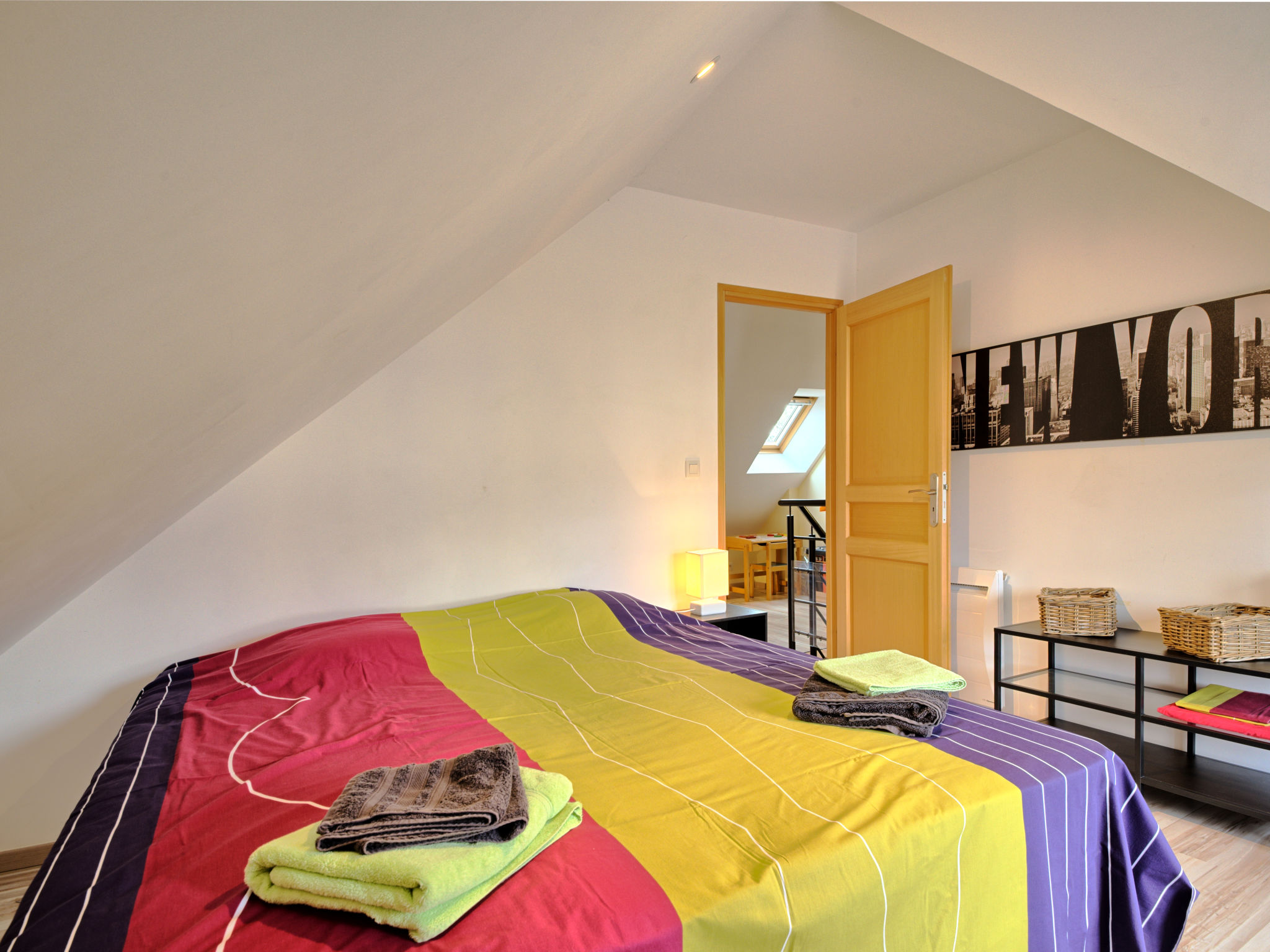 3,5 Zimmer-Haus, 2 Etagen, ca. 70 m². Erdgeschoss: Wohnraum mit Sitzcouch, Essplatz, Gartenausgang. Sep.WC. Zwei Stufen höher: Zum Wohnraum offene Küche (4 Flammen, Backofen, Mikrowelle, Geschirrspüler, Kühl-/Gefrierkombination, Kaffeemaschine, Wasserkocher, Toaster) mit Essplatz für 2 Personen (Barhocker). Vom Wohnraum Treppe ins Obergeschoss (Dachschräge, eingeschränkte Stehhöhe): offene Galerie mit Bettcouch. Zweibettzimmer (Betten zusammenstellbar). Schlafzimmer mit franz. Bett (1,60 m breit). Bad. Sep.WC. Inserat einer Privatperson nach Artikel 155, IV, CGI.