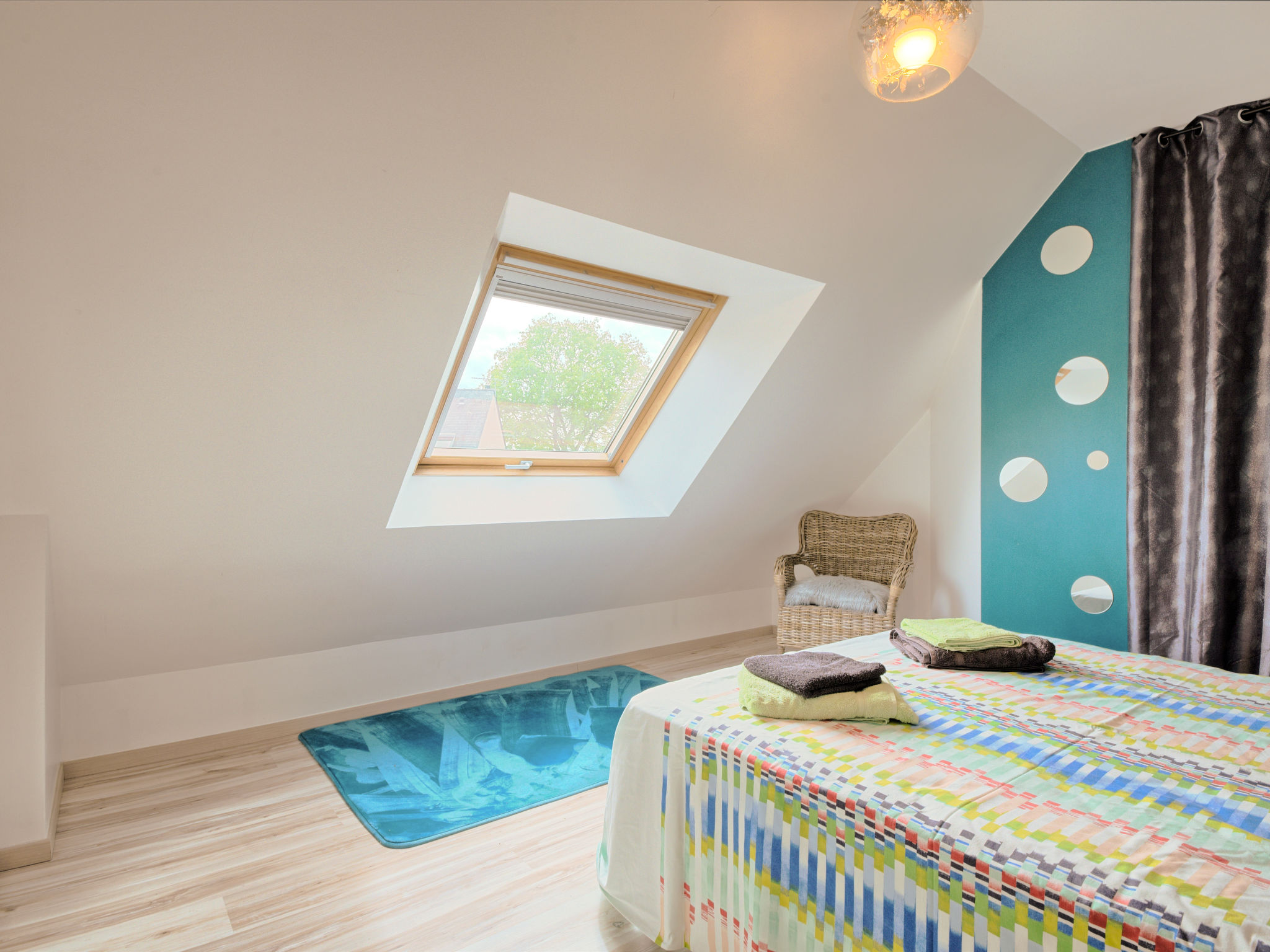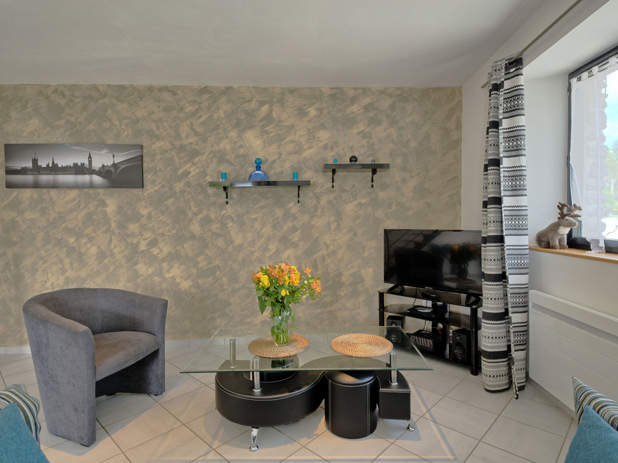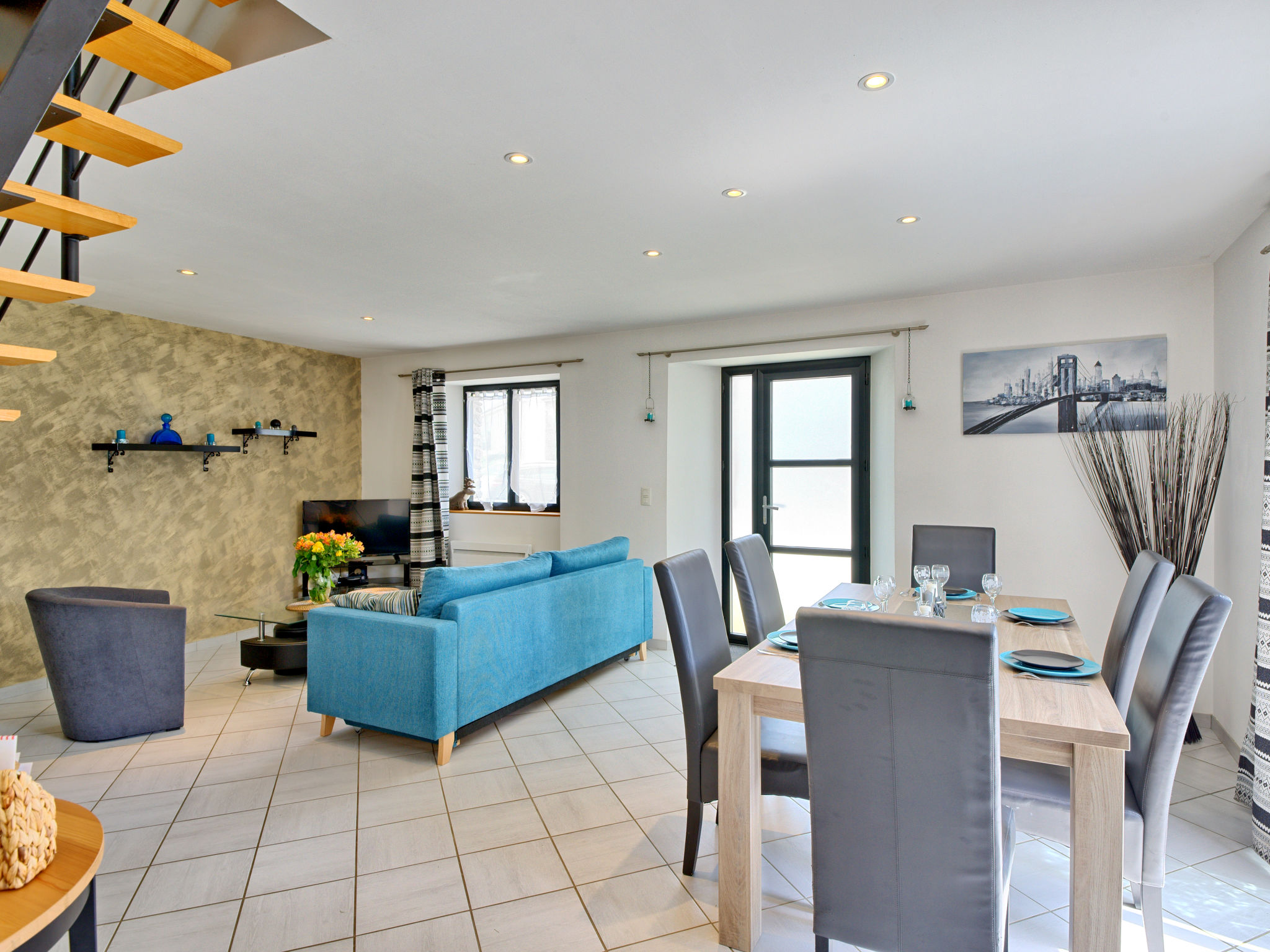 3,5 Zimmer-Haus, 2 Etagen, ca. 70 m². Erdgeschoss: Wohnraum mit Sitzcouch, Essplatz, Gartenausgang. Sep.WC. Zwei Stufen höher: Zum Wohnraum offene Küche (4 Flammen, Backofen, Mikrowelle, Geschirrspüler, Kühl-/Gefrierkombination, Kaffeemaschine, Wasserkocher, Toaster) mit Essplatz für 2 Personen (Barhocker). Vom Wohnraum Treppe ins Obergeschoss (Dachschräge, eingeschränkte Stehhöhe): offene Galerie mit Bettcouch. Zweibettzimmer (Betten zusammenstellbar). Schlafzimmer mit franz. Bett (1,60 m breit). Bad. Sep.WC. Inserat einer Privatperson nach Artikel 155, IV, CGI.