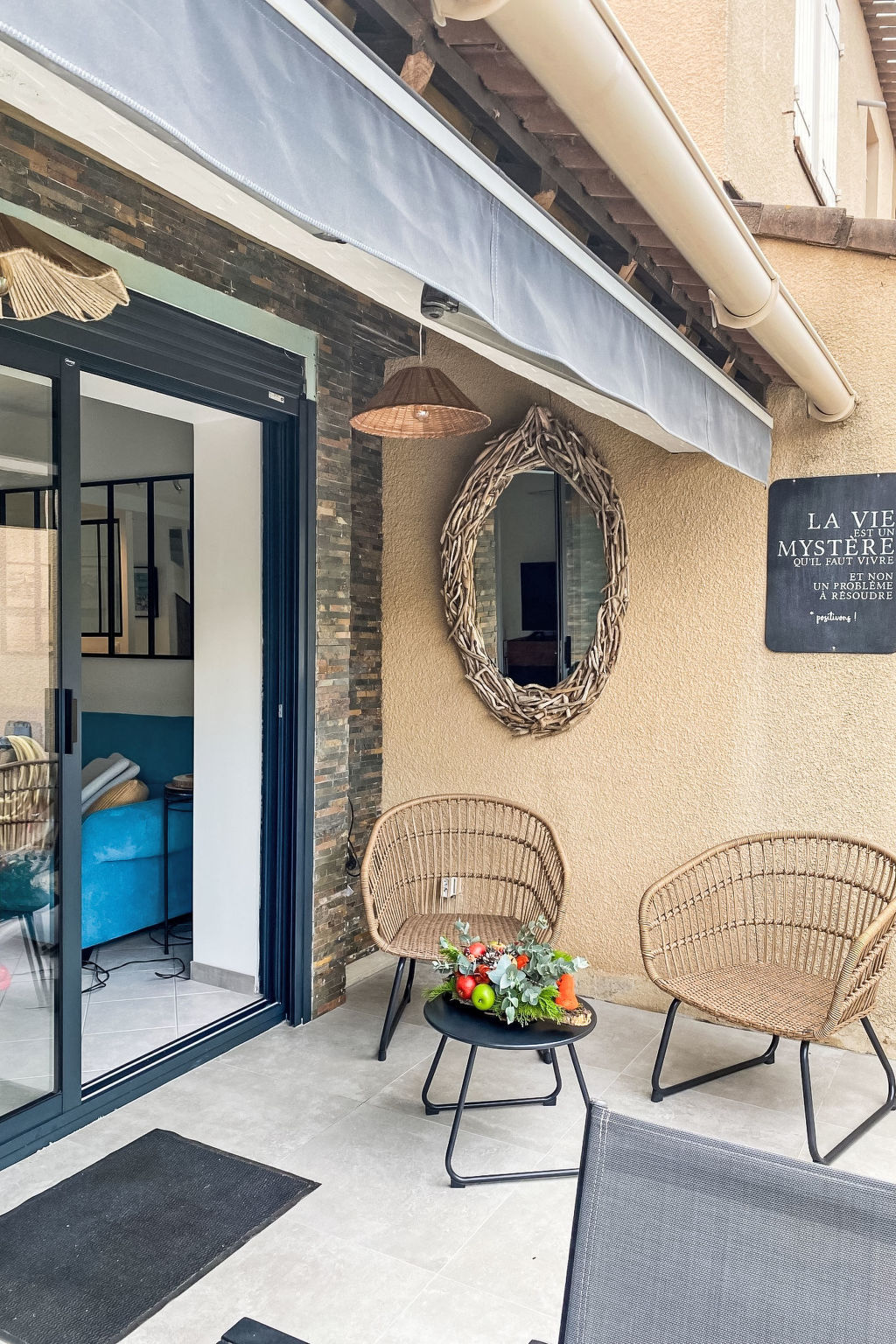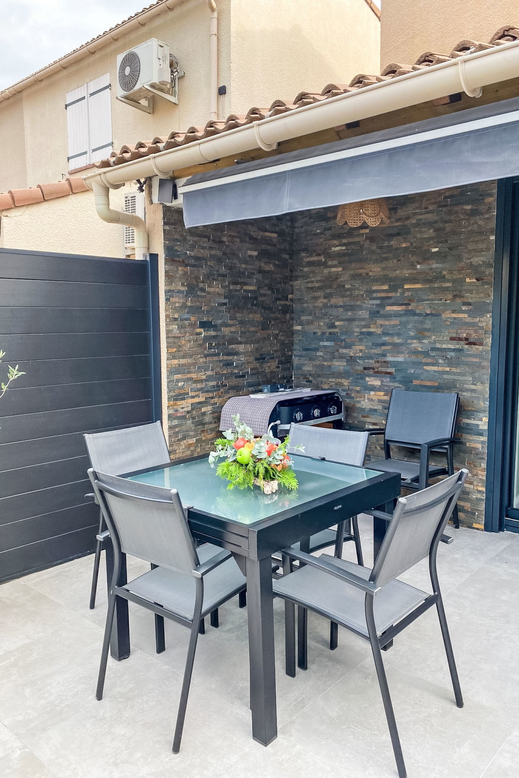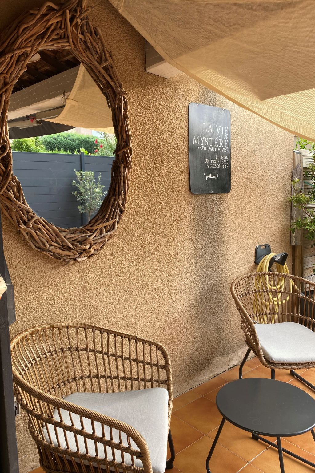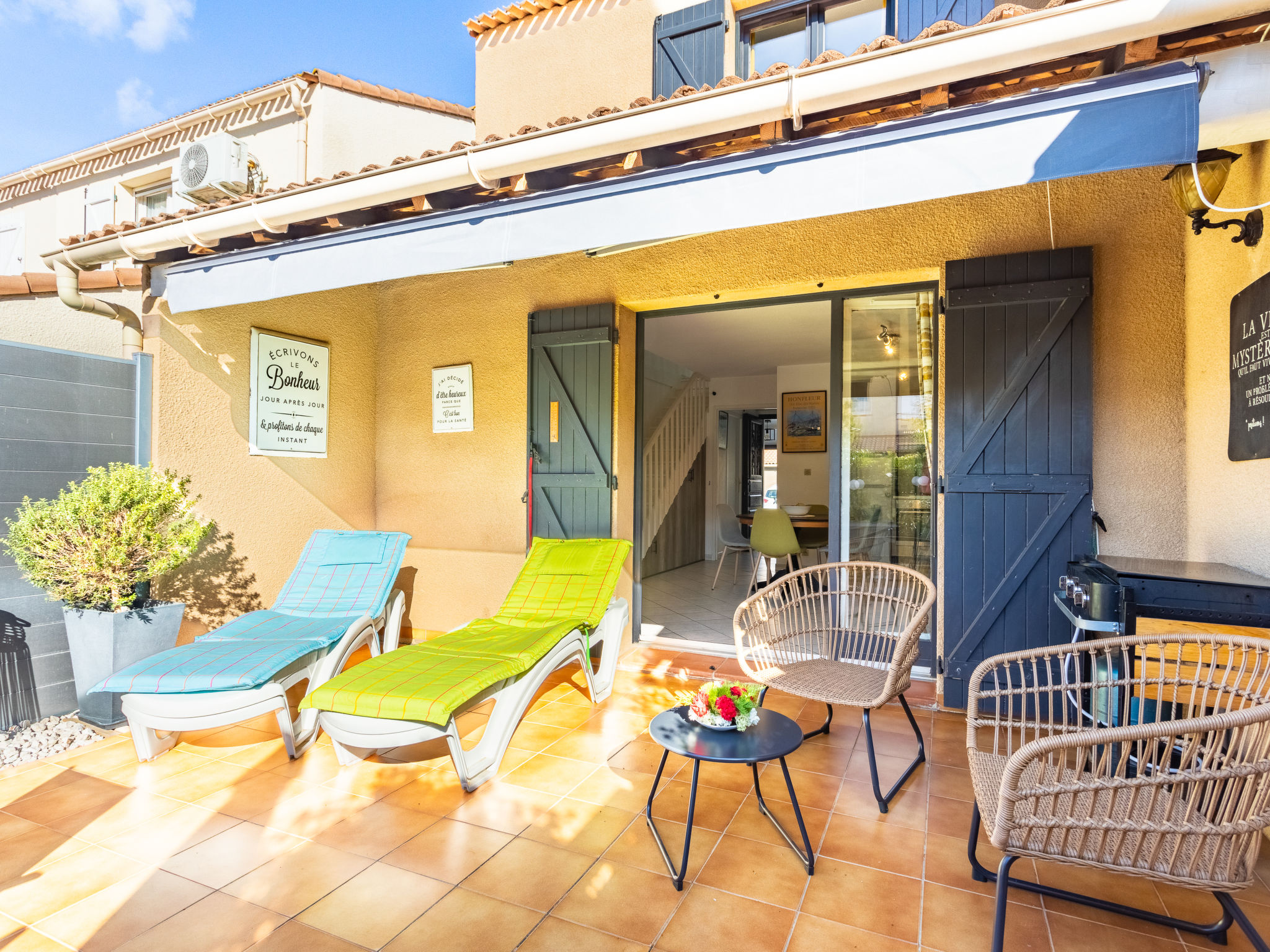 3-Zimmer-Reihenhaus 55 m2 auf 2 Stockwerken. Komfortabel und schön eingerichtet: Wohn-/Esszimmer mit TV (Flachbildschirm). Offene Küche (Backofen, Geschirrspüler, 4 Induktionskochplatten, Mikrowelle, elektrische Kaffeemaschine). Sep. WC. Obergeschoss: 1 Zimmer mit 1 franz. Bett (160 cm, Länge 200 cm), TV (Flachbildschirm), Klimaanlage. (steile Treppe) abgeschrägte, offene Galerie mit Dachfenster mit 2 Betten (80 cm, Länge 200 cm). Dusche/WC. Terrasse 30 m2. Terrassenmöbel, Gartengrill, Liegestühle (4). Zur Verfügung: Waschmaschine, Bügeleisen. Internet (Wireless LAN, extra). Parkplatz beim Haus. Bitte beachten: Nichtraucher-Haus. TV nur FR. Rauchmelder. Inserat einer Privatperson nach Artikel 155, IV, CGI. 83070 000994 74