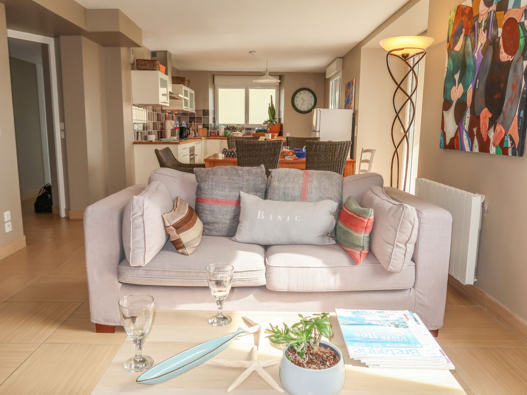"Les Embruns", 3-Zimmer-Wohnung 65 m2, im Erdgeschoss. Hell, komfortabel und gemütlich eingerichtet: Wohn-/Esszimmer mit Esstisch, TV und Flachbildschirm. Ausgang zum Garten, zum Balkon. 2 Zimmer, jedes Zimmer mit 1 franz. Bett (1 x 140 cm, Länge 190 cm). Offene Küche (Backofen, Geschirrspüler, 3 Induktionskochplatten, Toaster, Wasserkocher, Mikrowelle, Tiefkühler, elektrische Kaffeemaschine). Ausgang zum Balkon. Dusche, sep. WC. Balkon 20 m2, kleine Terrasse 10 m2, Rasen 100 m2. Balkonmöbel, Liegestühle (2). Sicht auf das Meer. Zur Verfügung: Waschmaschine, Bügeleisen, Kinderhochstuhl, Babybett bis 2 Jahre. Internet (Wireless LAN, gratis). Parkplatz. Bitte beachten: Nichtraucher-Unterkunft. Maximal 1 kleines Haustier/Hund erlaubt. Rauchmelder. Inserat einer Privatperson nach Artikel 155, IV, CGI.