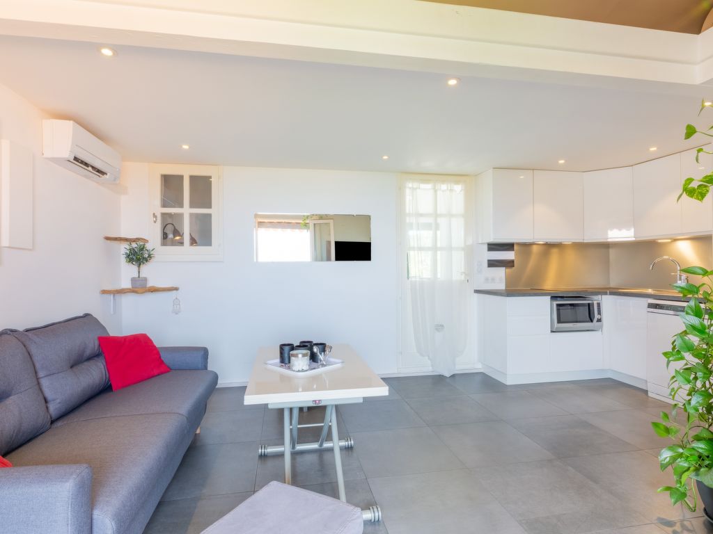 2-Zimmer-Wohnung 34 m2, im Erdgeschoss. Schön eingerichtet: Eingang. Ausgang zur Terrasse. Wohn-/Esszimmer mit 1 Doppeldiwanbett (1 x 140 cm, Länge 190 cm), TV (Flachbildschirm). Ausgang zum Balkon. 1 Zimmer mit 1 franz. Bett (1 x 160 cm, Länge 200 cm). Offene Küche (Geschirrspüler, 2 Induktionskochplatten, Toaster, Wasserkocher, Tiefkühler, elektrische Kaffeemaschine, Kombinationsmikrowelle). Dusche/WC. Klimaanlage. Grosse Terrasse 15 m2, kleiner Gartensitzplatz 40 m2. Terrassenmöbel. Sicht auf das Meer und die Landschaft. Zur Verfügung: Waschmaschine, Wäschetrockner. Internet (Wireless LAN, gratis). Bitte beachten: Nichtraucher-Unterkunft. 1 Haustier/Hund erlaubt. Rauchmelder. Inserat einer Privatperson nach Artikel 155, IV, CGI. 83107000695BJ