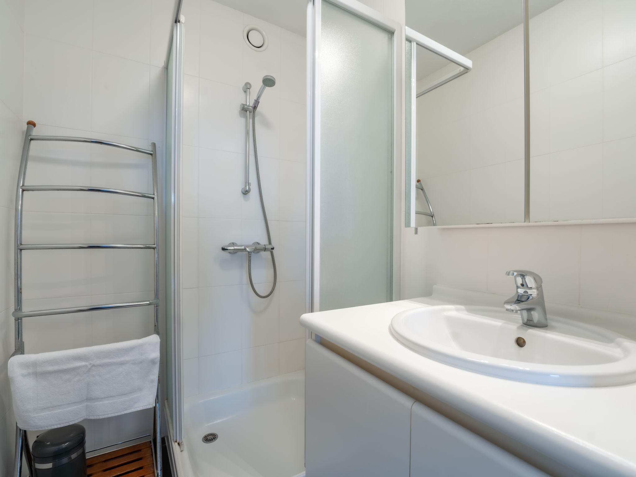 "Appartement 402", 2-Zimmer-Wohnung 50 m2 im 4. Stock. Komfortabel eingerichtet: offenes Wohn-/Schlafzimmer mit 1 Doppeldiwanbett, Digital-TV, Flachbildschirm, Stereoanlage und DVD. Ausgang zum Balkon. 1 Doppelzimmer mit 1 Doppelbett (1 x 160 cm, Länge 200 cm), TV. Offene Küche (Geschirrspüler, 4 Glaskeramikherd Platten, elektrische Kaffeemaschine, Kombinationsmikrowelle). Dusche, sep. WC. Balkonmöbel. Zur Verfügung: Kinderhochstuhl, Babybett, Haartrockner. Internet (Wireless LAN, gratis). Bitte beachten: Nichtraucher-Haus.