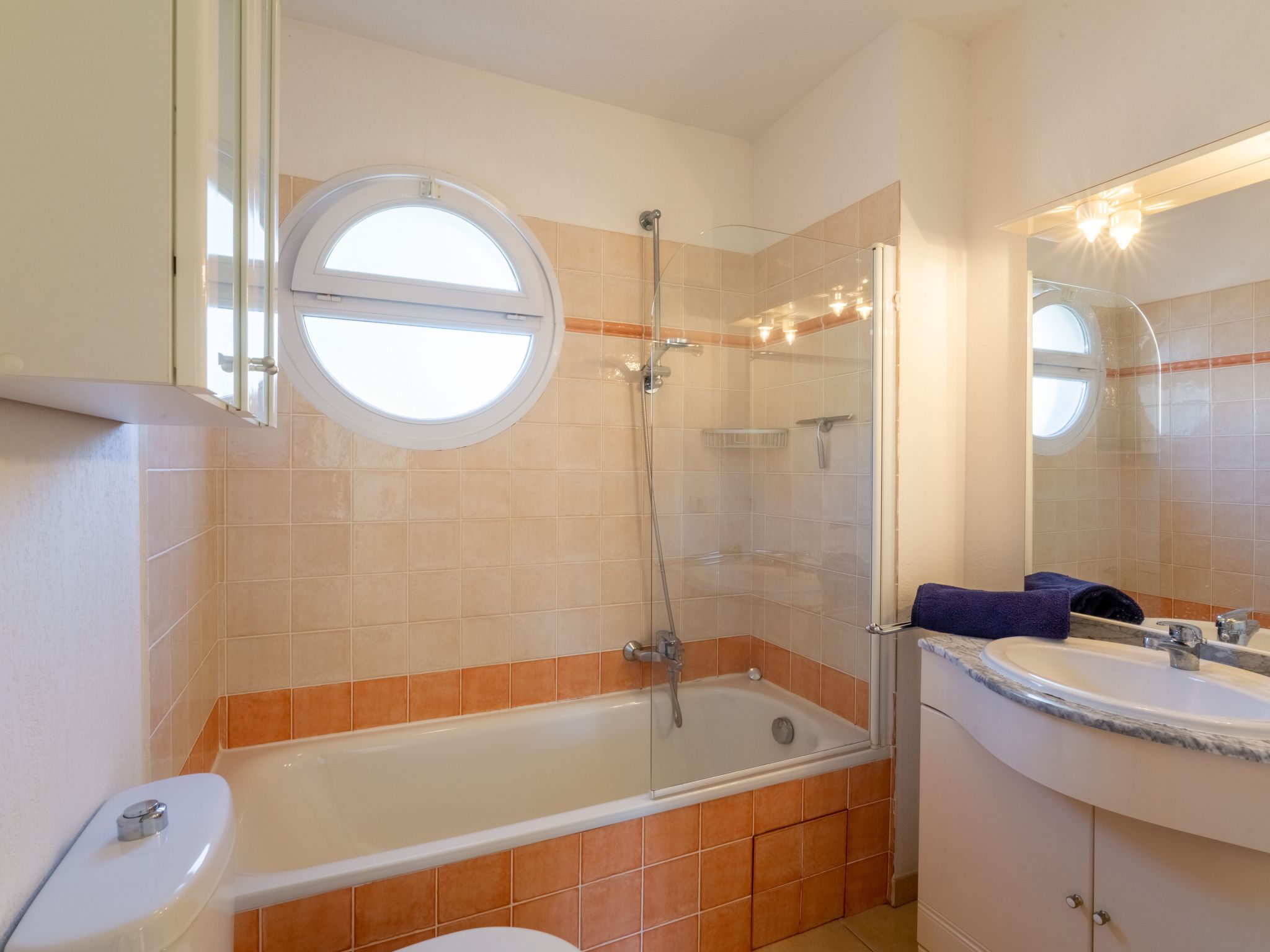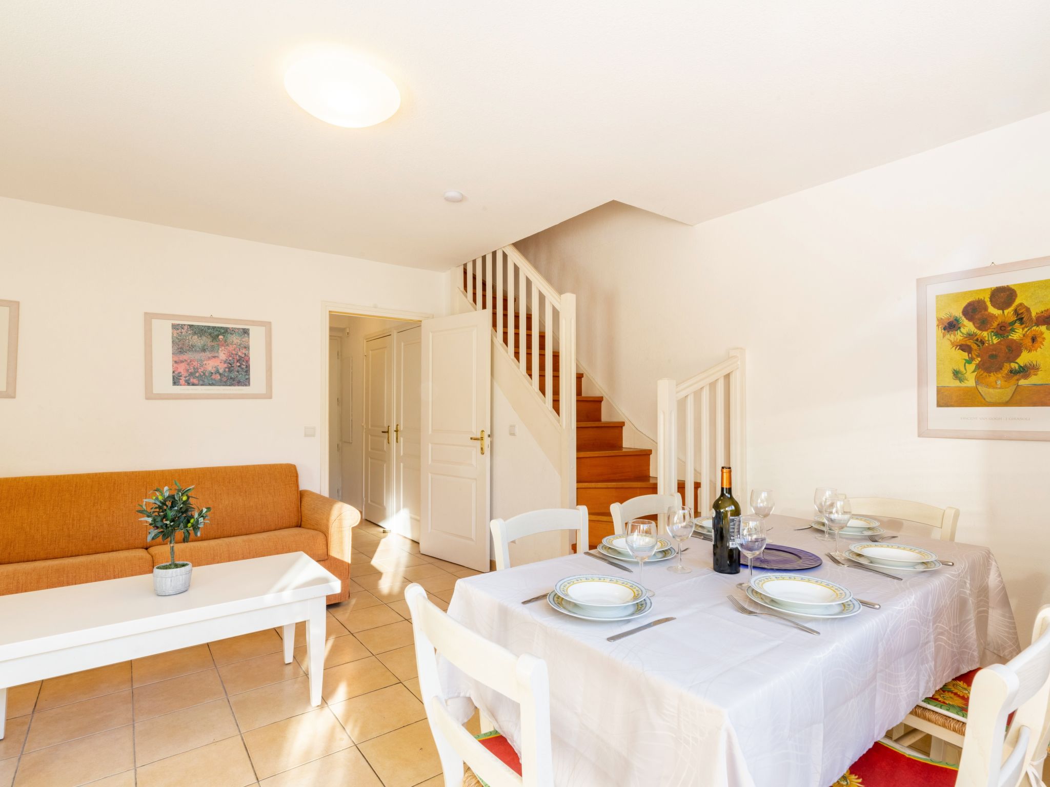 3-Zimmer-Reihenhaus 73 m2 auf 2 Stockwerken, Südwestlage. Geräumig, komfortabel und schön eingerichtet: Eingang mit sep. WC. Wohn-/Esszimmer mit TV (Flachbildschirm), Stereoanlage. Ausgang zum Garten, zur Terrasse. Küche (Backofen, Geschirrspüler, 4 Glaskeramikherd Platten, Toaster, Wasserkocher, Mikrowelle, Tiefkühler, elektrische Kaffeemaschine). Obergeschoss: 2 Zimmer, jedes Zimmer mit 1 franz. Bett (1 x 160 cm, Länge 190 cm). Bad/WC. Klimaanlage. Terrasse 25 m2, Gartensitzplatz 20 m2. Terrassenmöbel, Elektrogrill. Zur Verfügung: Waschmaschine, Bügeleisen. Internet (Wireless LAN, gratis). Parkplatz. Bitte beachten: Nichtraucher-Haus. Maximal 1 Haustier/Hund erlaubt. Rauchmelder. 831070007815S