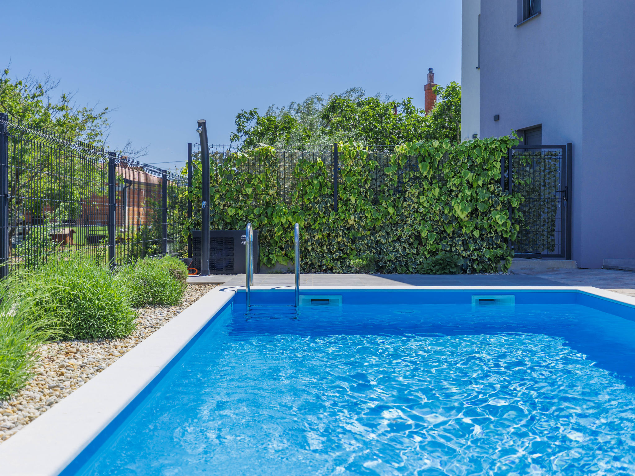 Doppelhaus "Villa Isabela", auf 2 Stockwerken. Im Weiler Vežnaveri, 4 km vom Zentrum von Poreč, 2 km vom Zentrum von Nova Vas, 50 km vom Zentrum von Pula, 4 km vom Meer, 4 km vom Strand. Zur Alleinbenutzung: Grundstück 250 m2 (eingezäunt) mit Rasen, Schwimmbad beheizt (7 x 3 m, 24 m2, 150 cm tief, saisonale Verfügbarkeit: 01.Mai. - 31.Okt.). Aussendusche, Tischtennis, Terrasse, Poolpflege durch den Besitzer/Gärtner. Im Hause: Internetzugang, Waschmaschine. Parkplatz (für 2 Autos) auf dem Grundstück. E-Ladestation. Einkaufsgeschäft 2 km, Supermarkt 3 km, Bushaltestelle 6 km, Felsstrand 4 km. Schwimmbad beheizt (extra).