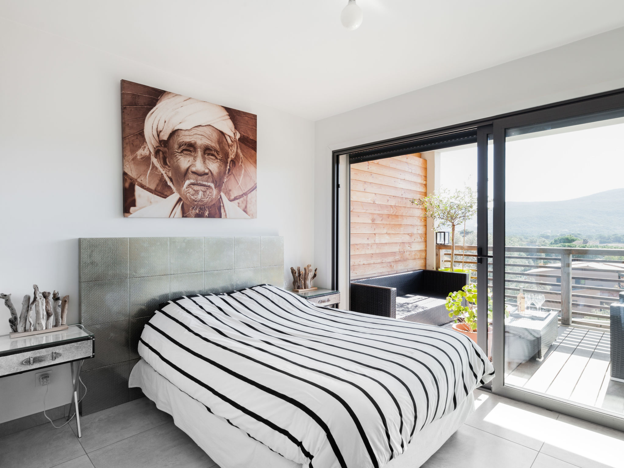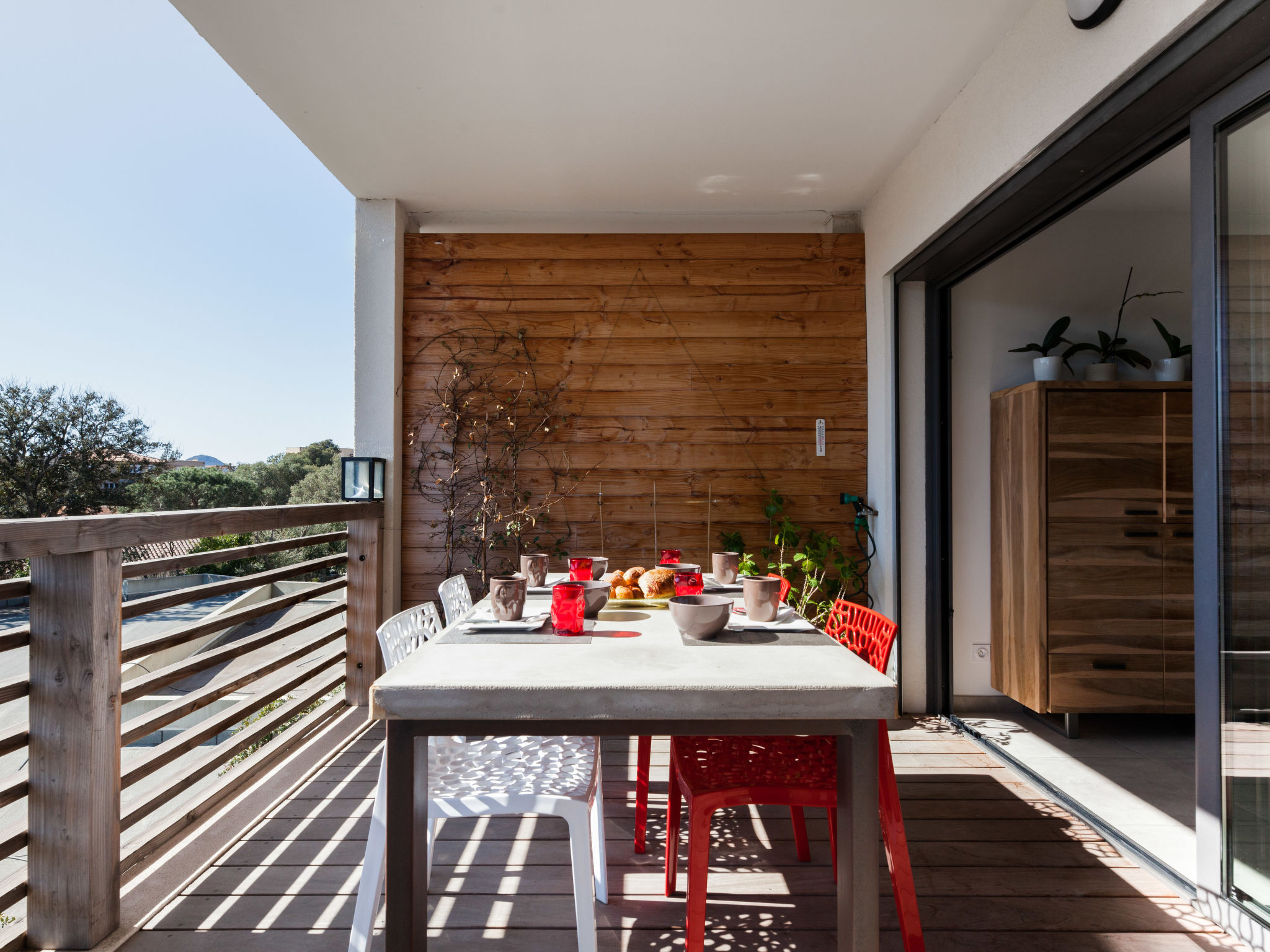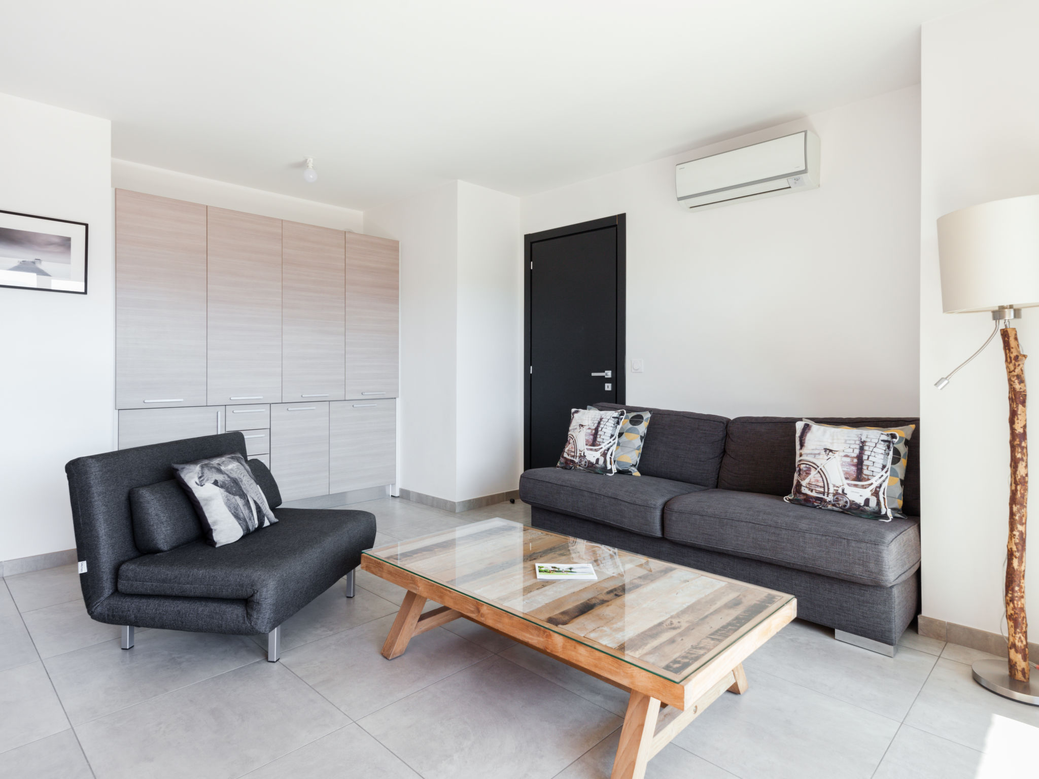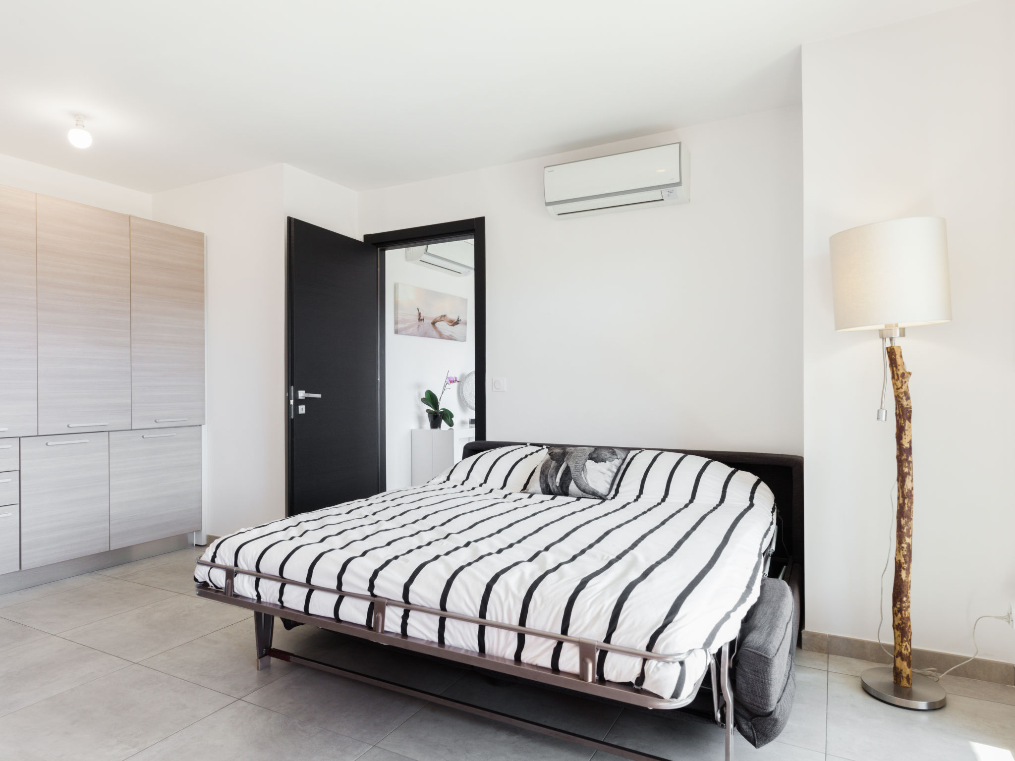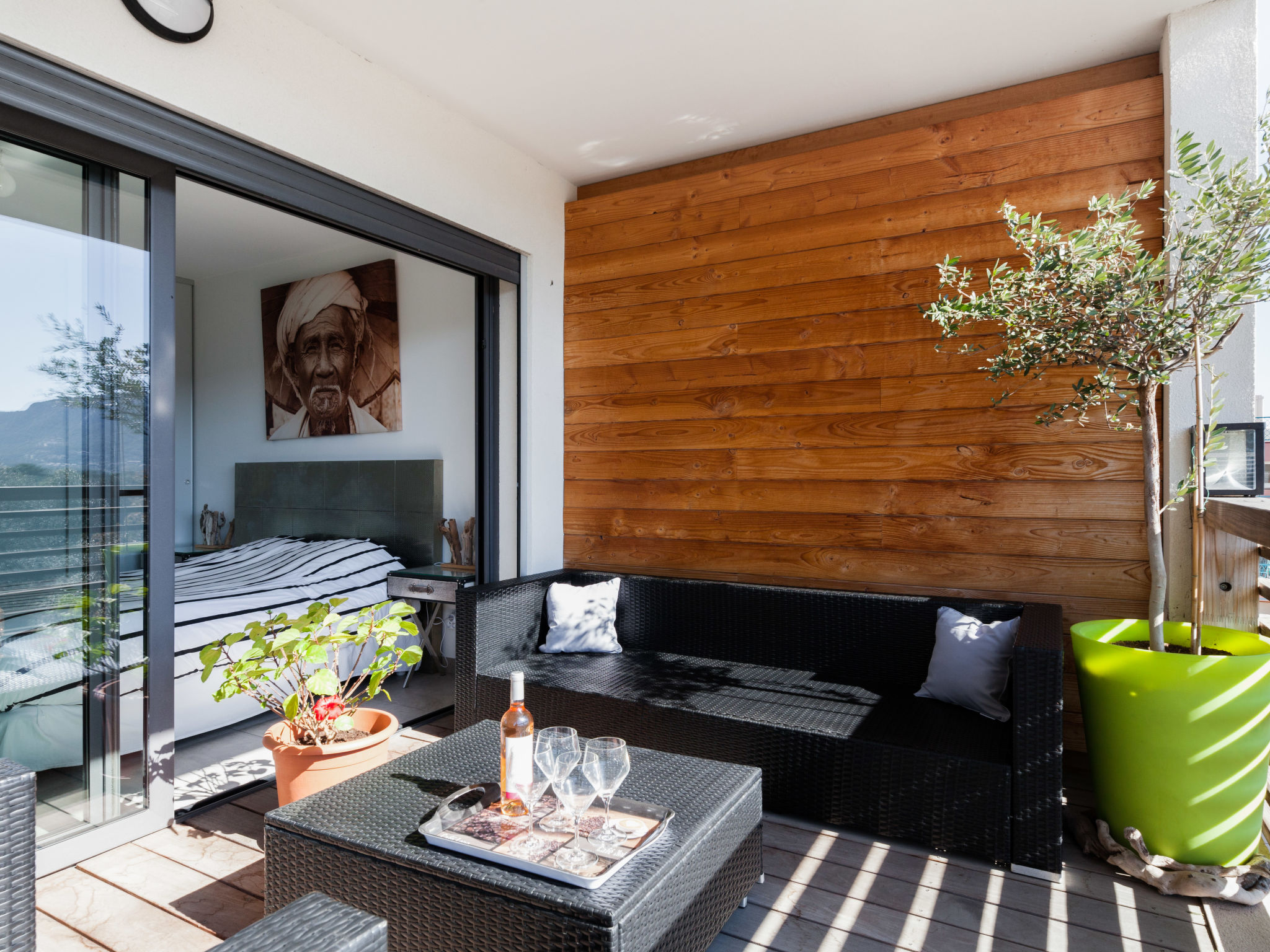 2-Zimmer-Wohnung 41 m2 im 2. Stock. Eingang. Wohn-/Esszimmer mit 1 Doppeldiwanbett (160 cm, Länge 200 cm), TV (Flachbildschirm). Ausgang zur Terrasse. 1 Zimmer mit 1 franz. Bett (140 cm, Länge 200 cm). Ausgang zur Terrasse. Kochnische (2 Kochplatten, Geschirrspüler, elektrische Kaffeemaschine, Kombinationsmikrowelle). Dusche/WC. Klimaanlage. Terrasse 20 m2. Terrassenmöbel. Zur Verfügung: Waschmaschine. Internet (Wireless LAN, gratis).