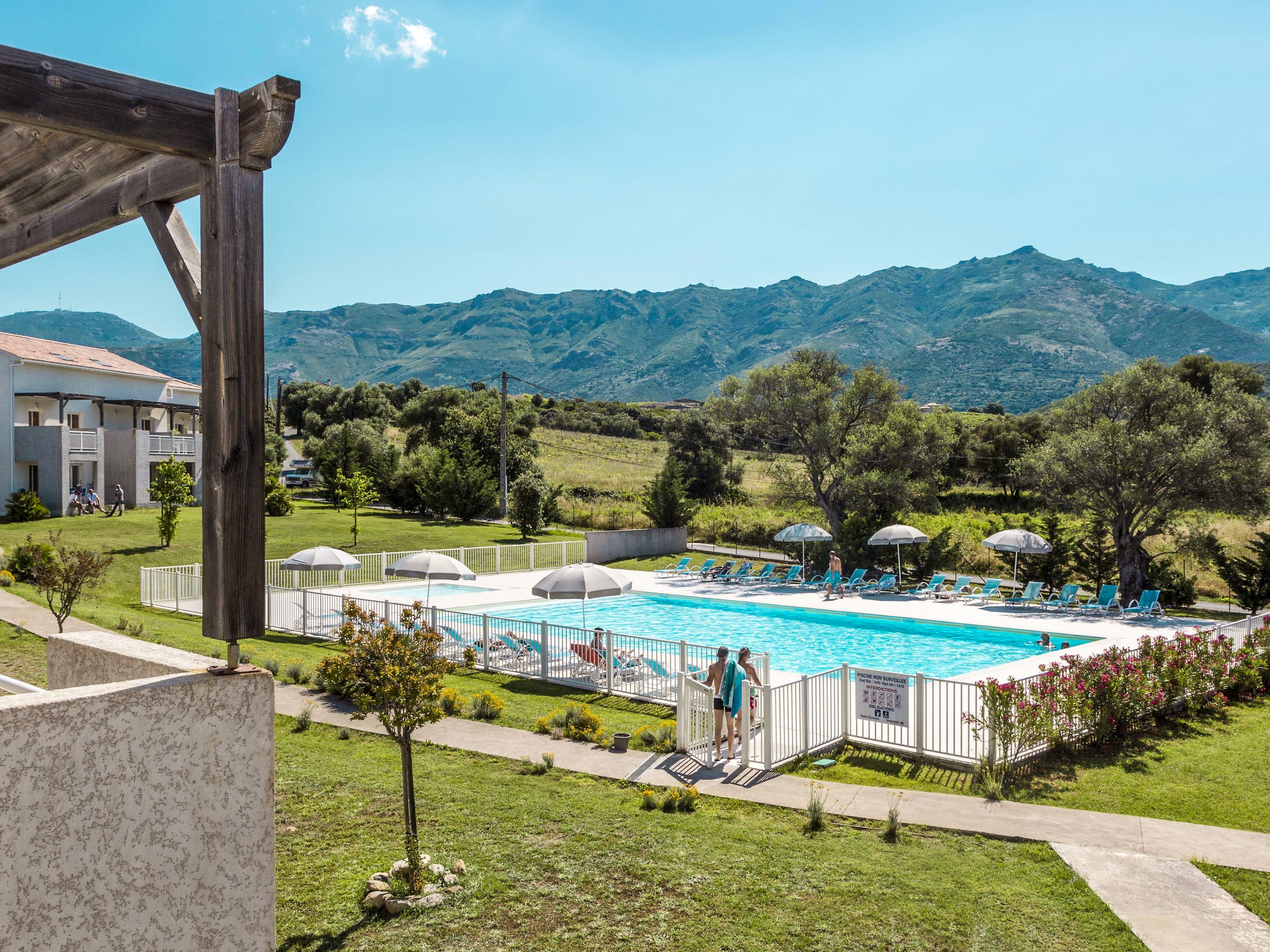 Ferienanlage "Casa d'Orinaju". 76 Wohnungen in der Residenz. 4 km vom Zentrum von St. Florent, 70 km vom Zentrum von Calvi, 25 km vom Zentrum von Bastia, 4.5 km vom Meer. Zur Mitbenutzung: Grundstück 25'000 m2 mit Bäumen, Wiese, Schwimmbad eingezäunt (18 x 10 m, 150 cm tief, saisonale Verfügbarkeit: 02.Mai.-26.Sep.). Kinderbecken, Aussendusche, Boccia, Kinderspielplatz. In der Anlage: Empfang, Wireless LAN, Waschmaschine (zur Mitbenutzung, extra). Parkplatz (beschränkte Anzahl) auf dem Grundstück. Supermarkt 1.5 km, Sandstrand 4.5 km. Das Foto ist nur ein Wohnungsbeispiel. Die Mietobjekte können sich in Wohnfläche, Raumaufteilung, Ausstattung und Einrichtung unterscheiden. WLAN nur an der Rezeption.