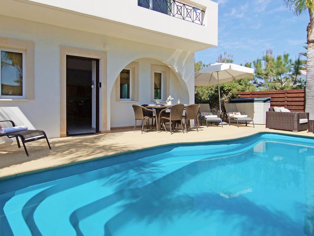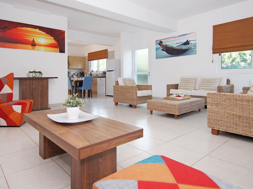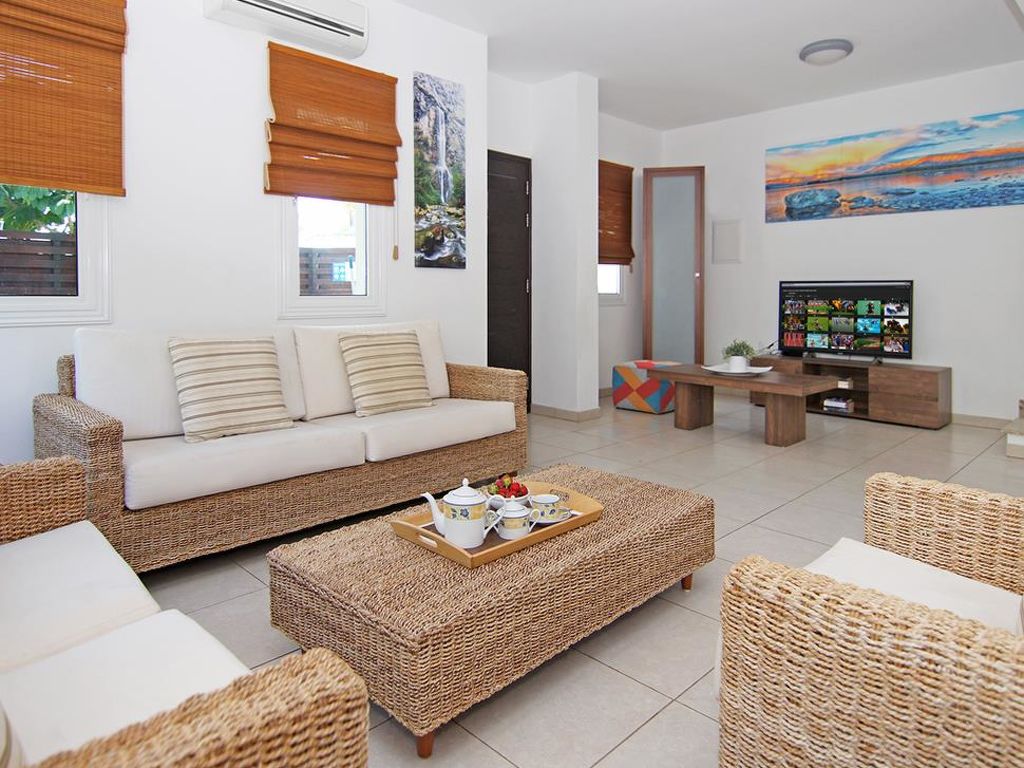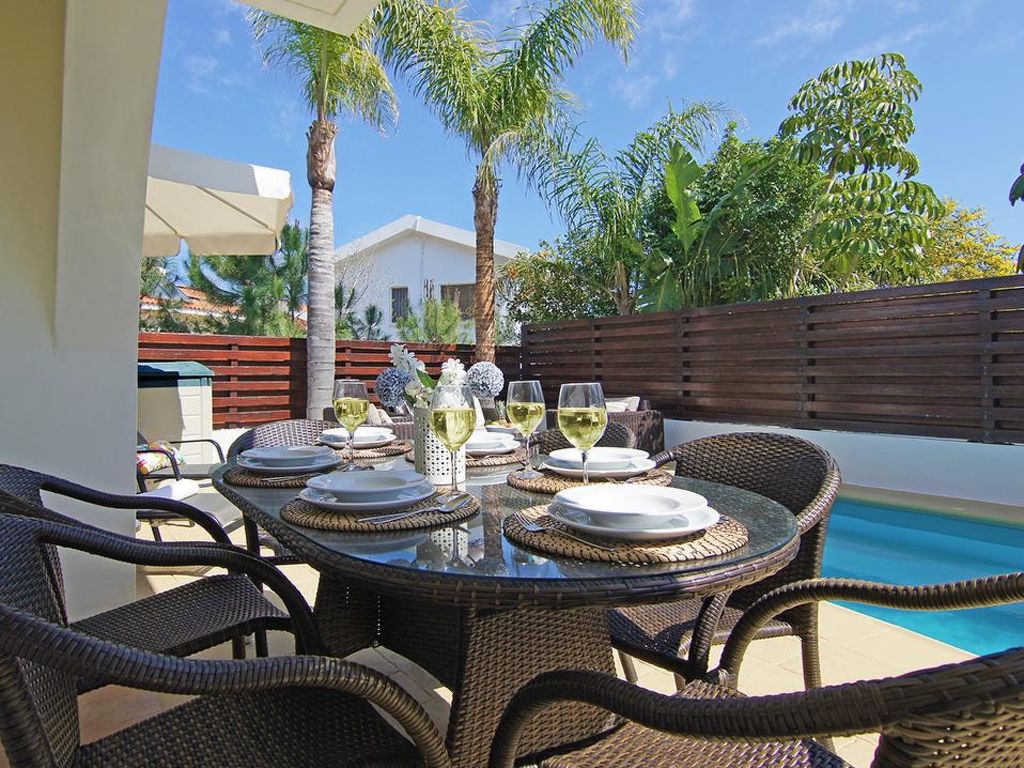 Moderne Villa "CAVKON11". Hausausstattung: Klimaanlage, Waschmaschine (zur Alleinbenutzung). Zufahrt & Parkmöglichkeiten: reservierter Parkplatz. Ganzjährig Zufahrt bis zum Haus möglich. Lage: im Ortszentrum von Cavo Greco, am Ortsrand von Protaras, ruhige Lage. Aussicht von der Wohnung auf den Garten. Umgebung des Hauses: Grundstück (zur Alleinbenutzung), Swimming Pool (zur Alleinbenutzung, Länge 7 m x Breite 3 m). Infrastruktur und Distanzen: Supermarkt 200 m, Restaurant 200 m, Sandstrand 700 m.