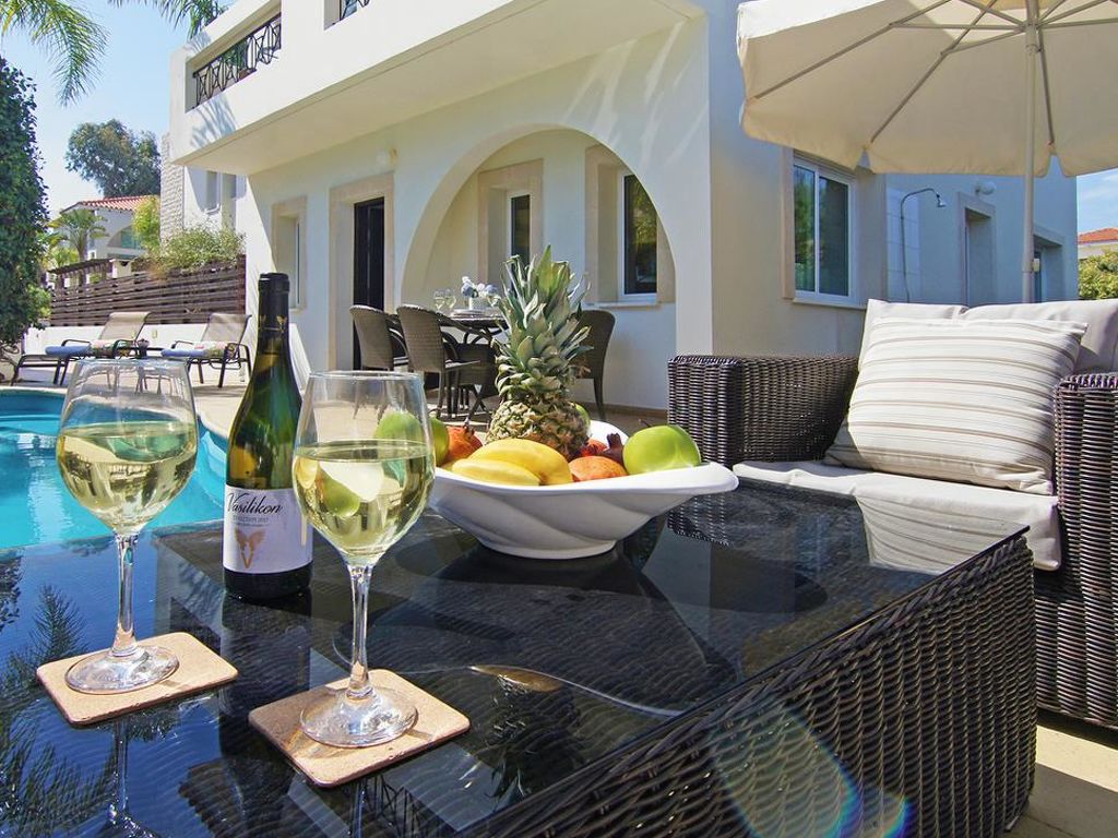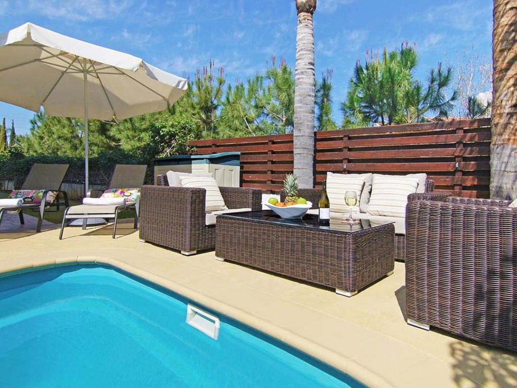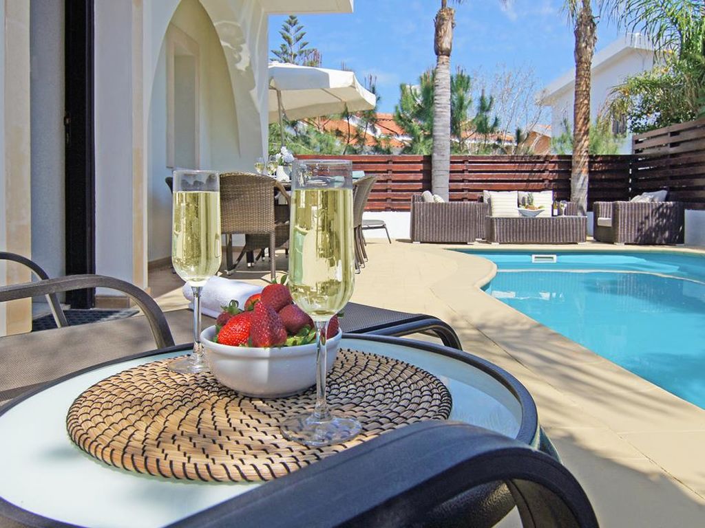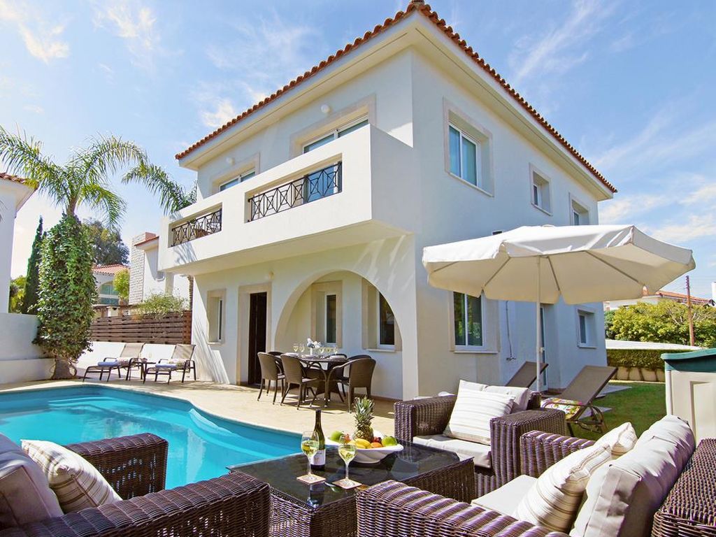 Moderne Villa "CAVKON11". Hausausstattung: Klimaanlage, Waschmaschine (zur Alleinbenutzung). Zufahrt & Parkmöglichkeiten: reservierter Parkplatz. Ganzjährig Zufahrt bis zum Haus möglich. Lage: im Ortszentrum von Cavo Greco, am Ortsrand von Protaras, ruhige Lage. Aussicht von der Wohnung auf den Garten. Umgebung des Hauses: Grundstück (zur Alleinbenutzung), Swimming Pool (zur Alleinbenutzung, Länge 7 m x Breite 3 m). Infrastruktur und Distanzen: Supermarkt 200 m, Restaurant 200 m, Sandstrand 700 m.
