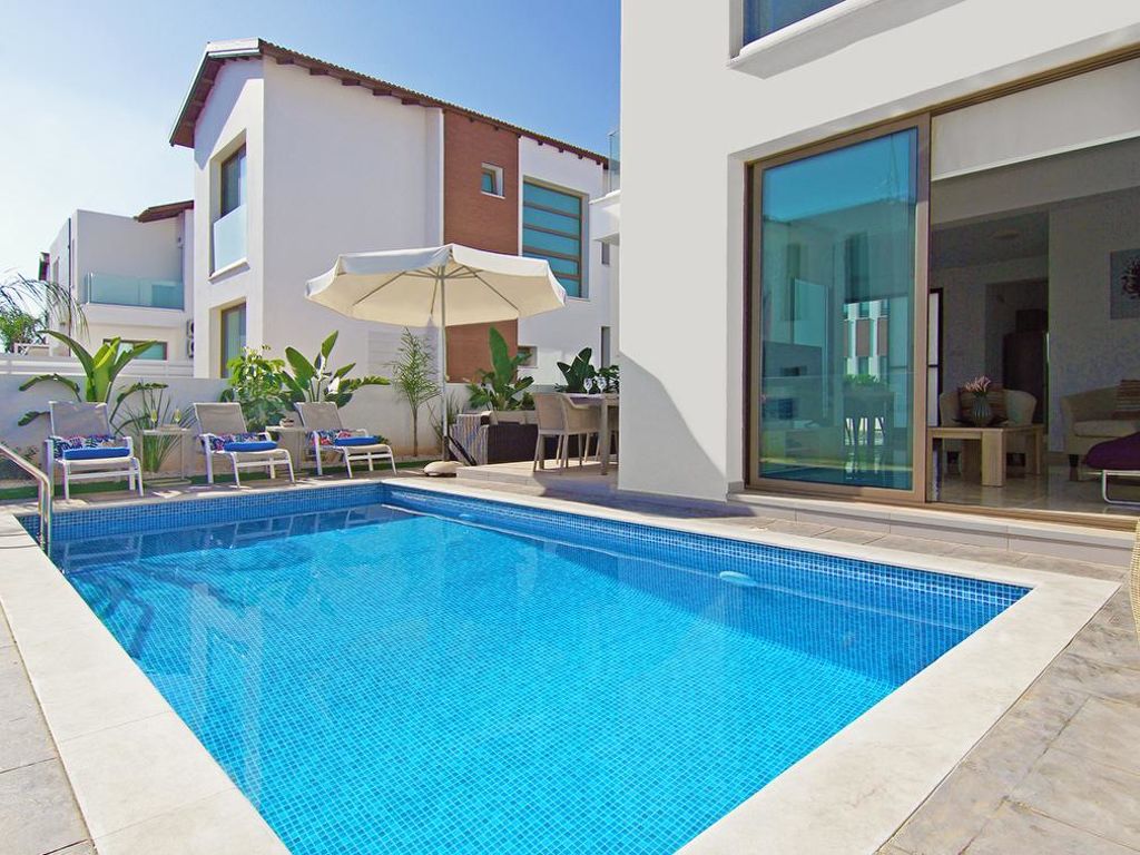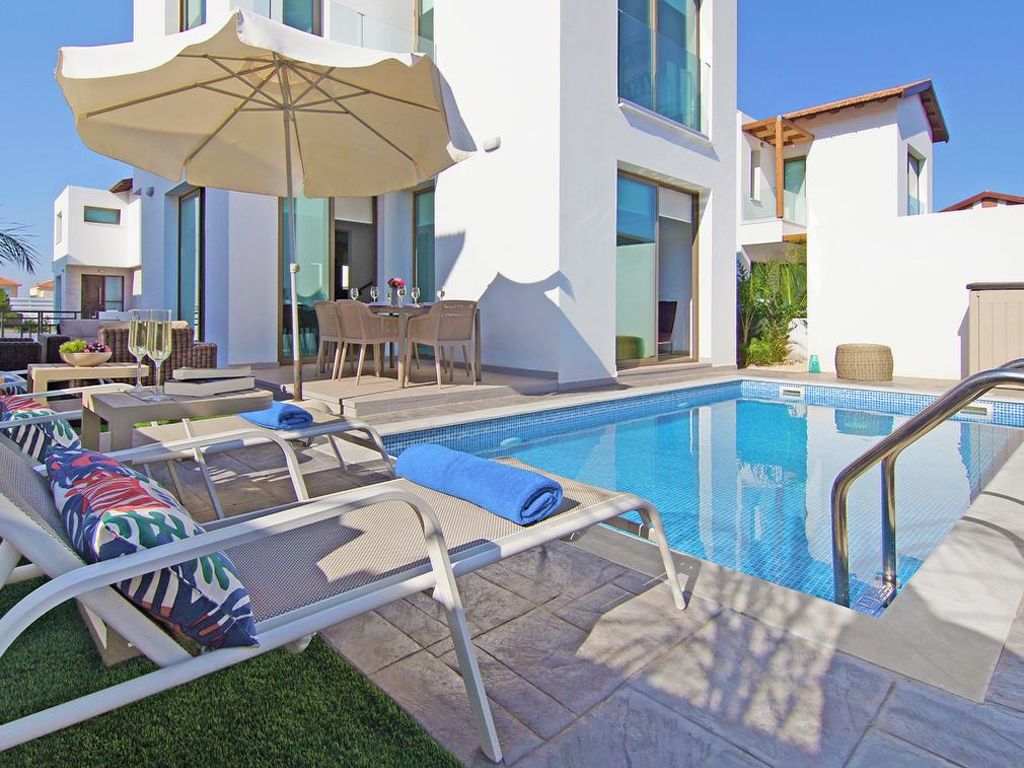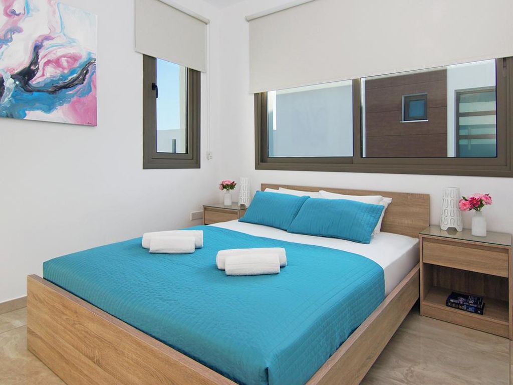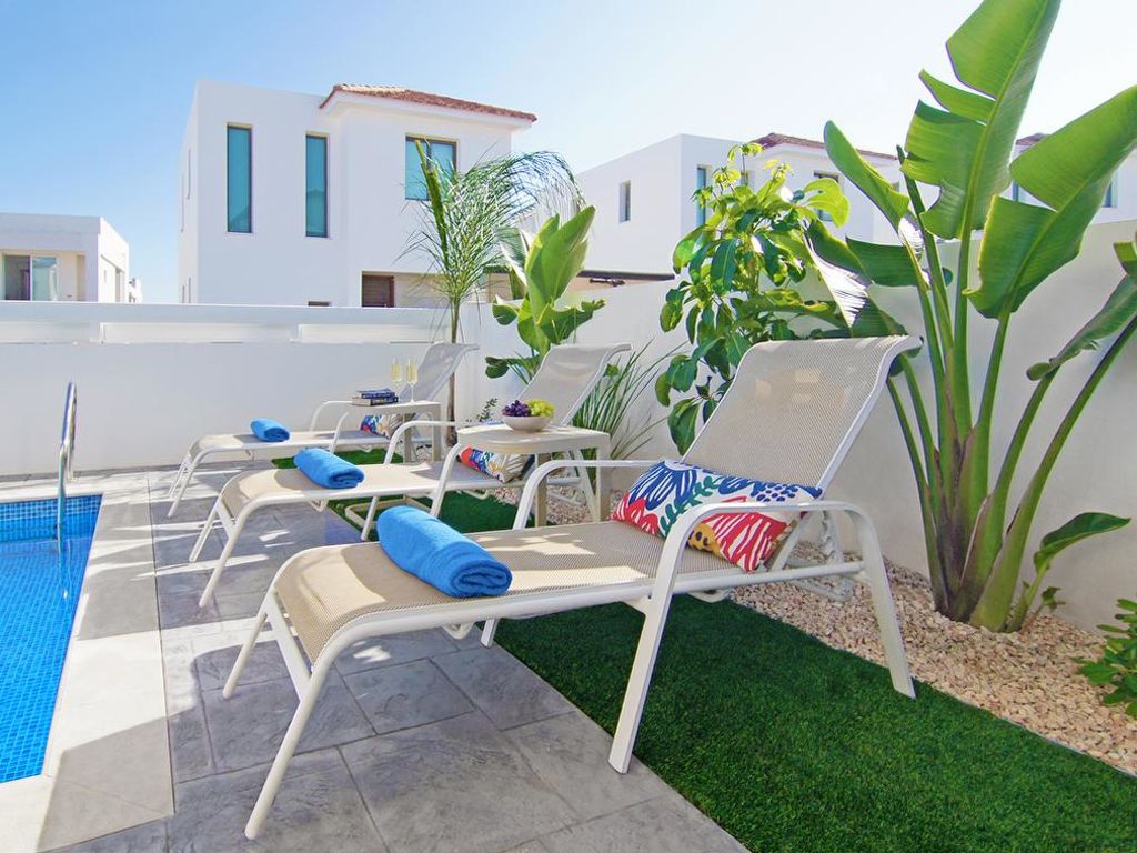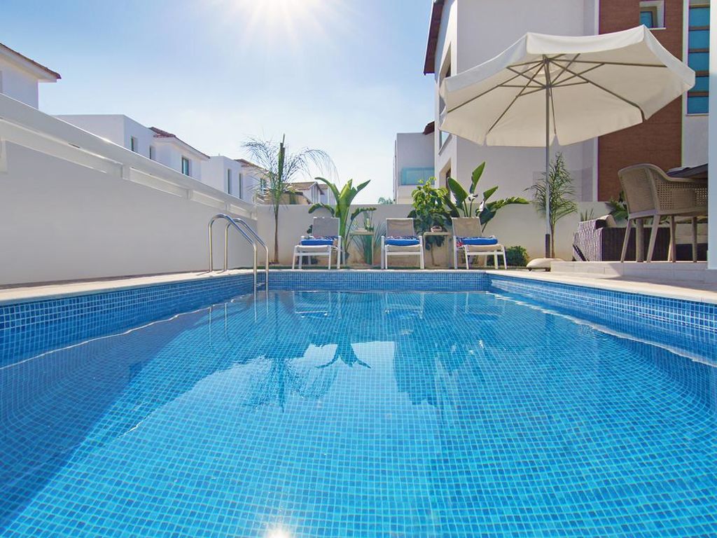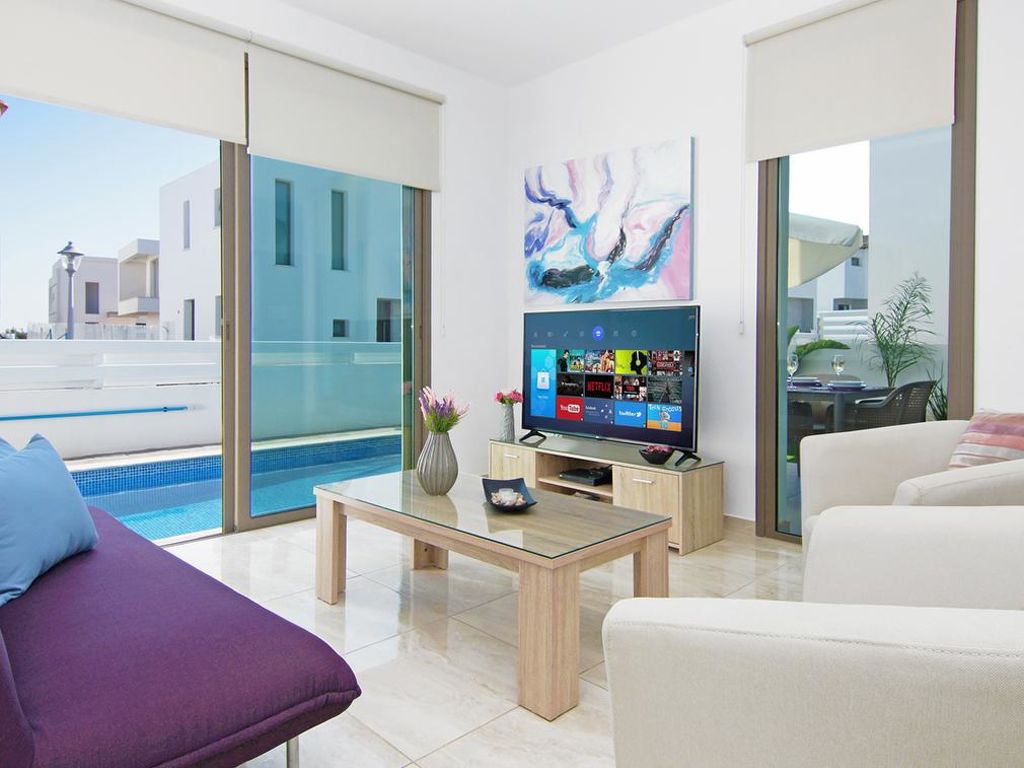 Moderne Villa "ATLEV43". Hausausstattung: Klimaanlage, Waschmaschine (zur Alleinbenutzung). Zufahrt & Parkmöglichkeiten: reservierter Parkplatz. Ganzjährig Zufahrt bis zum Haus möglich. Lage: im Ortszentrum von Ayia Triada, am Ortsrand von Protaras. Umgebung des Hauses: Swimming Pool (zur Alleinbenutzung, Länge 3 m x Breite 6 m), Aussendusche (zur Alleinbenutzung). Infrastruktur und Distanzen: Supermarkt 1 km, Restaurant 1 km, Sandstrand 1.3 km.
