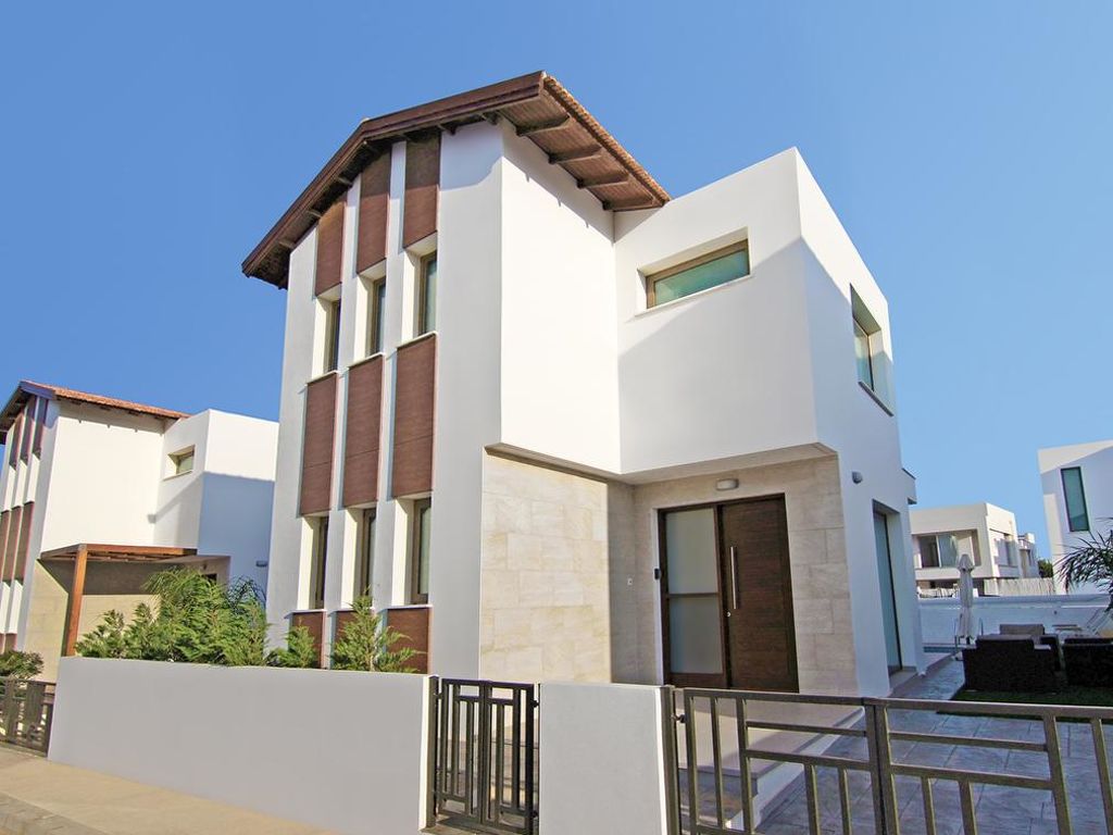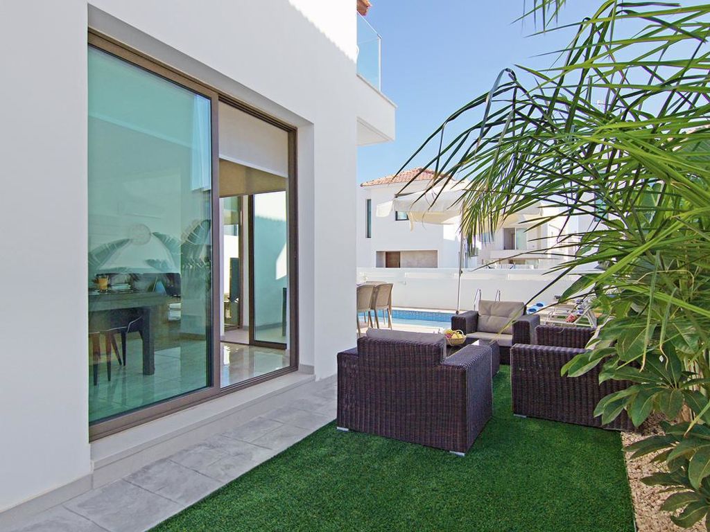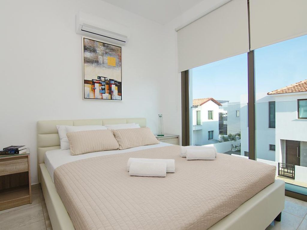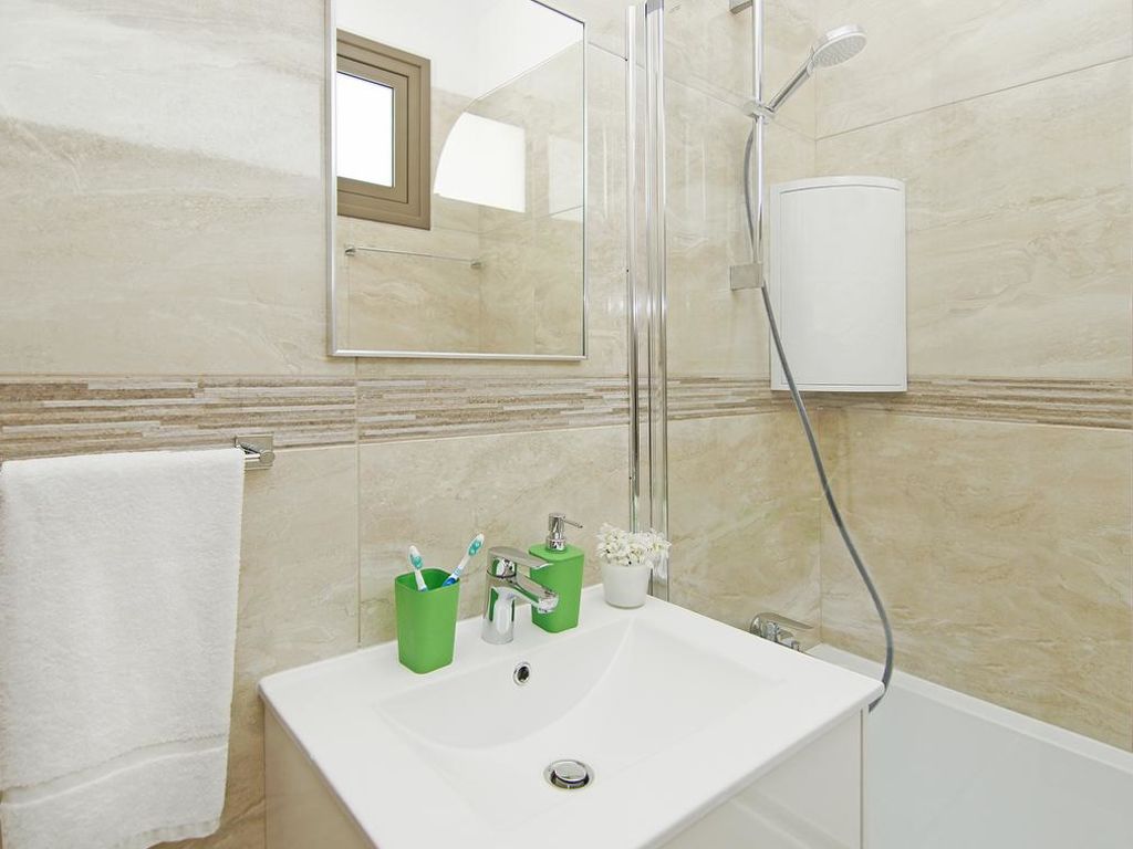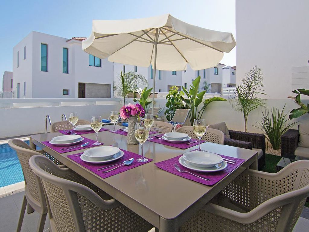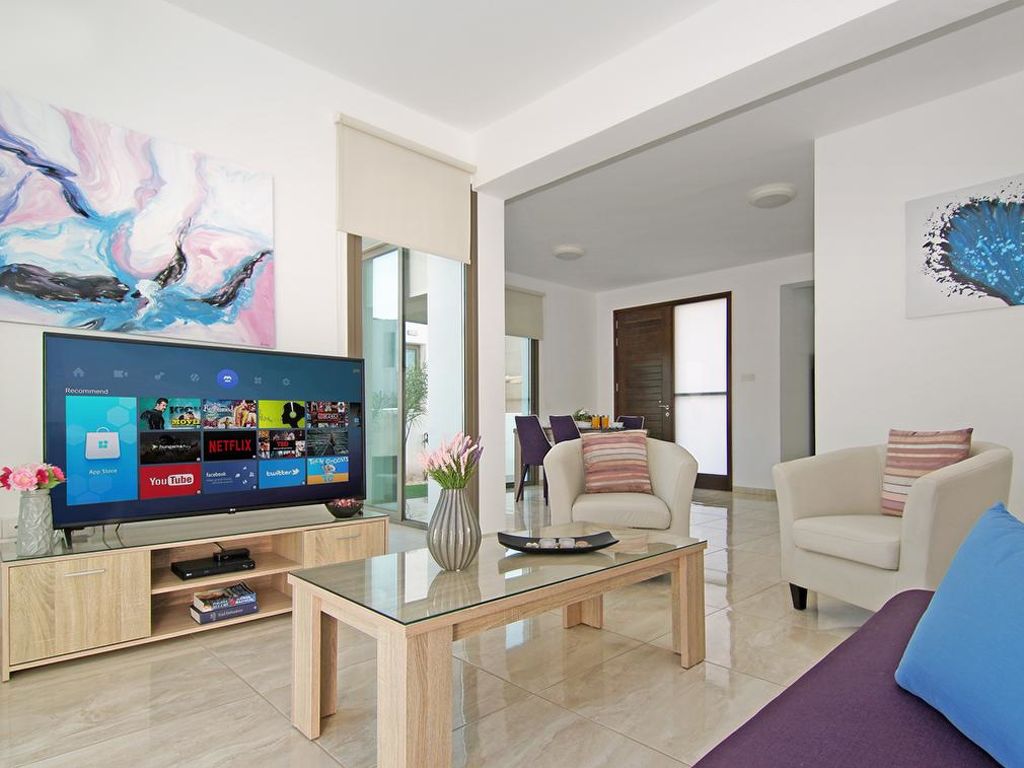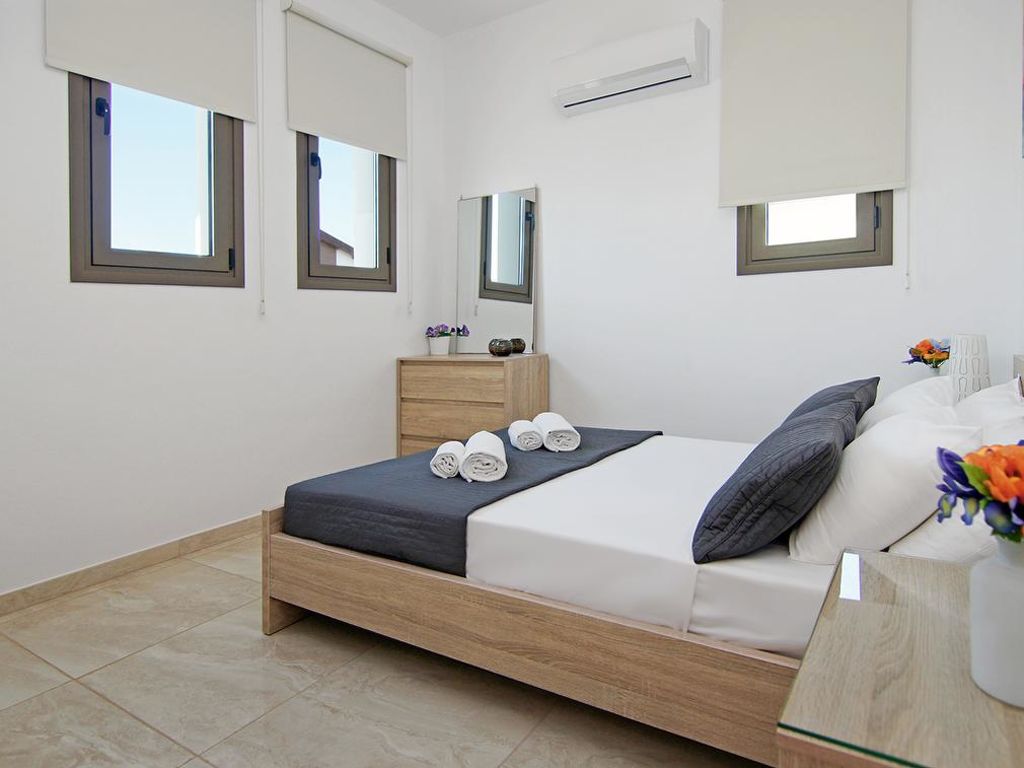 Moderne Villa "ATLEV43". Hausausstattung: Klimaanlage, Waschmaschine (zur Alleinbenutzung). Zufahrt & Parkmöglichkeiten: reservierter Parkplatz. Ganzjährig Zufahrt bis zum Haus möglich. Lage: im Ortszentrum von Ayia Triada, am Ortsrand von Protaras. Umgebung des Hauses: Swimming Pool (zur Alleinbenutzung, Länge 3 m x Breite 6 m), Aussendusche (zur Alleinbenutzung). Infrastruktur und Distanzen: Supermarkt 1 km, Restaurant 1 km, Sandstrand 1.3 km.